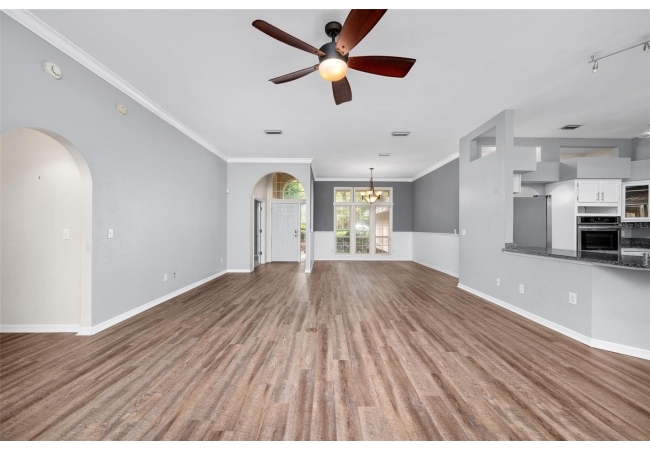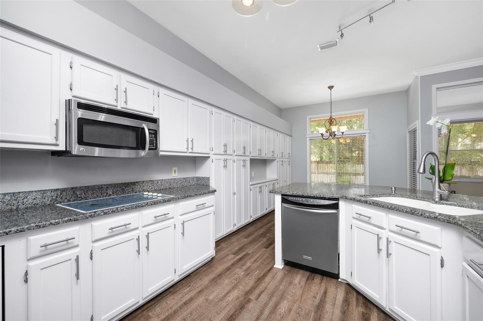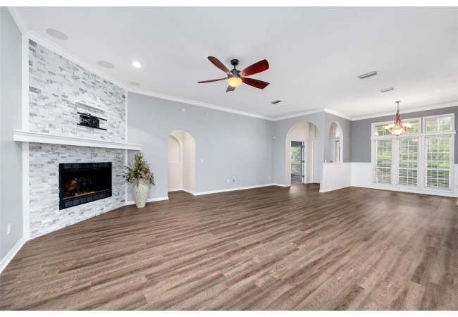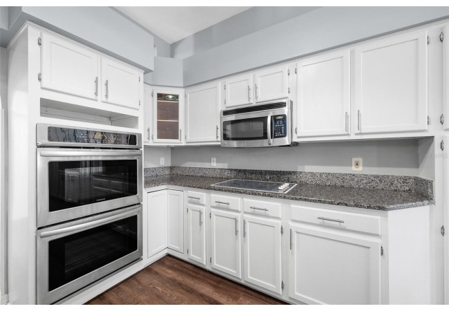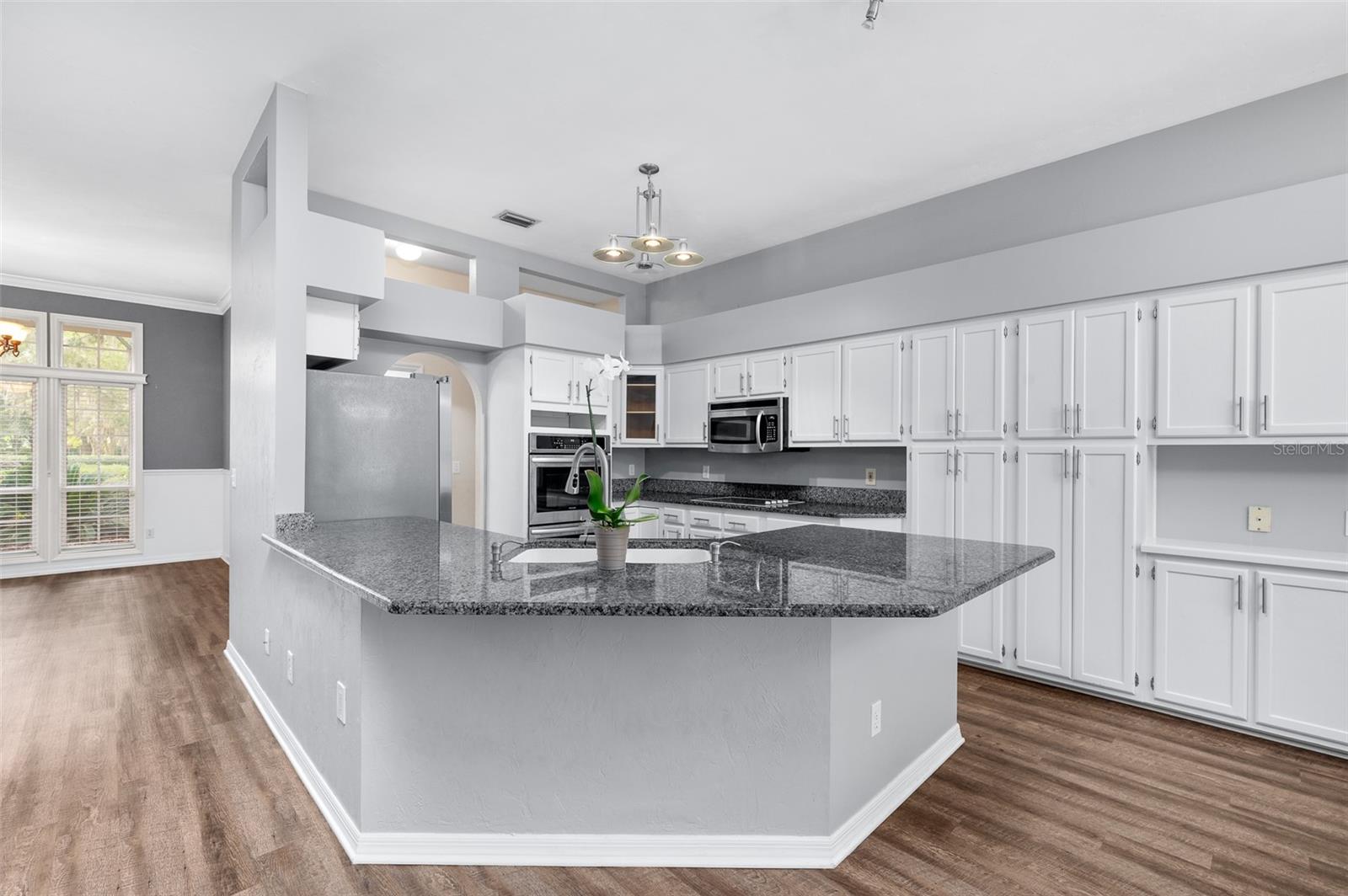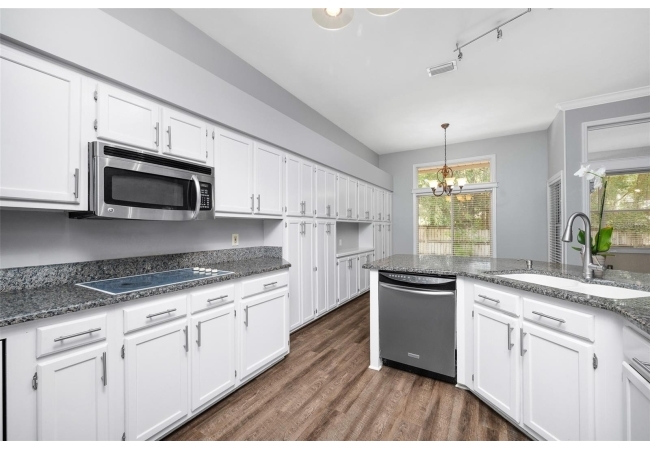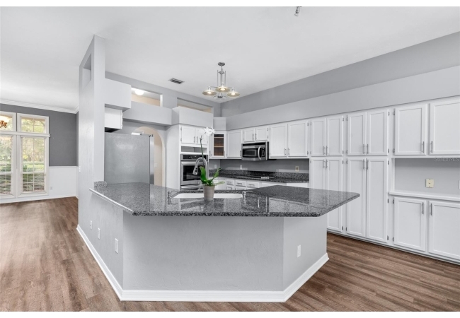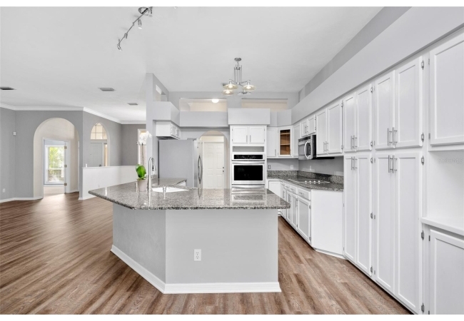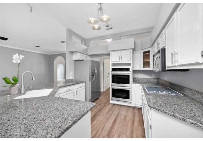 Step inside to discover a spacious and inviting layout featuring high ceilings, a gas fireplace, and French doors leading into the sunroom. The kitchen is highly functional with granite countertops, double oven, a new refrigerator, double sink, breakfast bar seating and ample cabinet space—perfect for everyday cooking or entertaining.
