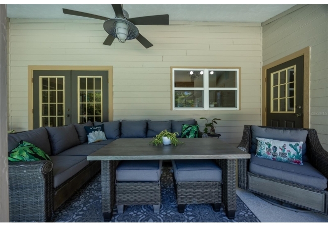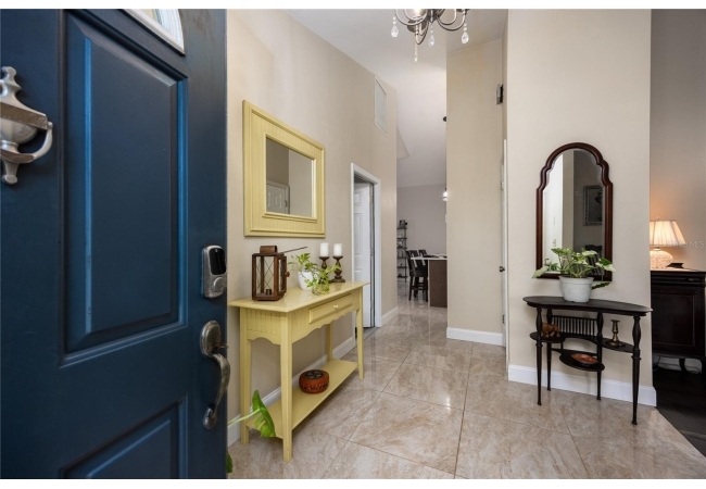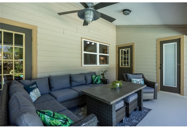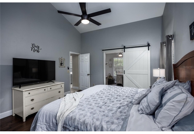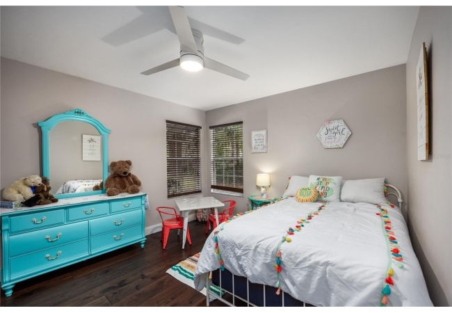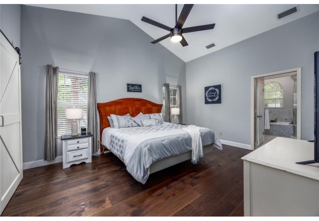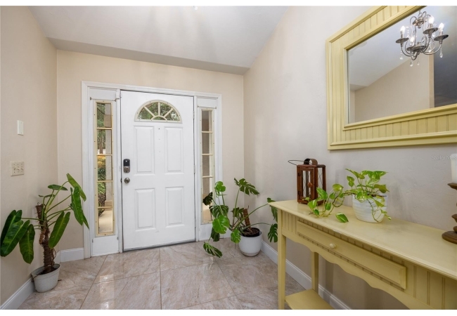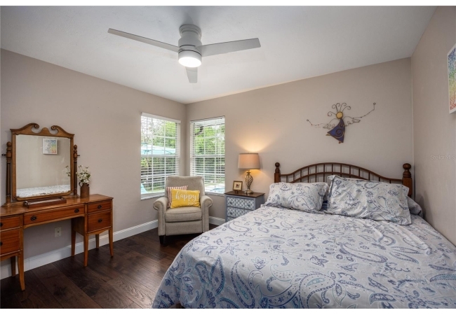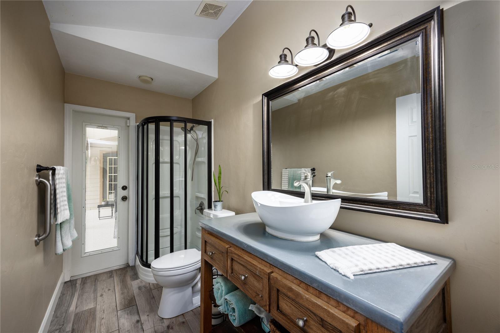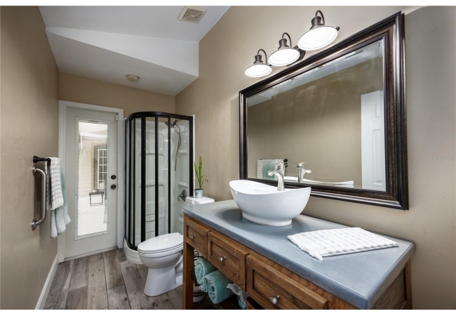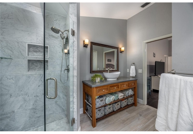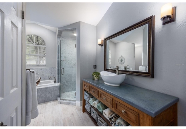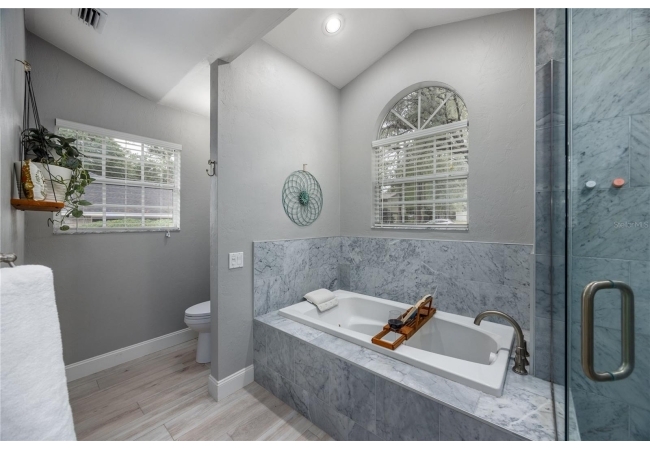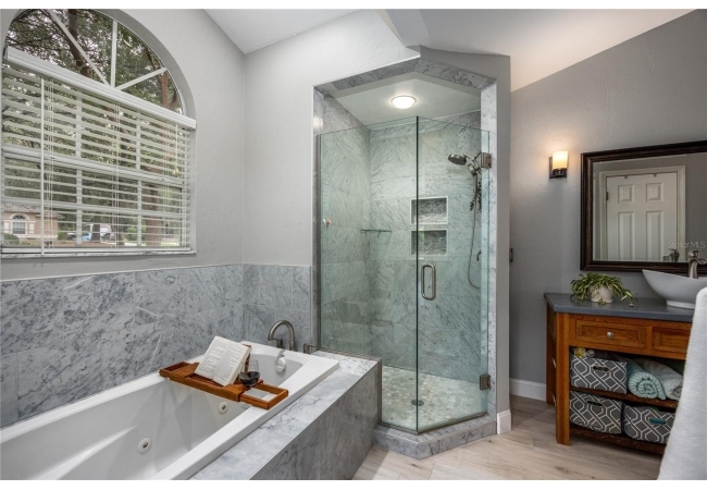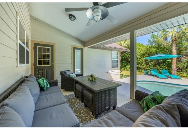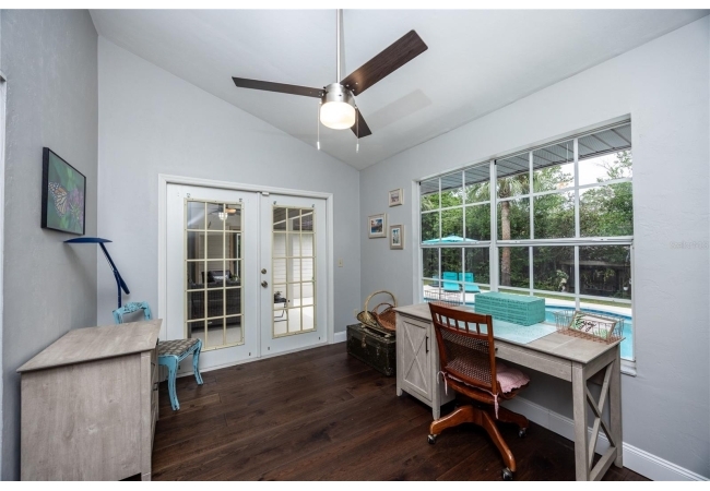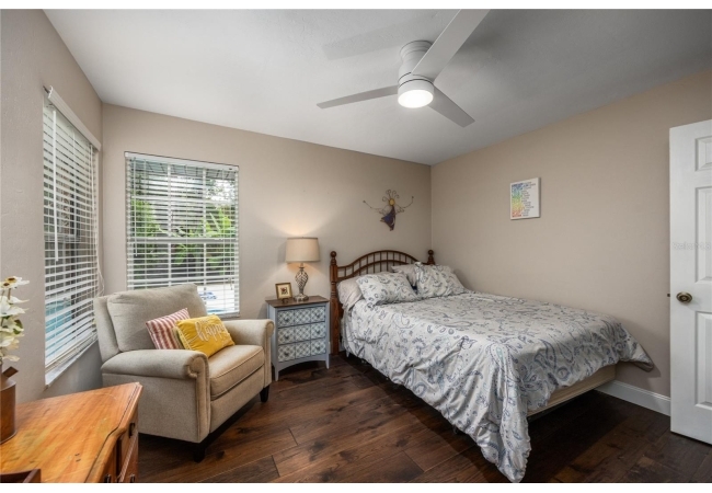 The primary suite includes a remodeled bath with a large tub, separate shower, and new vanity, along with a bonus room on the north side overlooking the pool—perfect for a home office, nursery, workout room, or reading nook. The split floor plan provides privacy for the guest bedrooms, and the guest bath opens directly to the pool for convenience.