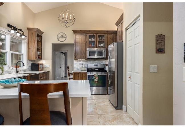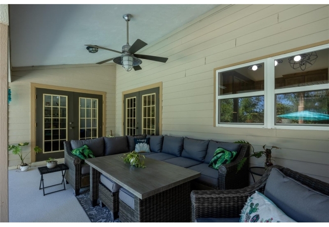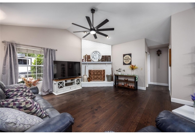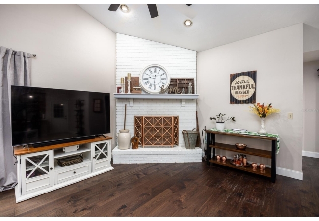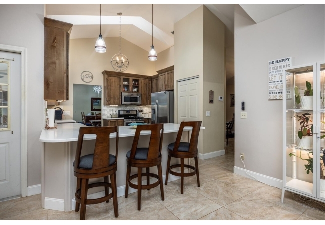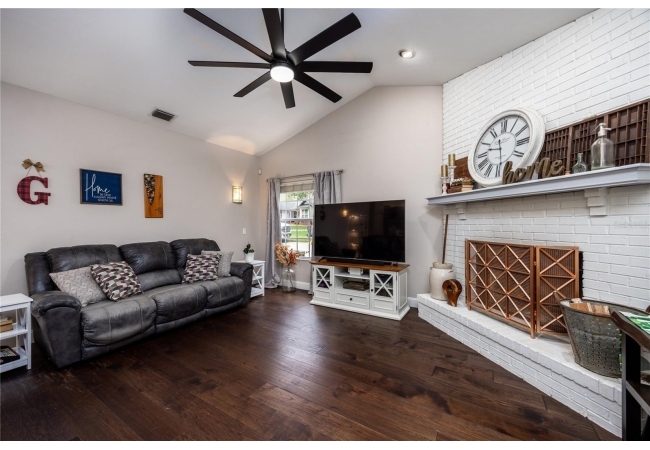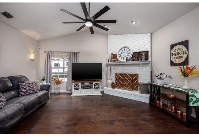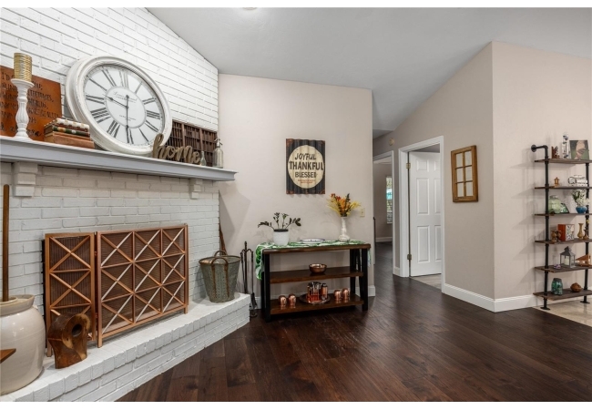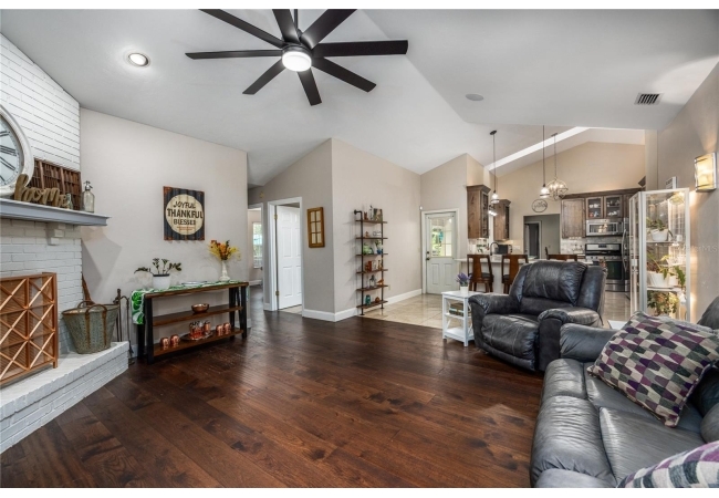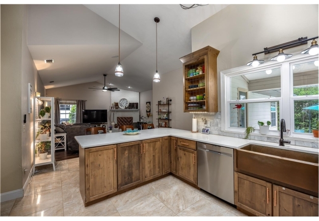 Inside, you’ll find an inviting floor plan with hardwood floors, vaulted ceilings, and multiple living areas that flow easily for entertaining. The upgraded kitchen features a gas stove, new countertops and cabinets, stainless steel appliances, and a charming pool view right above the sink. The living room, anchored by a cozy fireplace, is perfect for relaxing or gathering with friends, while the formal dining room features French doors that open onto the patio and pool area for effortless indoor-outdoor living.