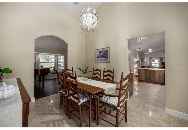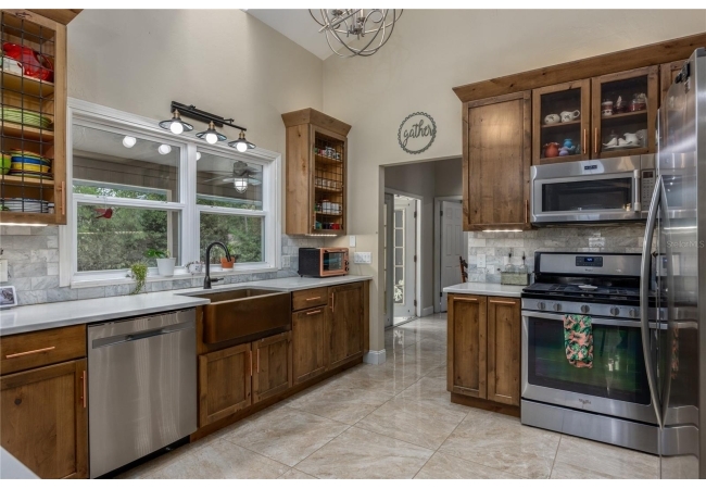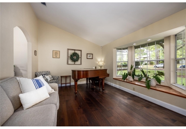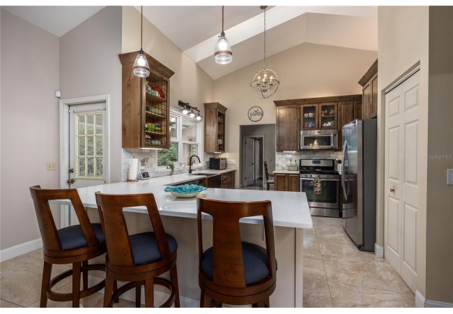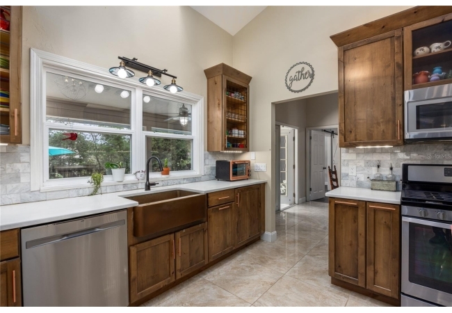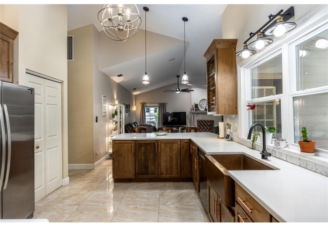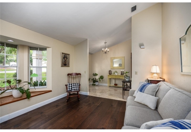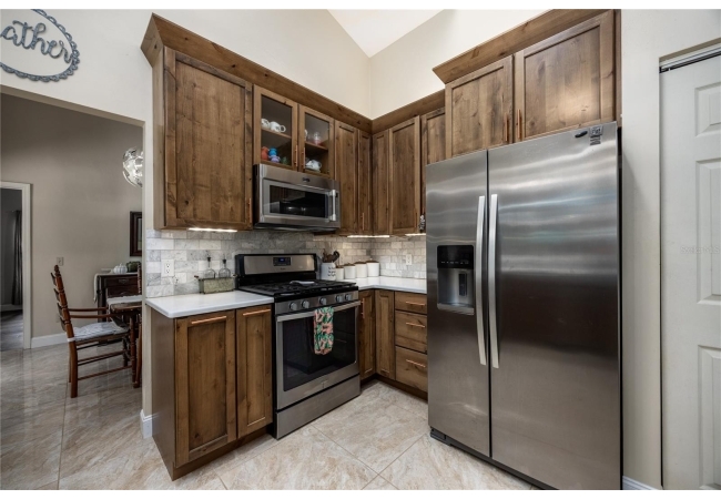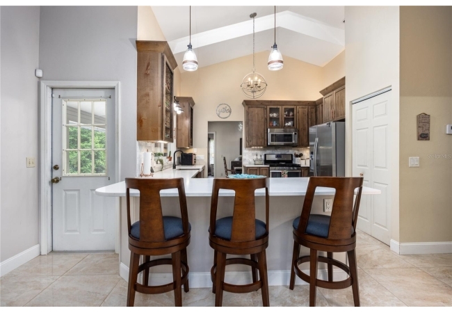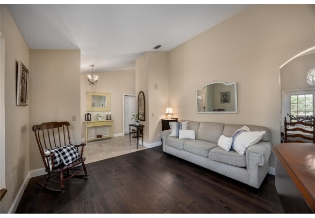 Inside, you’ll find an inviting floor plan with hardwood floors, vaulted ceilings, and multiple living areas that flow easily for entertaining. The upgraded kitchen features a gas stove, new countertops and cabinets, stainless steel appliances, and a charming pool view right above the sink. The living room, anchored by a cozy fireplace, is perfect for relaxing or gathering with friends, while the formal dining room features French doors that open onto the patio and pool area for effortless indoor-outdoor living.