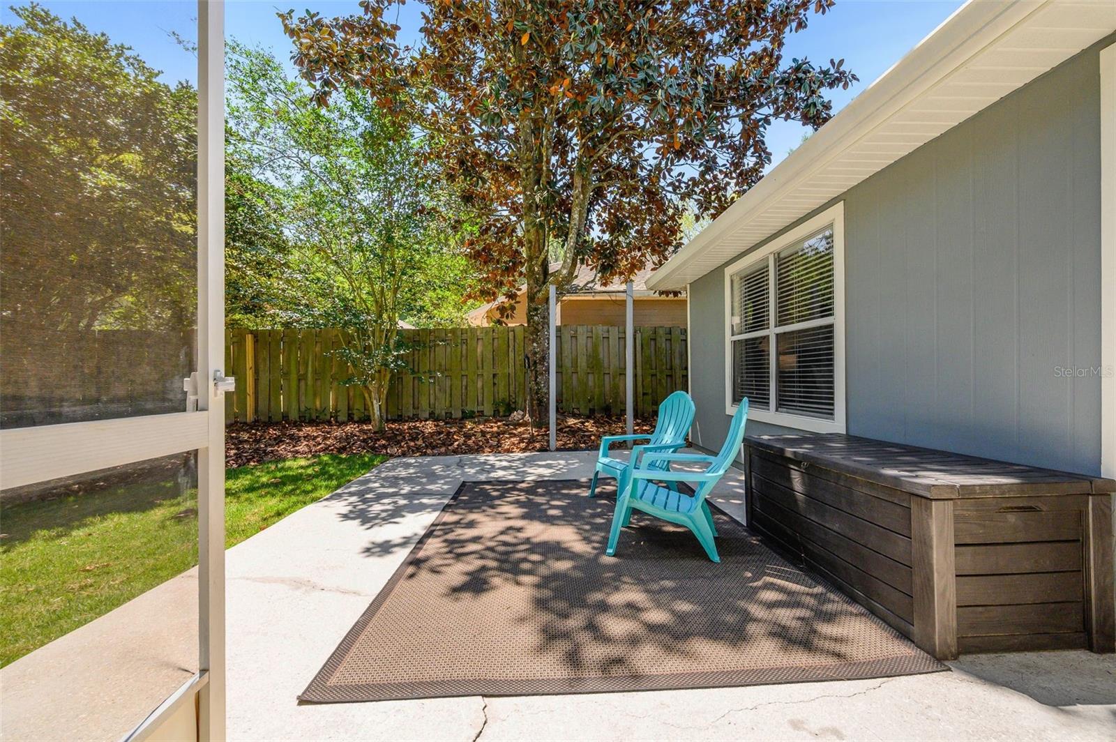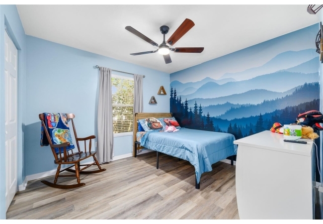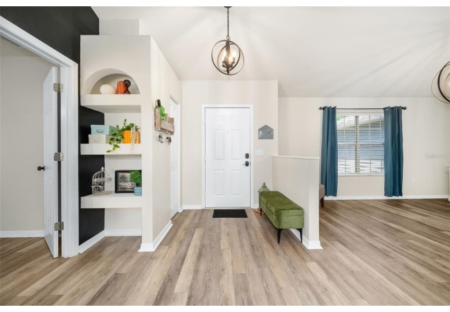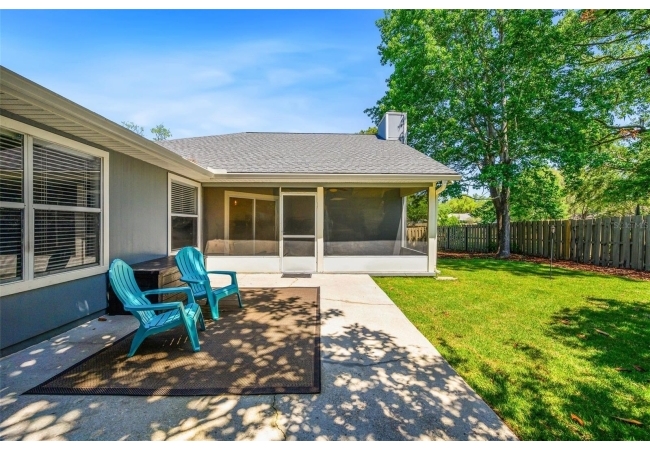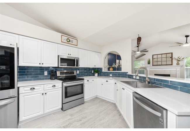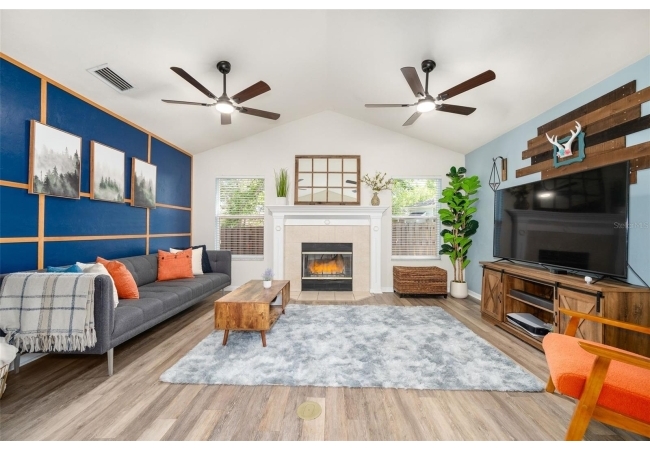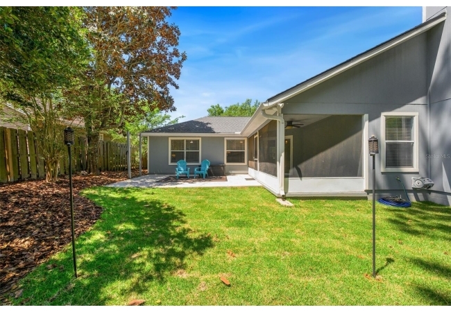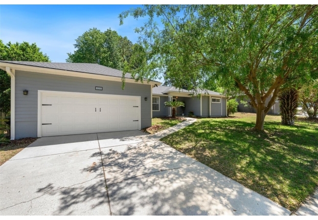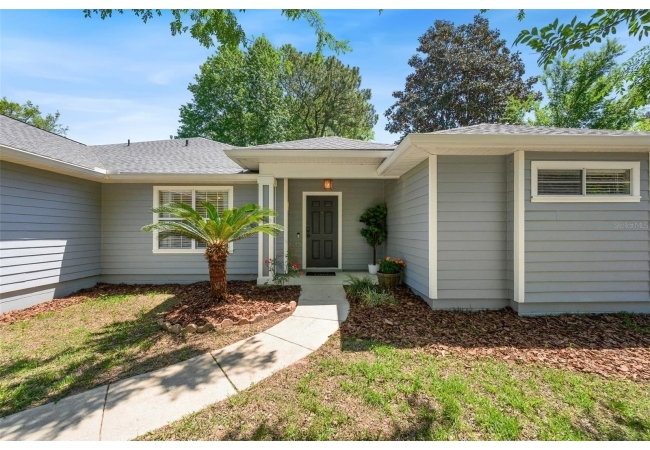 Looking for a fully renovated home in a great neighborhood with top-rated schools at a great price? Welcome to this beautifully updated 4-bedroom, 2-bath home in the highly desirable Eagle Point neighborhood, just a short walk to Hidden Oak Elementary. This move-in ready home has been thoughtfully upgraded throughout, including a newer roof (2024) and stylish finishes in every room. The fully remodeled kitchen features gorgeous quartz countertops, a ceramic subway tile backsplash, new tile flooring, and ample workspace—perfect for both everyday living and entertaining. Enjoy a spacious split floorplan with the primary suite tucked away for added privacy. The completely renovated primary bathroom offers a spa-like retreat with double vanities, a walk-in shower, jetted tub, and walk-in closet. The home boasts luxury vinyl flooring throughout with beautiful tile in the kitchen and bathrooms—no carpet anywhere. Multiple living and dining spaces include a formal dining room with a charming coffee bar and cozy reading nook, a breakfast nook, and a bright living room with a cozy wood-burning fireplace and large windows overlooking the backyard. Step outside to a screened-in patio with fresh tile, perfect for relaxing or entertaining. The fully fenced yard has been refreshed with new sod and mulch and backs up to a peaceful neighborhood green space. Mature trees provide shade and privacy without overhanging the roofline. Additional highlights include an oversized two-car garage, fiber optic internet availability, and a central location with convenient access to shopping, dining, and I-75. Ideally situated near the University of Florida, Santa Fe College, Shands Hospital, North Florida Regional Medical Center, the VA Hospital, and just minutes from the popular Town of Tioga. As a fun bonus, this neighborhood is a fun, festive spot come Halloween. This home has been meticulously maintained and is truly move-in ready—don’t miss your opportunity to make it yours!