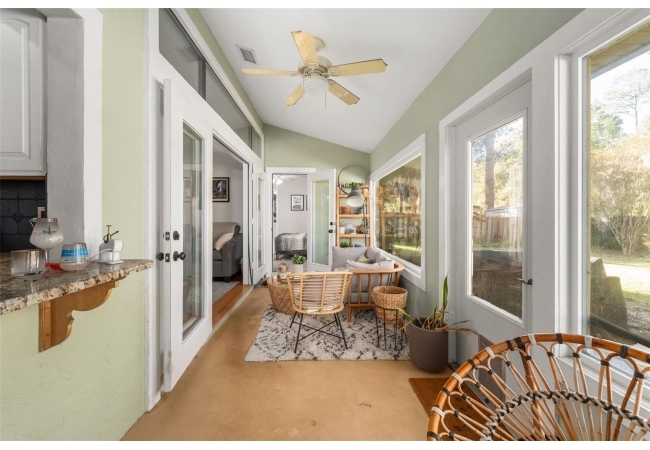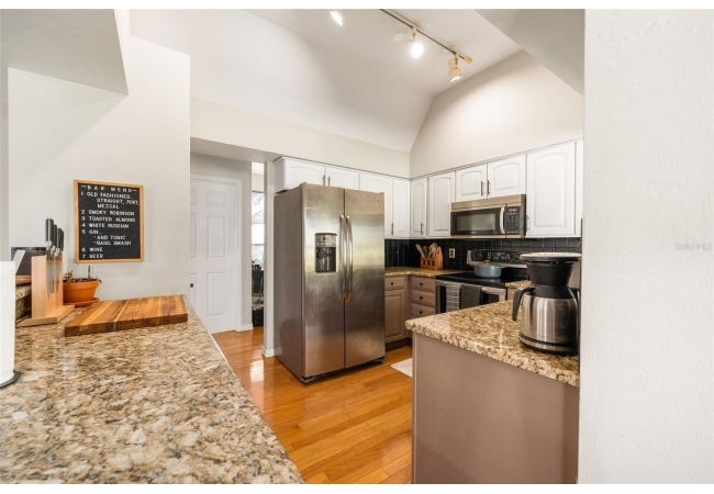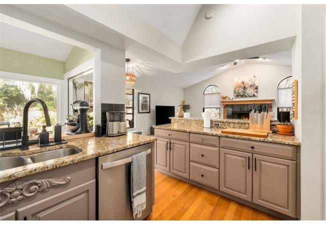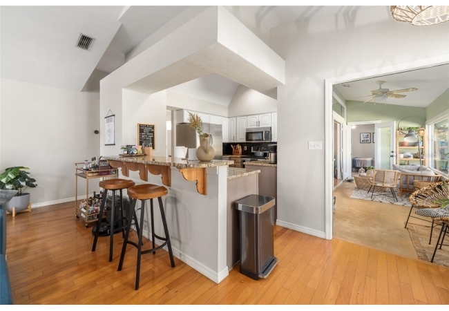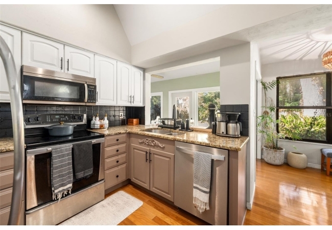 The kitchen is both practical and inviting, with granite countertops, a tile backsplash, stainless steel appliances, and custom pull-out shelves that make organizing easy. The breakfast bar looks out to the sunroom — the perfect spot for your morning coffee or game nights with friends.
