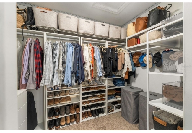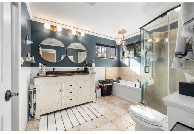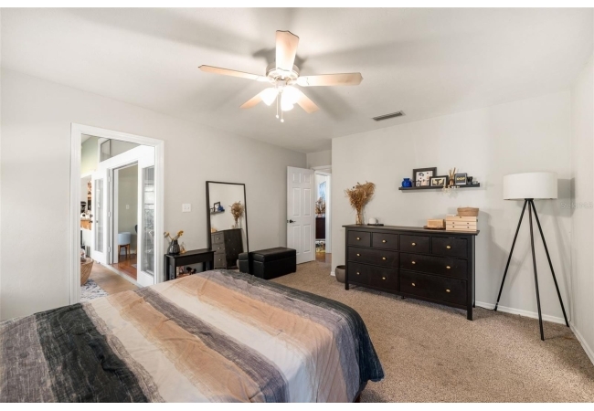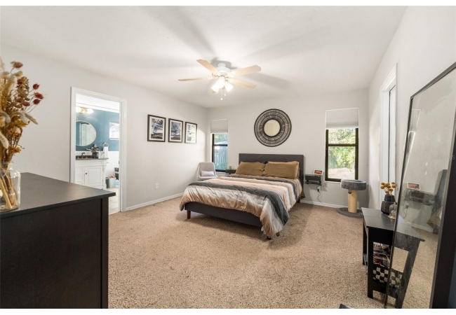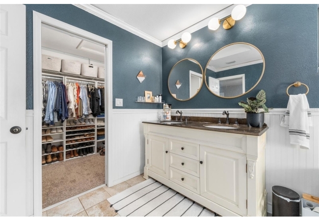Down the hall, behind a pocket door, you’ll find all the bedrooms tucked away for privacy. The hallway offers plenty of closet storage along the way. The primary bedroom is spacious enough for a king-size bed and features a large ensuite bathroom with double sinks, a soaking tub, walk-in shower, and a roomy closet with custom shelving plus a skylight and decorative bead board. Both guest bedrooms have ceiling fans, and the hall bath includes a tub/shower combo, a new toilet, and a linen closet.