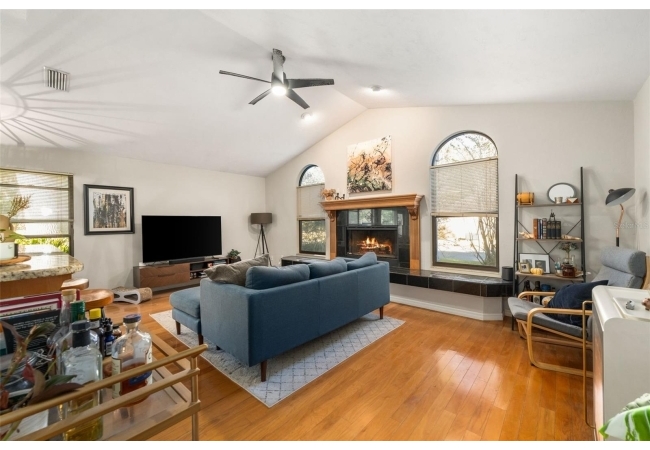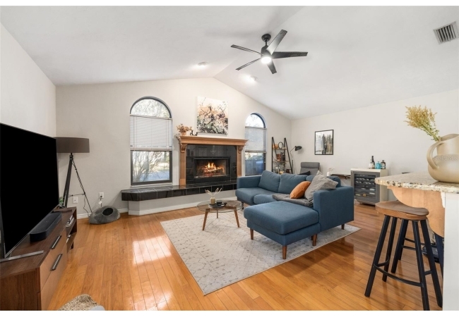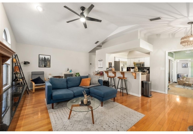 The living room features a wood burning fireplace and opens up into the kitchen, making it easy to gather with friends or spread out when you want a little quiet time.