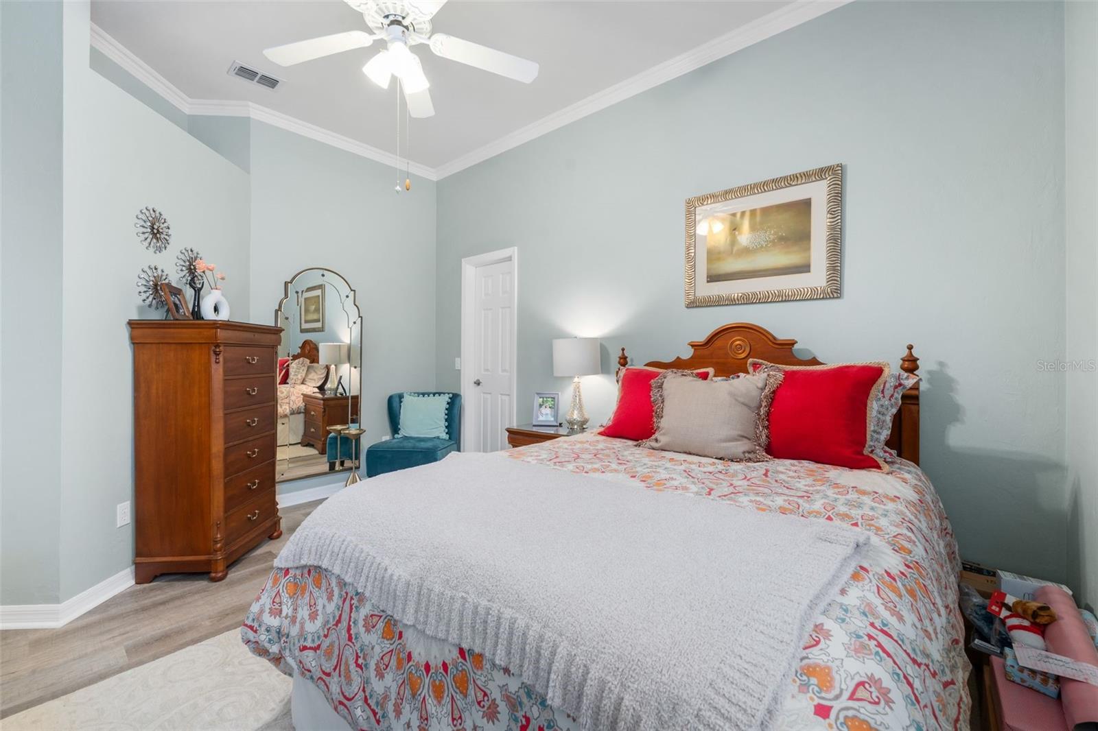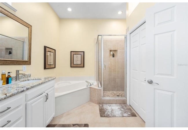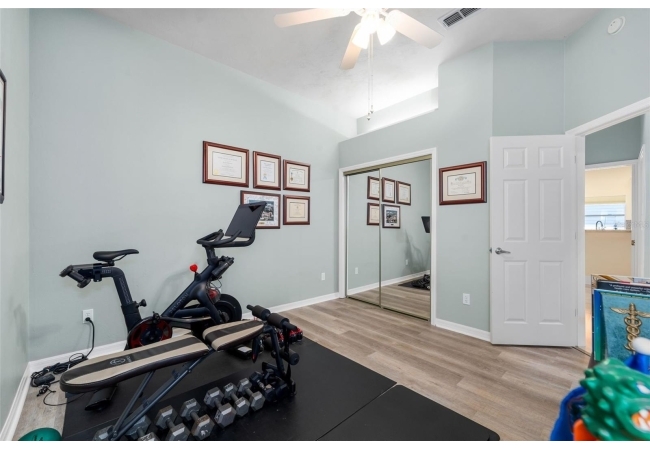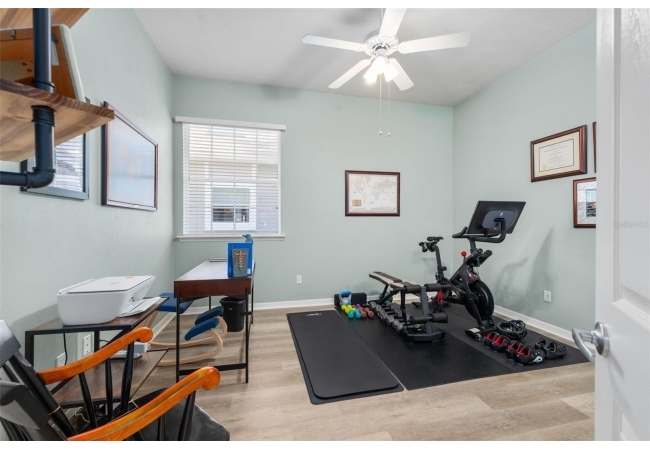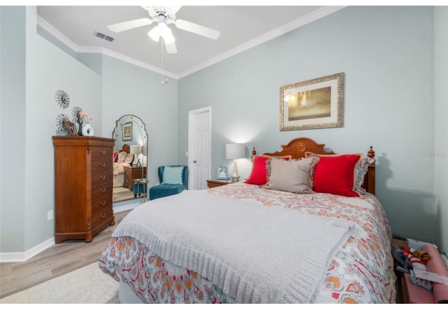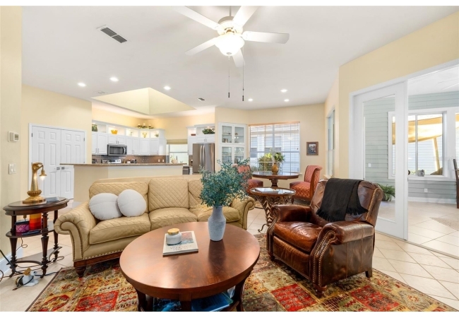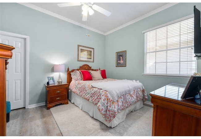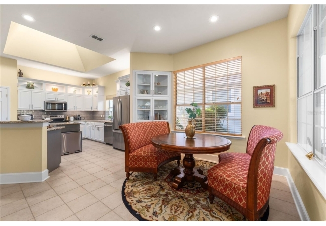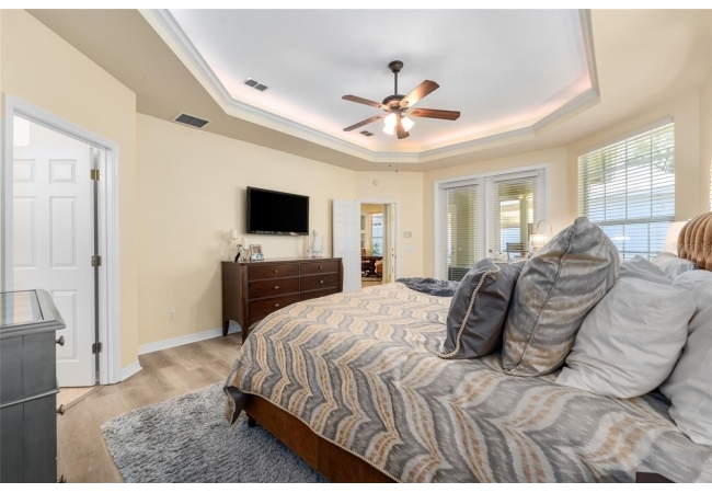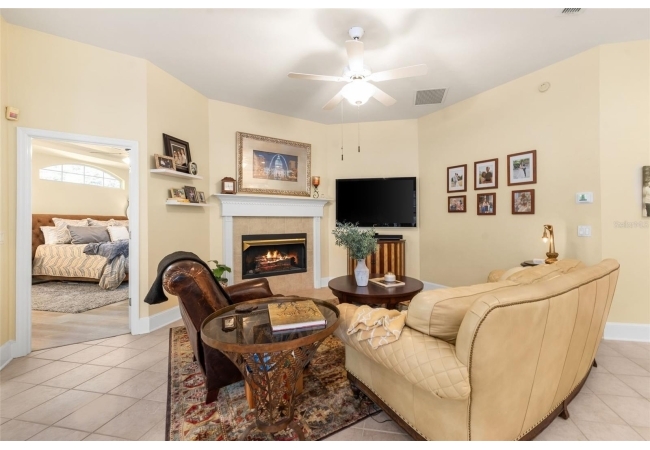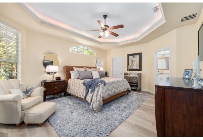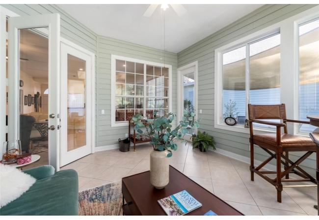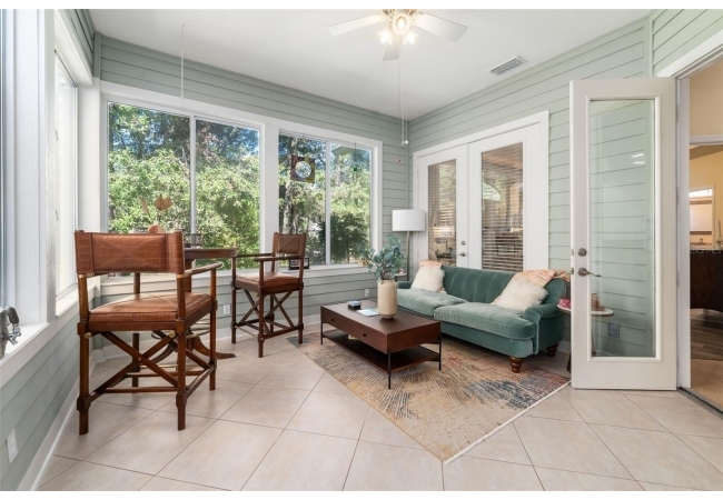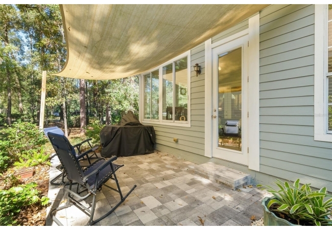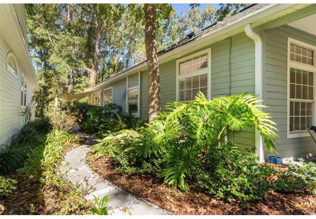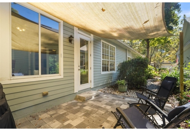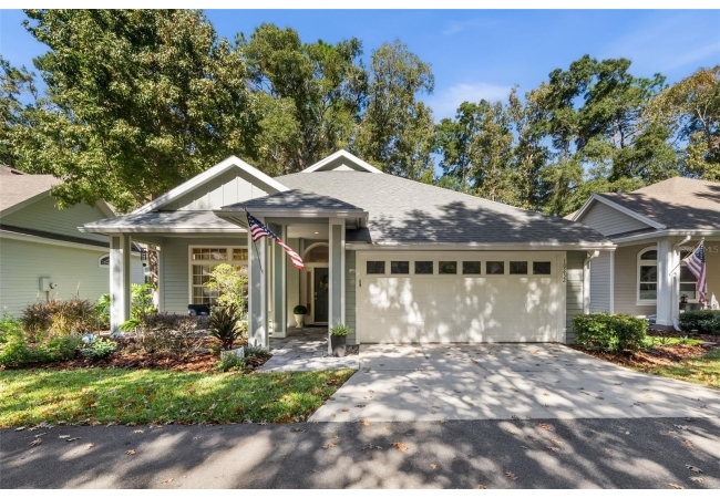Enjoy the sunroom overlooking the golf course and common green space, a peaceful retreat filled with natural light. The spacious primary suite features tray ceilings, crown molding, rope lighting, and plenty of room for a cozy reading nook. The updated primary bath offers dual vanities, granite counters, a garden tub, and a walk-in shower. Two additional bedrooms include a guest suite with walk-in closet and another guest room with a shared updated bath. Throughout the home you’ll find no carpet, new luxury vinyl plank flooring, fresh interior paint, updated bath vanities, tall baseboards, window blinds, paver patio, gutters, and a new 2024 HVAC system as other features. The HOA maintains the front yard for a low-maintenance lifestyle, and the location is unbeatable—walk or bike to Haile Village Center or the Hawkstone Country Club. Skip and hop through Haile's miles of trails. This home is a short distance to the University of Florida, UF Health/Shands, HCA Florida Healthcare, Celebration Pointe, Butler Plaza, I-75 corridor and more! Call today!