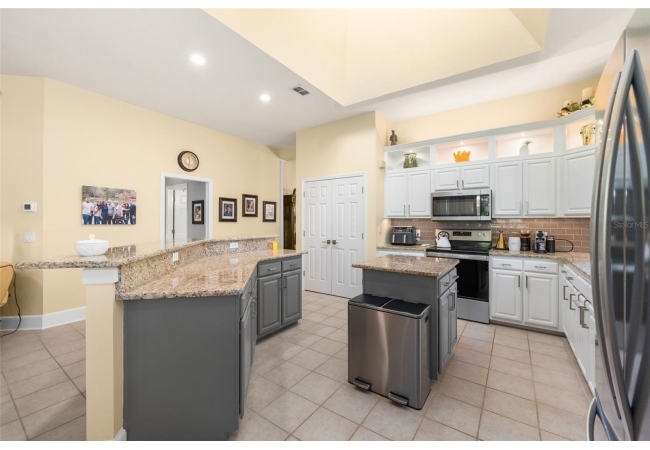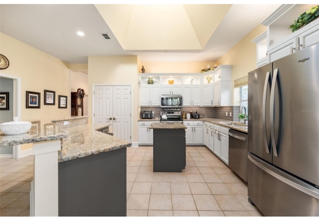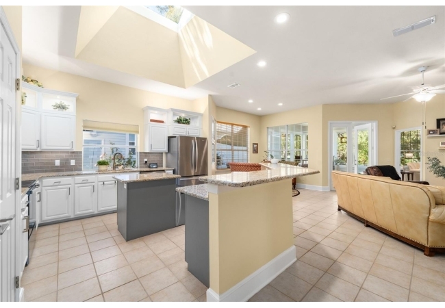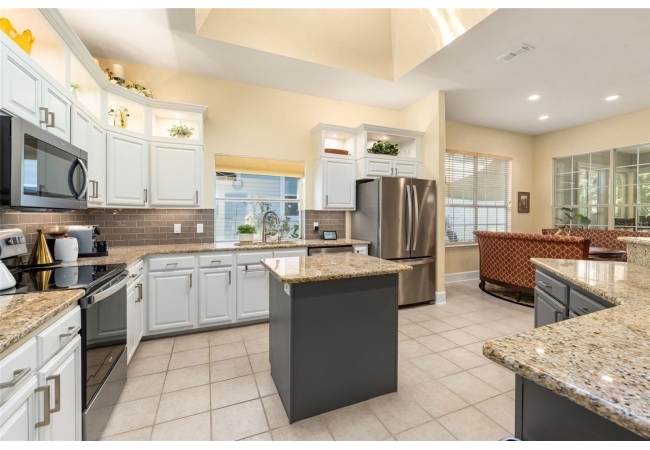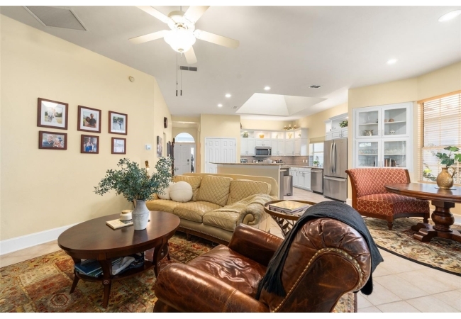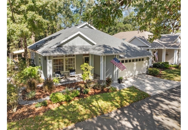 Just hitting the market — this beautiful Haile Plantation home in Chickasaw Way backs directly to the 7th fairway of Hawkstone Country Club, offering golf course views and true Gainesville luxury living. With nearly 2,100 sq. ft. of heated and cooled space, this upgraded residence features a thoughtfully designed split floor plan, high ceilings, and Jeffrey M. Wilde’s signature sunroof design for natural light throughout. Step inside from the private lane and paver-lined front porch to a warm foyer leading to a flex room—perfect as a home office, formal dining room, or music room. The remodeled kitchen is a showstopper with stainless steel appliances, granite countertops, stacked cabinets, large island, backsplash and an open view of the dining area and great room with fireplace—ideal for entertaining and gatherings.