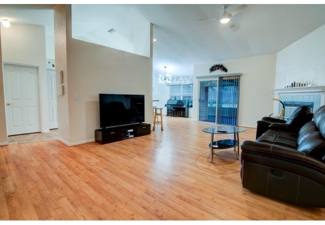 Vaulted ceilings create a bright, open feel, while the layout offers both a separate dining area and a cozy breakfast nook. The kitchen features a functional breakfast bar, perfect for casual dining or entertaining. The spacious primary suite includes a walk-in closet and a well-appointed bathroom with a shower stall, separate soaking tub, and a double vanity.