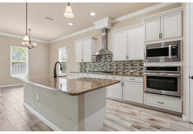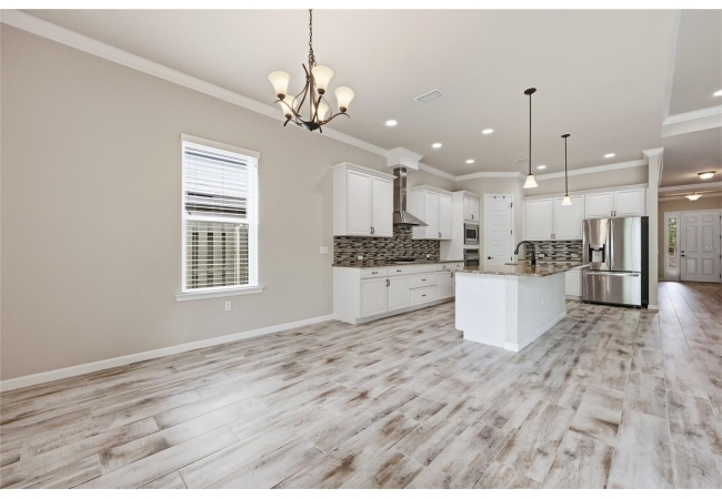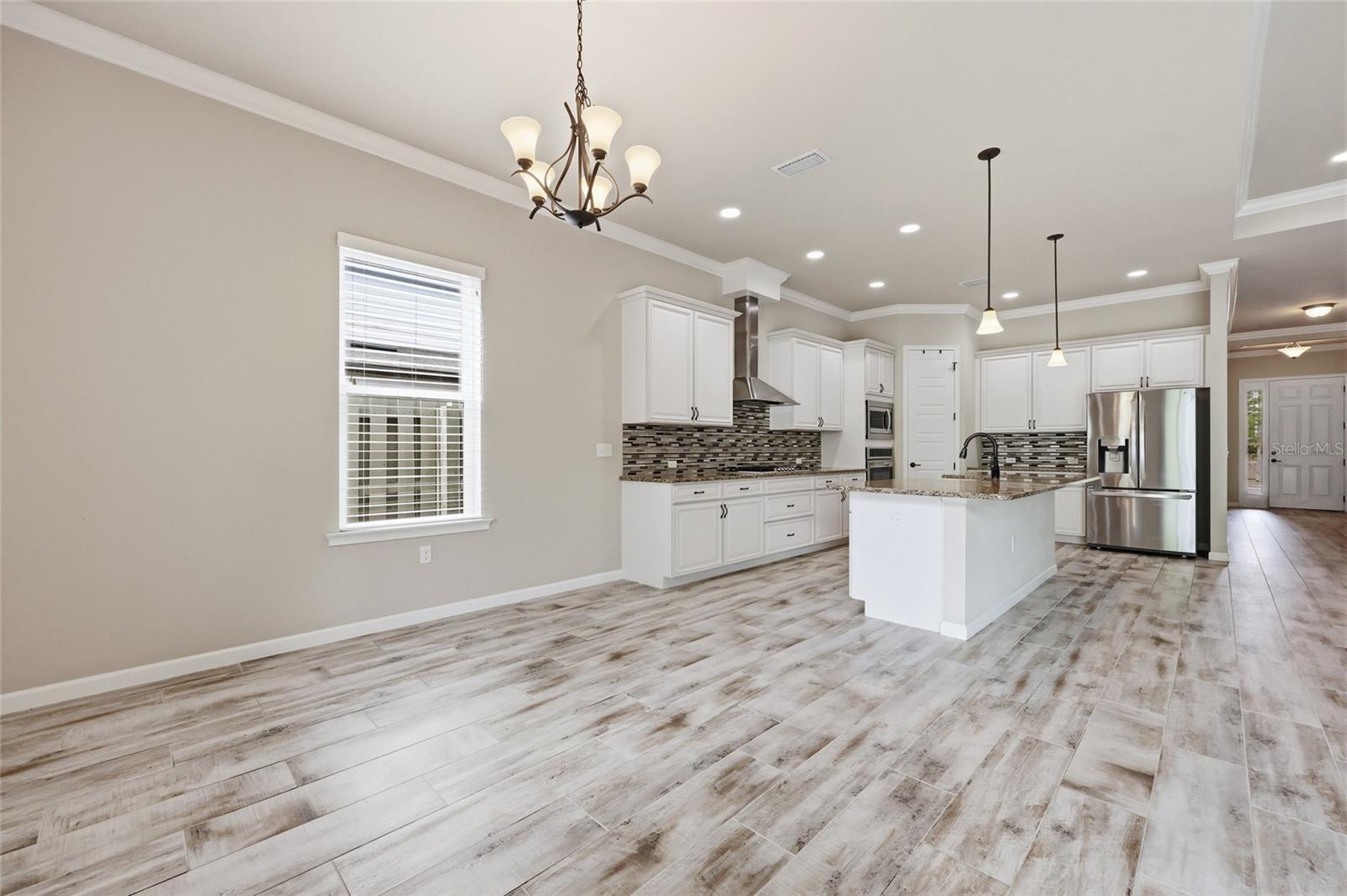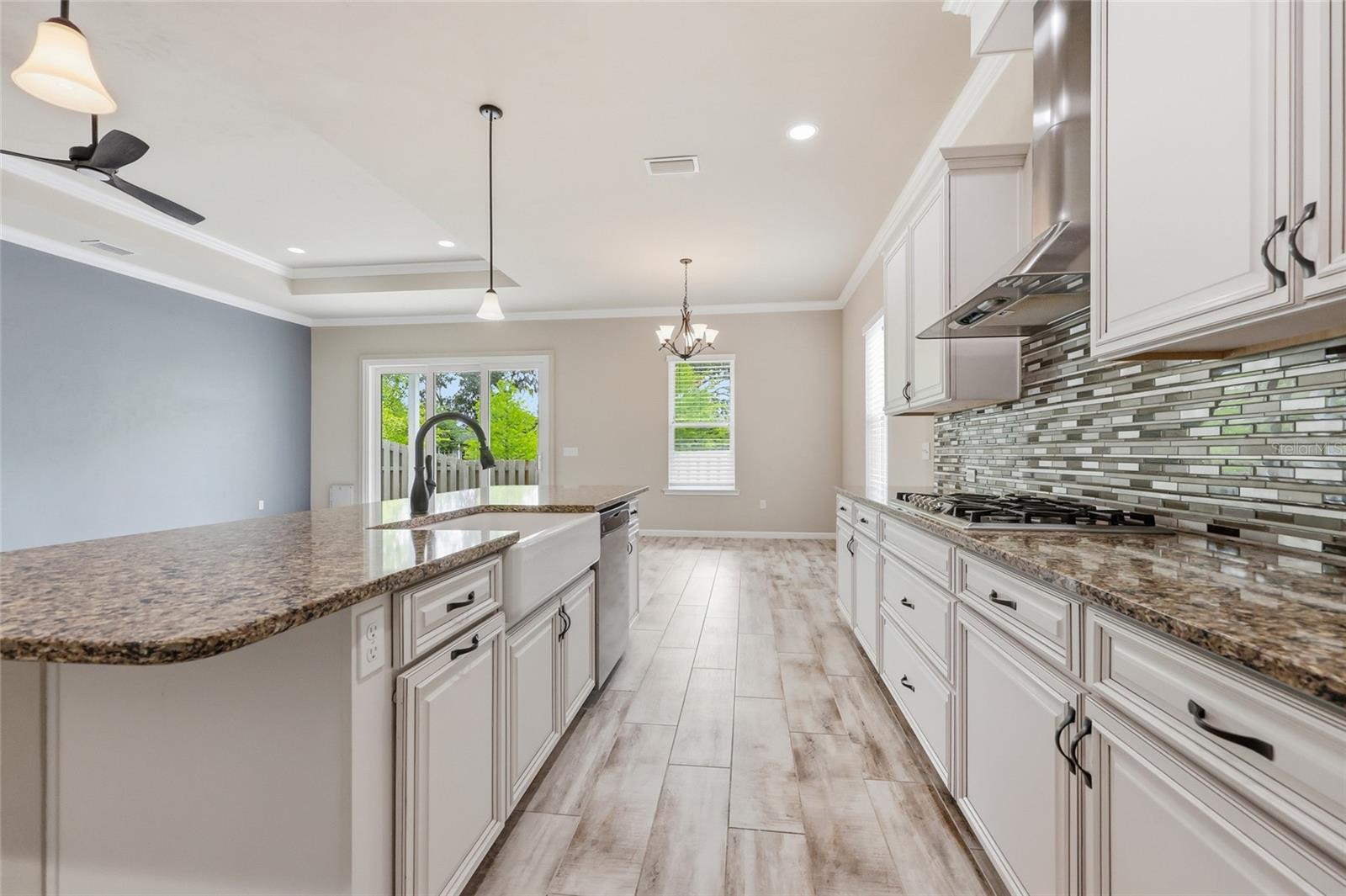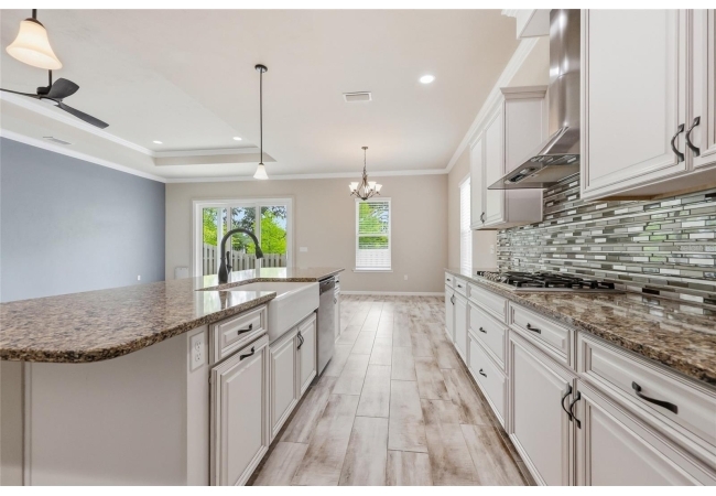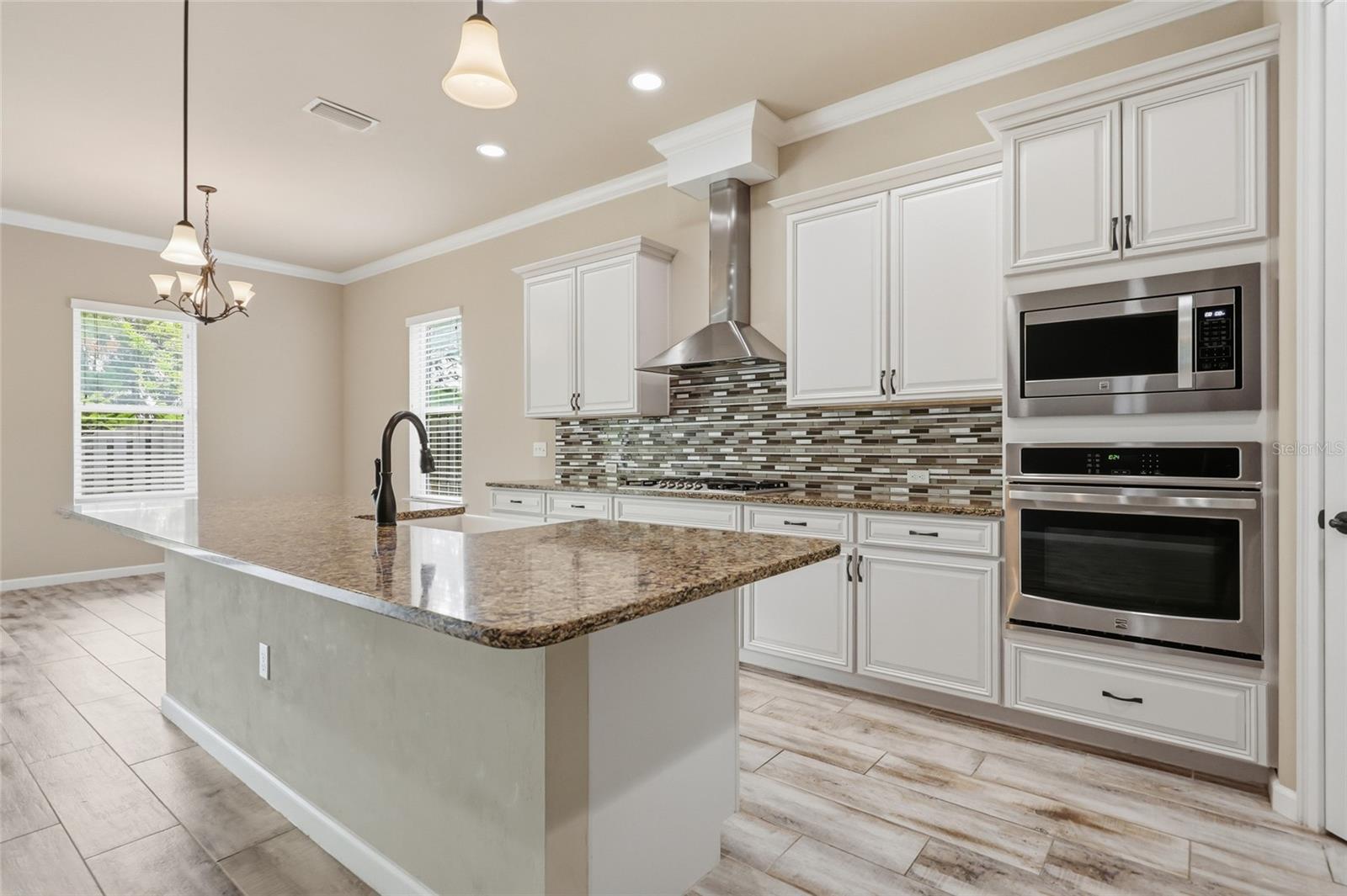 At the heart of the home, an expansive great room brings together the kitchen, living, and dining areas into one cohesive space that feels both open and connected. The chef’s kitchen is designed for everyday living and entertaining, featuring a large island with breakfast bar seating, upgraded solid wood cabinetry, granite countertops, a gas cooktop, abundant prep space, and a walk-in pantry. The adjoining dining area and living room offer generous space to gather, all enhanced by natural light streaming in from multiple windows and sliding glass doors that lead to the covered patio.