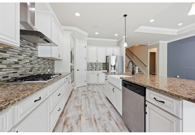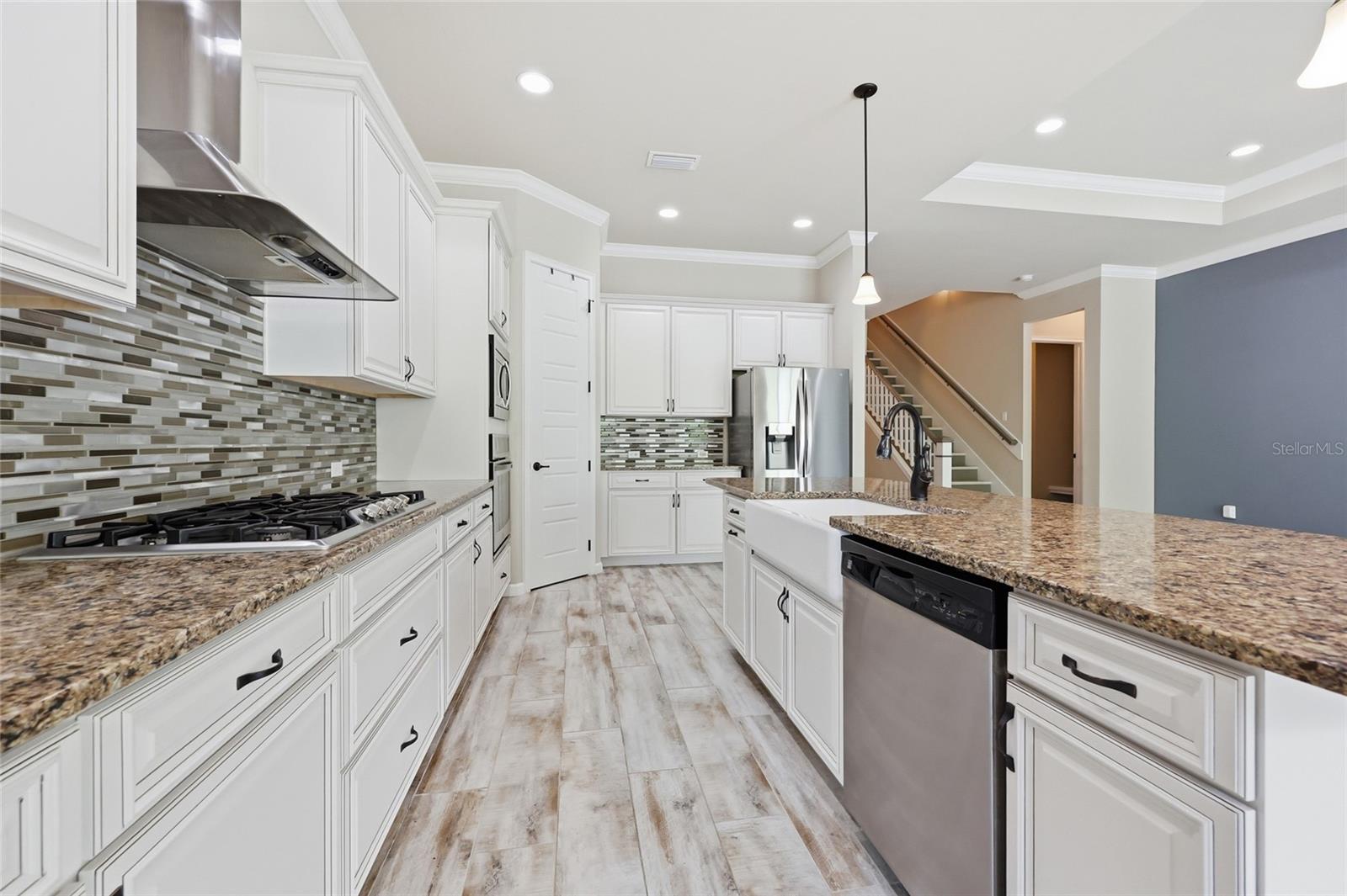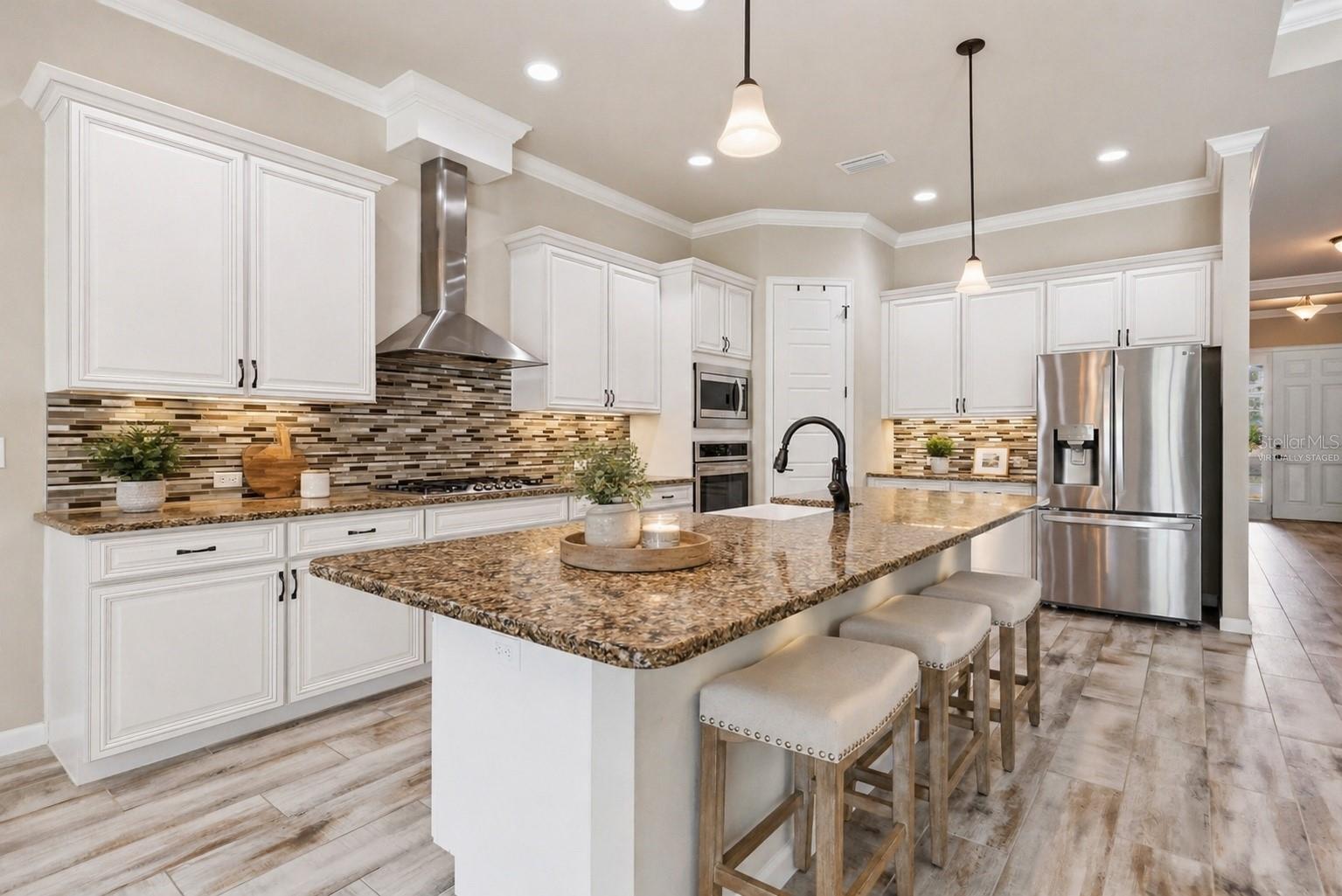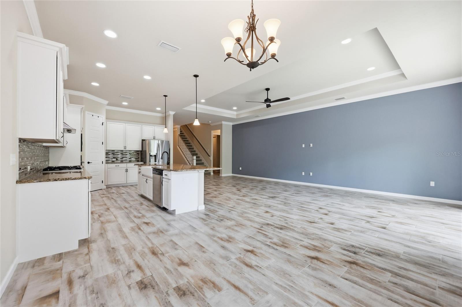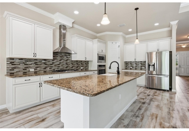 At the heart of the home, an expansive great room brings together the kitchen, living, and dining areas into one cohesive space that feels both open and connected. The chef’s kitchen is designed for everyday living and entertaining, featuring a large island with breakfast bar seating, upgraded solid wood cabinetry, granite countertops, a gas cooktop, abundant prep space, and a walk-in pantry. The adjoining dining area and living room offer generous space to gather, all enhanced by natural light streaming in from multiple windows and sliding glass doors that lead to the covered patio.