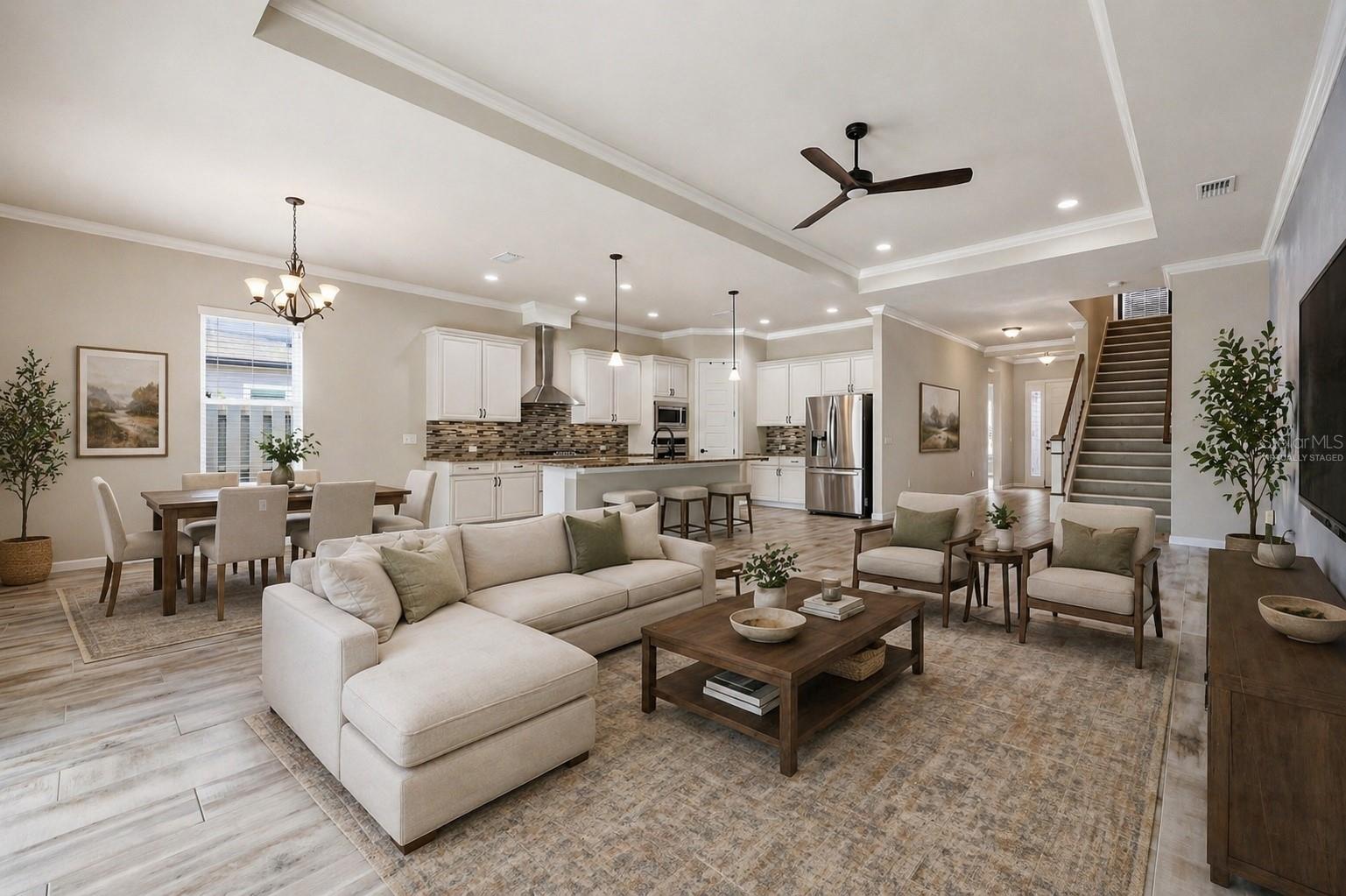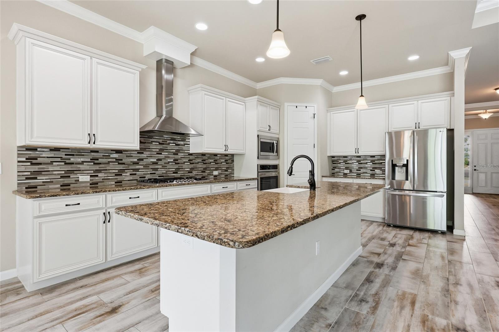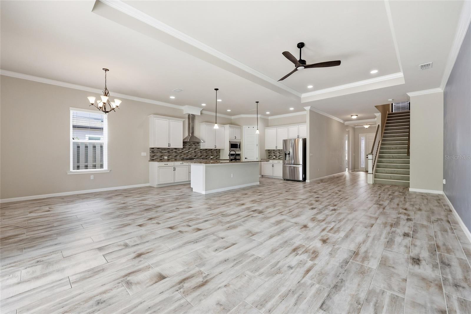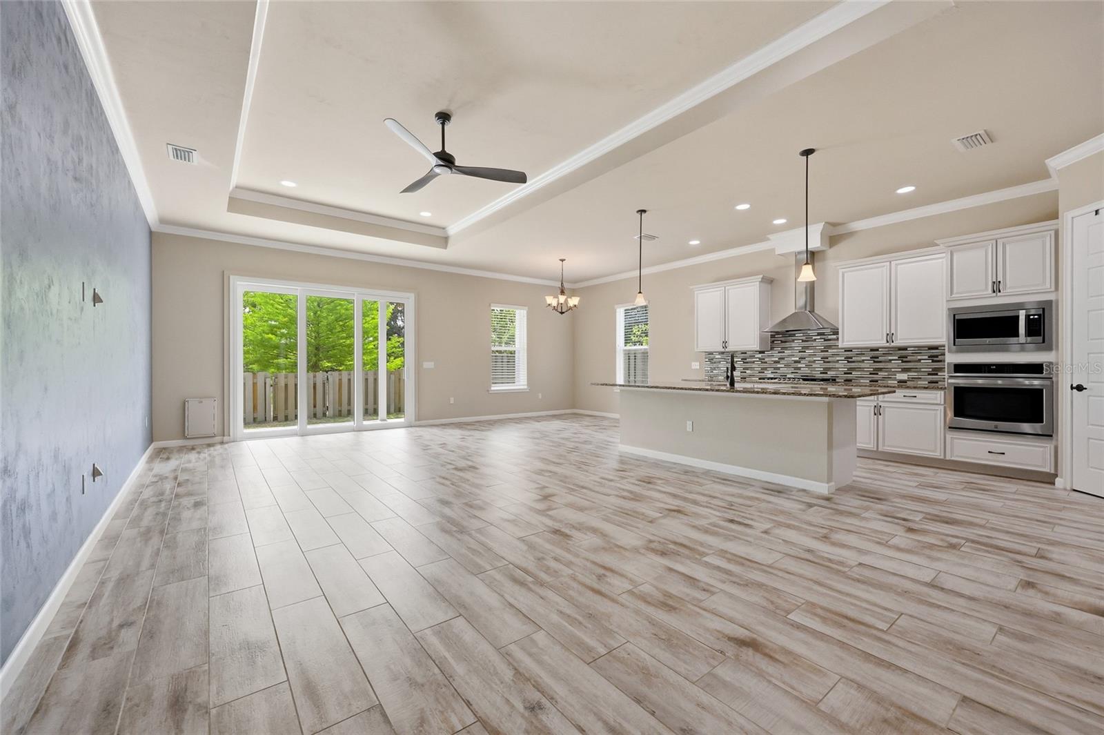 At the heart of the home, an expansive great room brings together the kitchen, living, and dining areas into one cohesive space that feels both open and connected. The chef’s kitchen is designed for everyday living and entertaining, featuring a large island with breakfast bar seating, upgraded solid wood cabinetry, granite countertops, a gas cooktop, abundant prep space, and a walk-in pantry. The adjoining dining area and living room offer generous space to gather, all enhanced by natural light streaming in from multiple windows and sliding glass doors that lead to the covered patio.