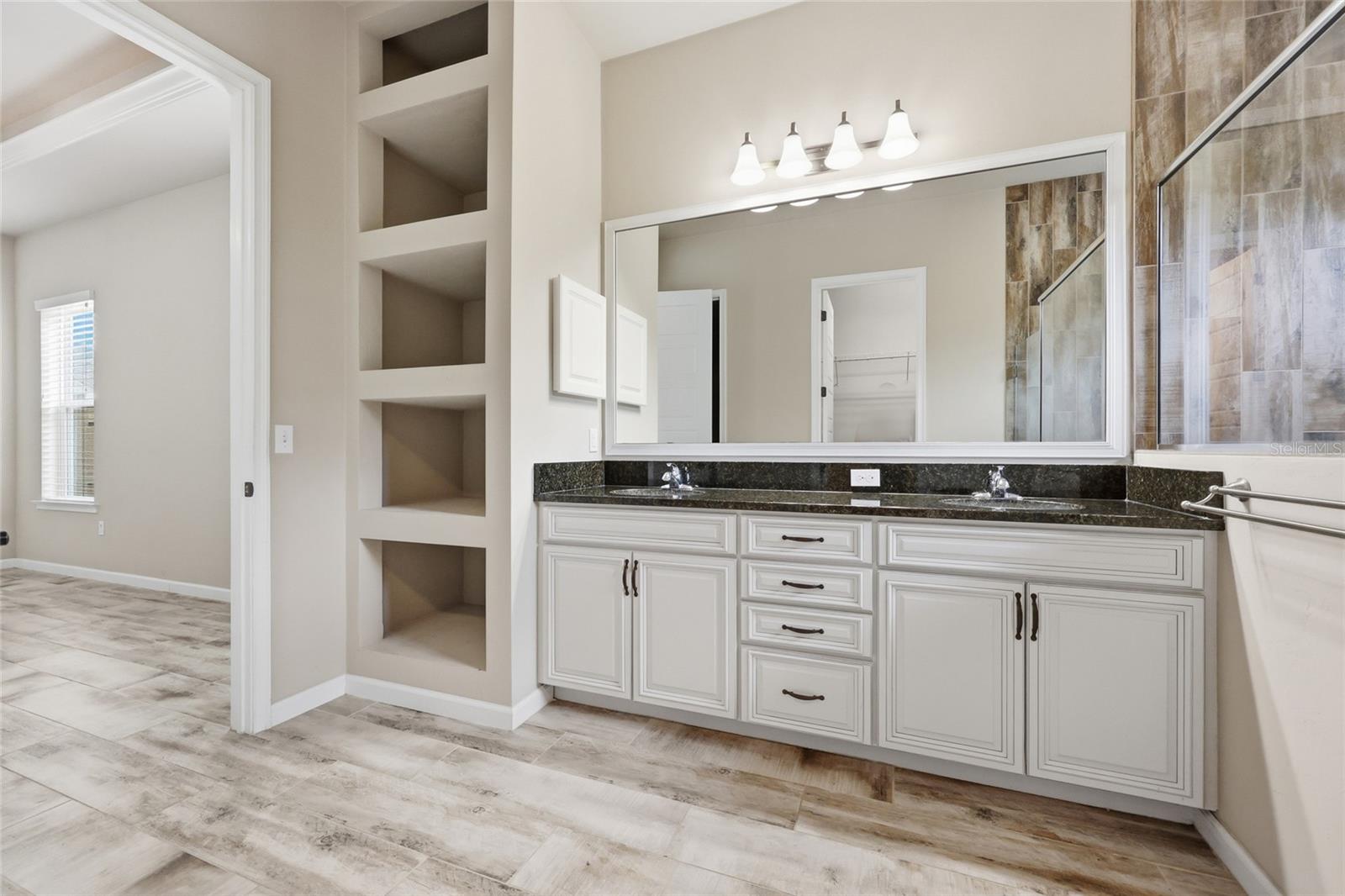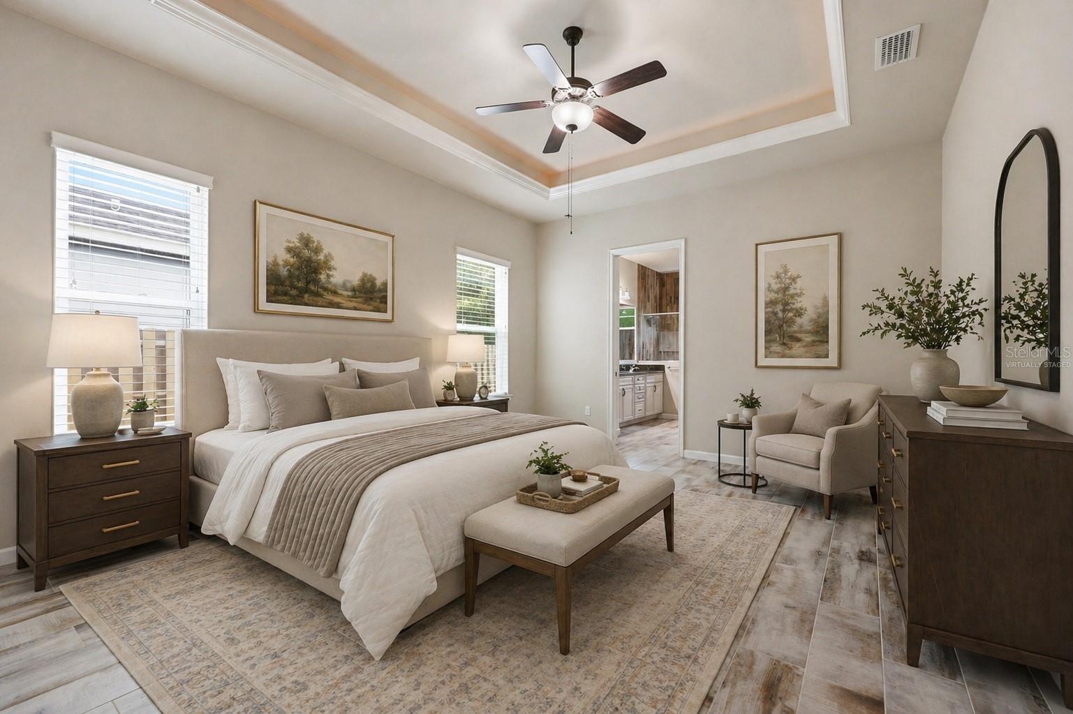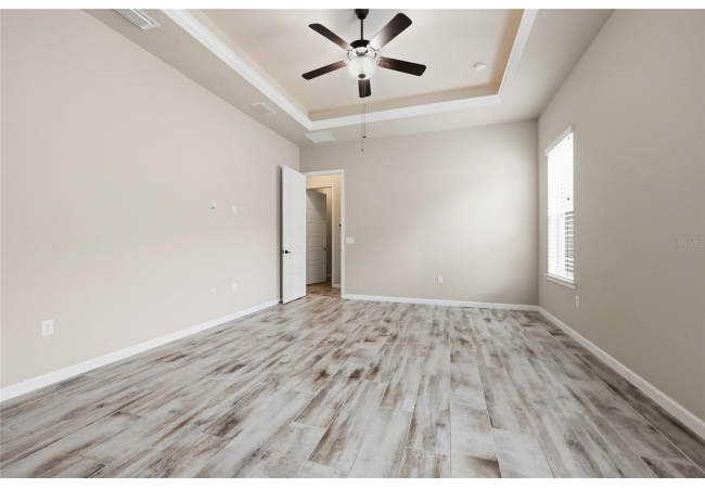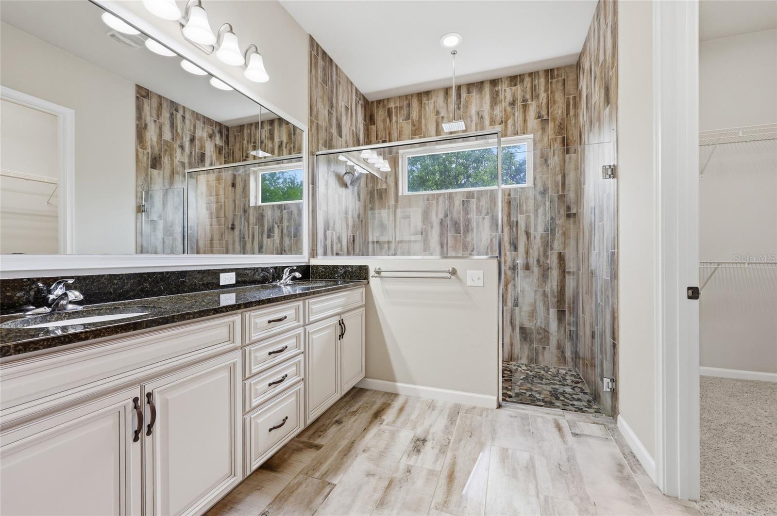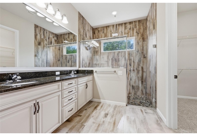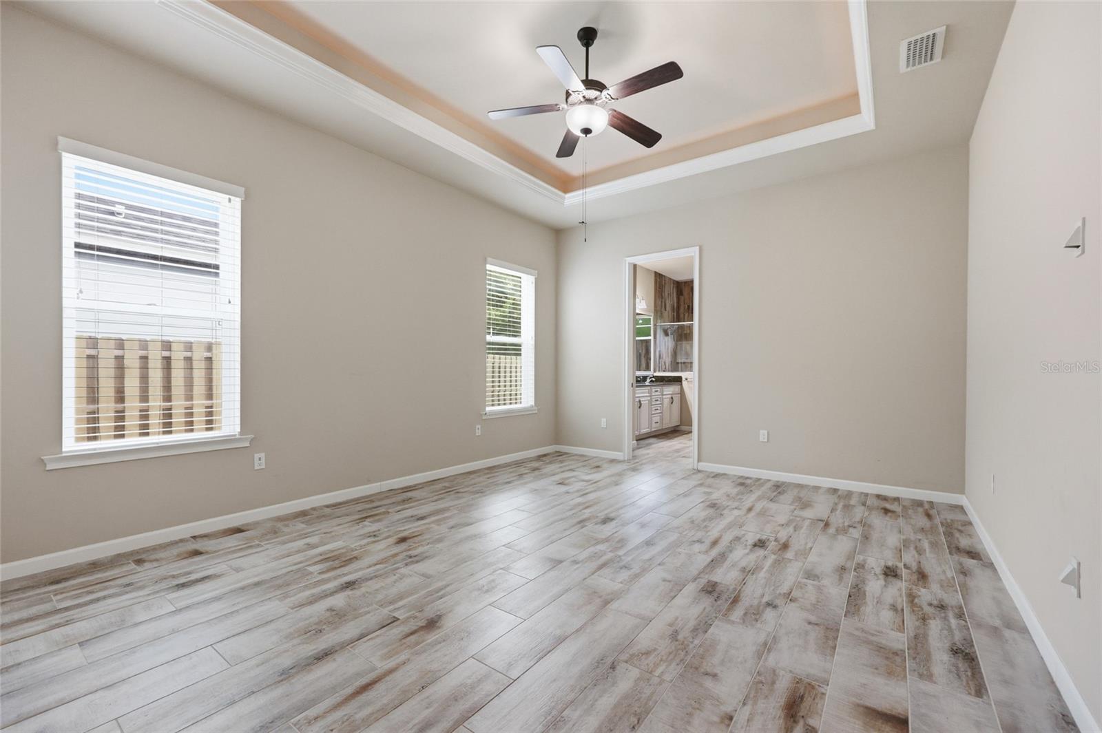 On the opposite side of the home, the primary suite serves as a comfortable retreat, complete with a spacious walk-in closet, large shower, dual vanities, and a separate water closet. A nearby fourth bedroom offers flexibility as a study, office, or additional guest space.