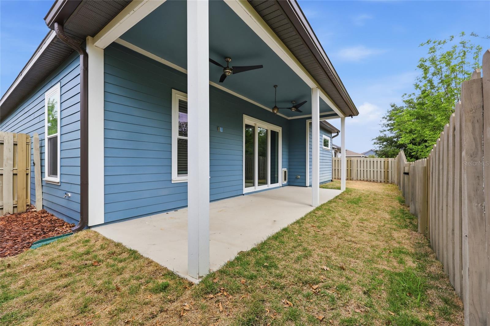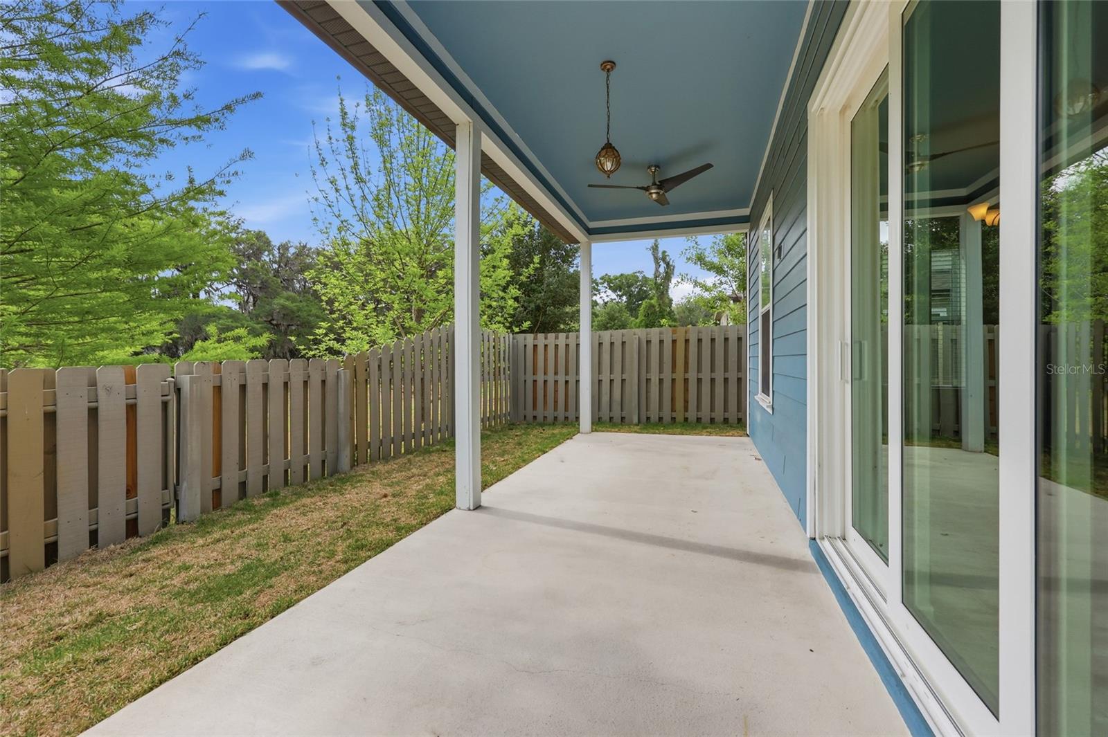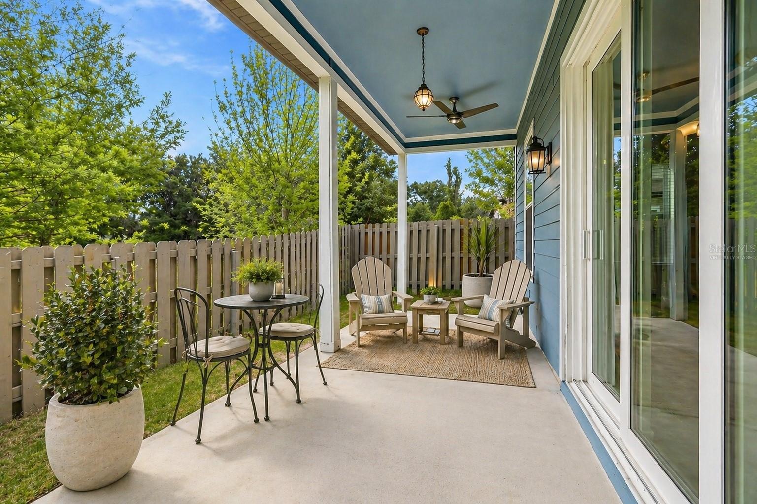 Outdoors, the covered patio is ideal for enjoying fresh air and the natural backdrop. The fully fenced yard is manageable in size, with no rear neighbors and a conservation area along one side, creating a sense of openness.