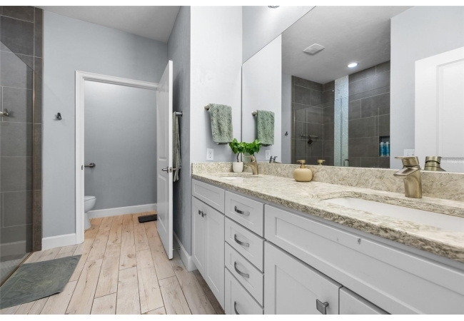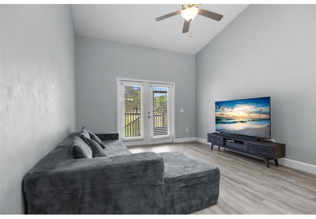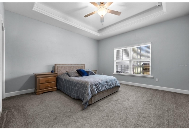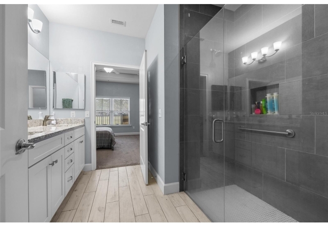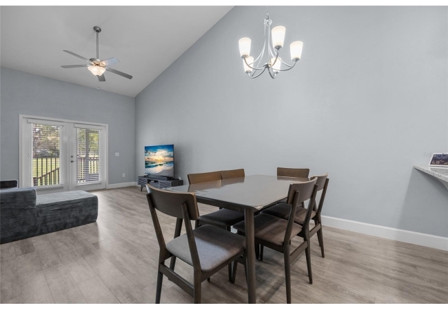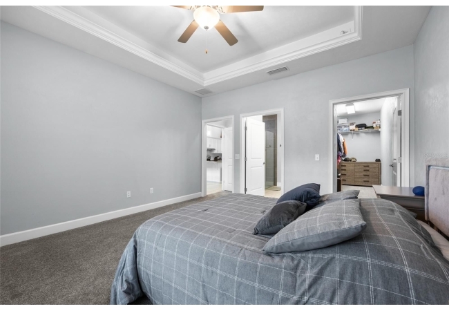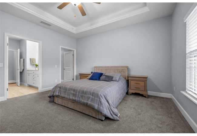 French doors lead from the living area to a large, screened porch overlooking peaceful green space—an ideal spot for morning coffee, relaxing evenings, or entertaining friends and family. The large primary bedroom is another standout, featuring elegant tray ceilings that elevate the space, a generous walk-in closet, and an en-suite bathroom with double vanities and a beautifully finished walk-in shower.