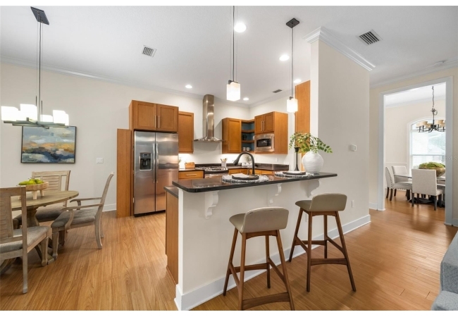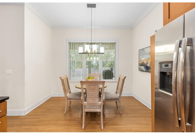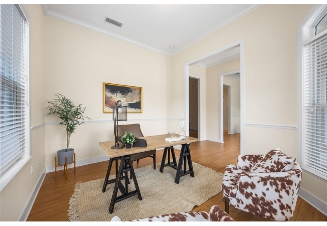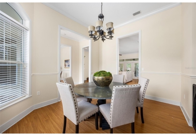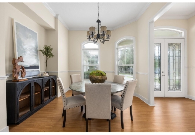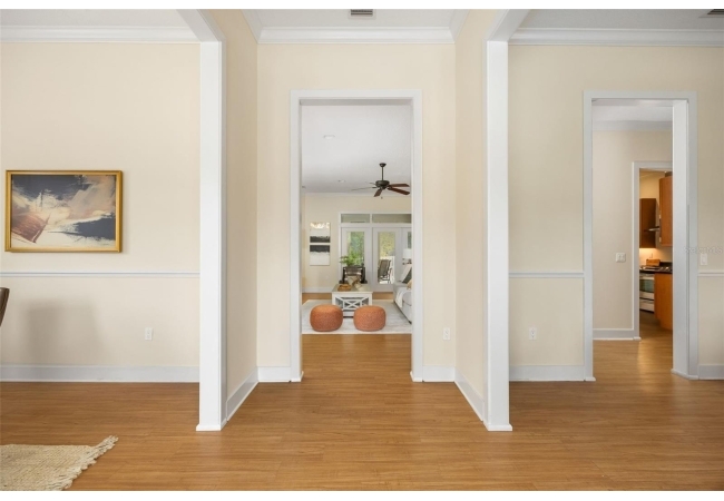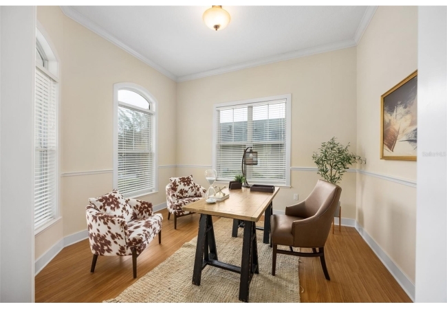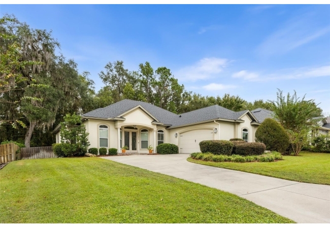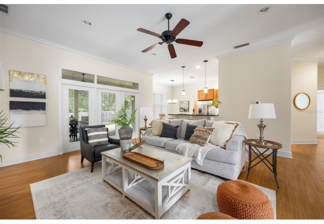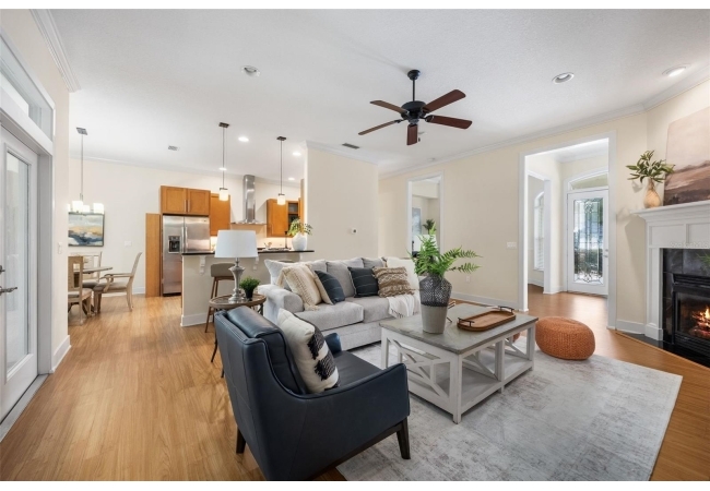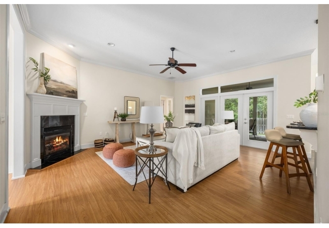 Welcome to elegant living in the highly desirable Ridgemont neighborhood! This meticulously maintained home offers a perfect blend of modern comfort and classic style. The open floor plan creates a bright, airy feel, ideal for daily living and entertaining. Step inside to appreciate the quality of design, including beautiful hardwood floors throughout and an abundance of decorative molding that adds timeless character. The chef's kitchen boasts rich wood cabinets, sleek stainless steel appliances, and a premium gas range. The flexible layout offers dedicated spaces for every need, including a formal dining room and a separate, versatile secondary living space that easily functions as a professional home office or den. Relax in the family room centered around a cozy gas fireplace. French doors lead to your private outdoor retreat: a spacious, covered lanai featuring an attractive brick pavered floor, perfect for year-round enjoyment. Experience the best of Gainesville in this exceptional property!