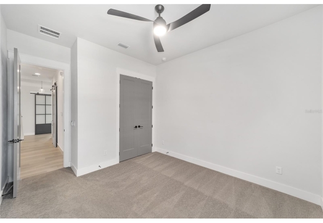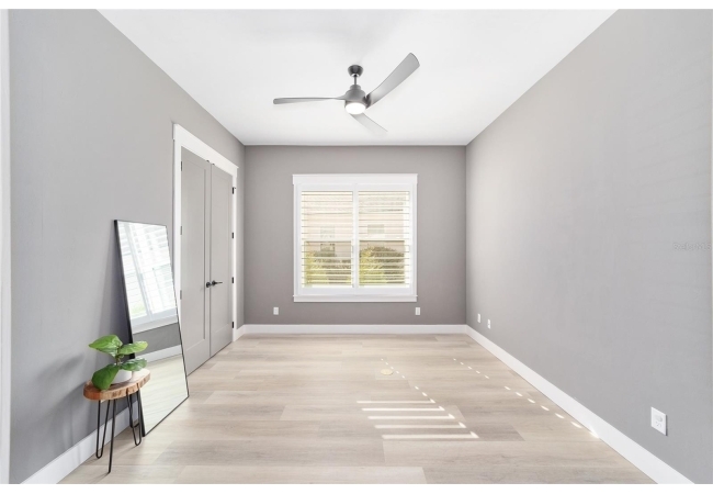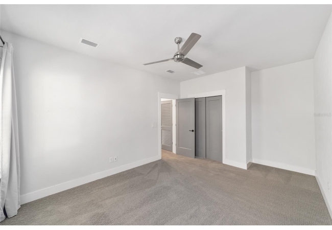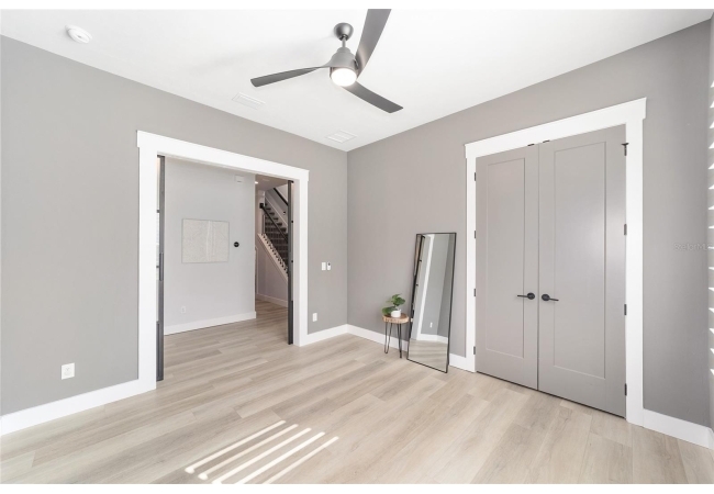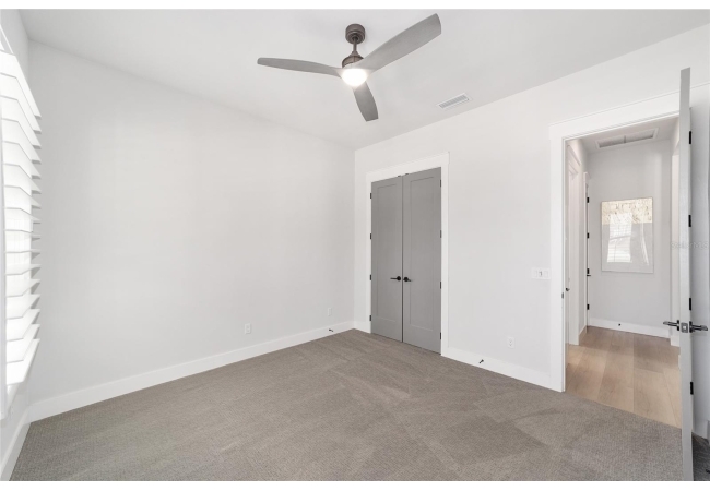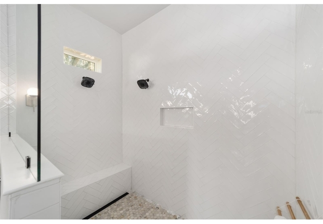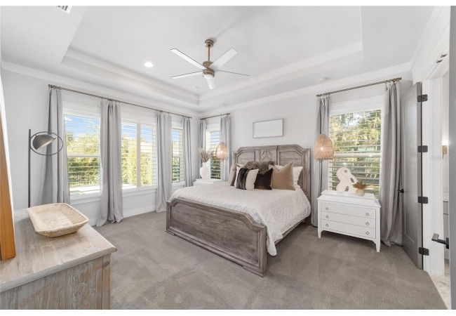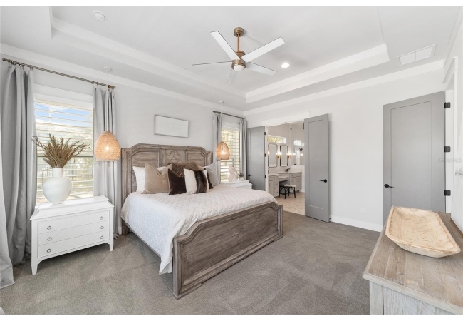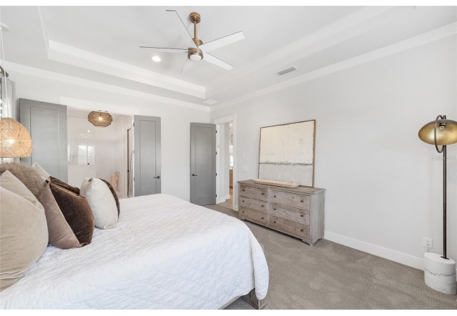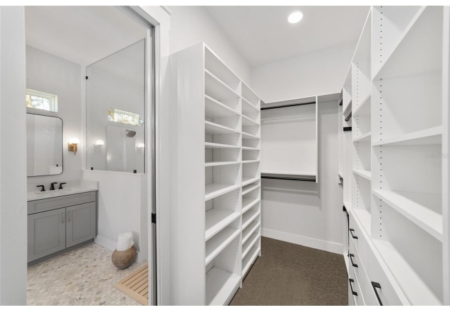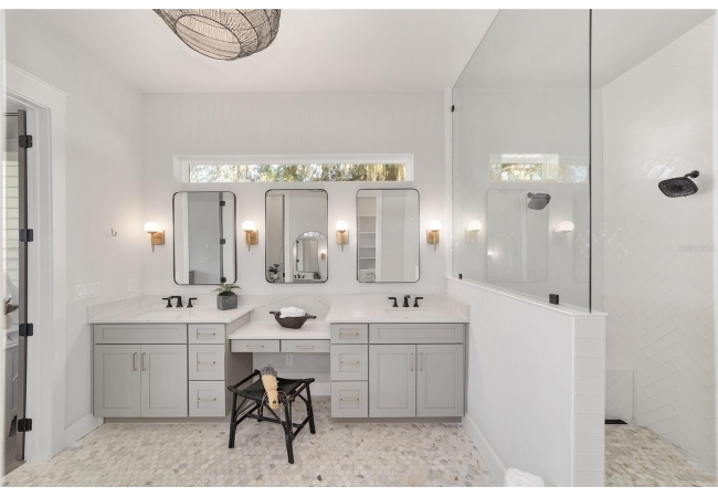 The primary suite serves as a true private sanctuary. A spacious bedroom leads into a spa-inspired bathroom featuring split vanities, a dedicated makeup vanity niche, and a large walk-in shower wrapped in elegant herringbone tile. The thoughtful finishes, lighting selections, and serene palette make it the perfect retreat for unwinding at the end of the day. Completing the suite is a fully customized walk-in closet system designed to maximize storage and organization with elegance.