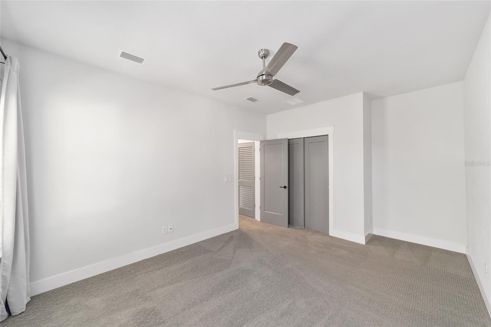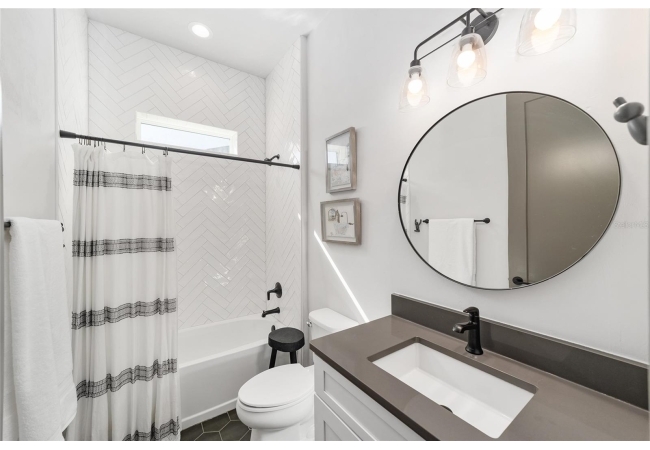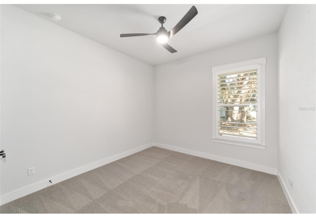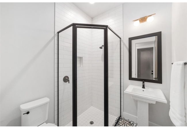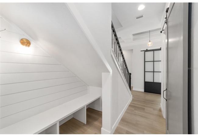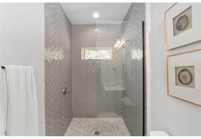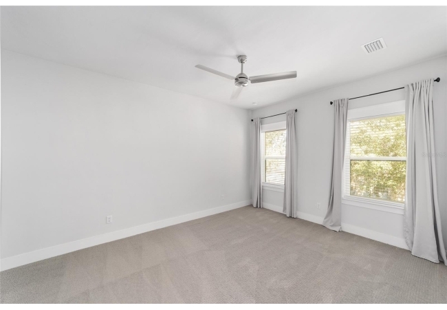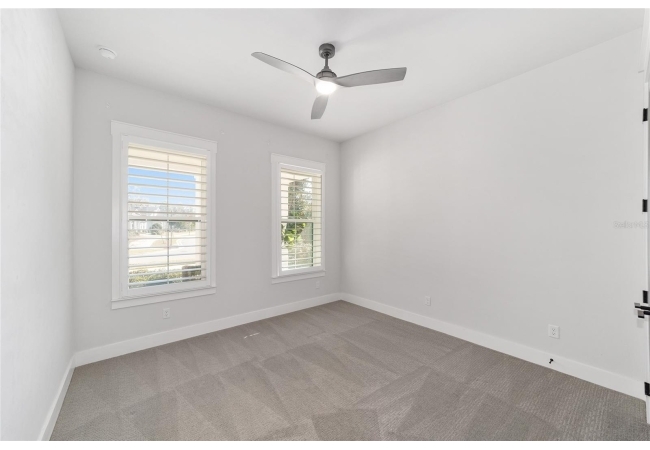 The primary suite serves as a true private sanctuary. A spacious bedroom leads into a spa-inspired bathroom featuring split vanities, a dedicated makeup vanity niche, and a large walk-in shower wrapped in elegant herringbone tile. The thoughtful finishes, lighting selections, and serene palette make it the perfect retreat for unwinding at the end of the day. Completing the suite is a fully customized walk-in closet system designed to maximize storage and organization with elegance.