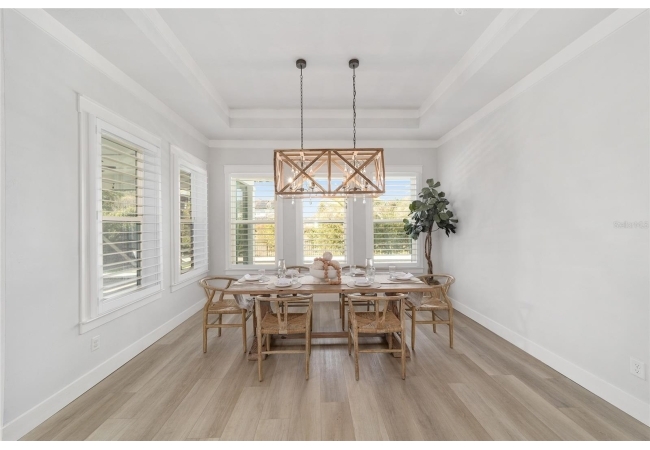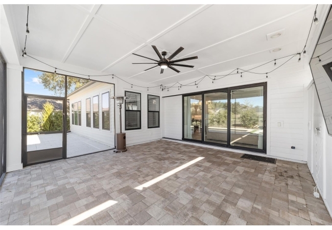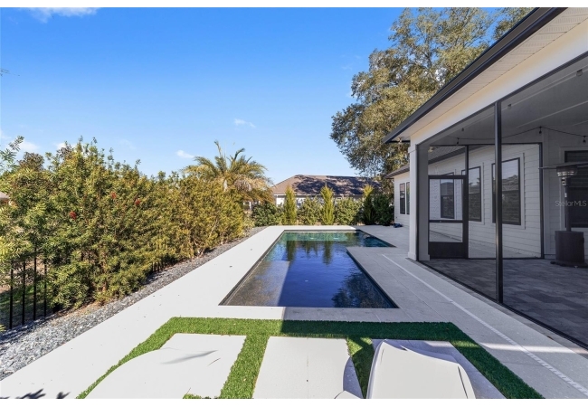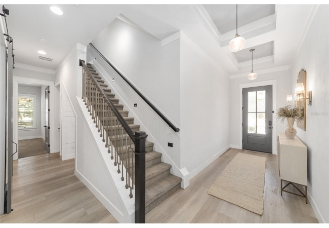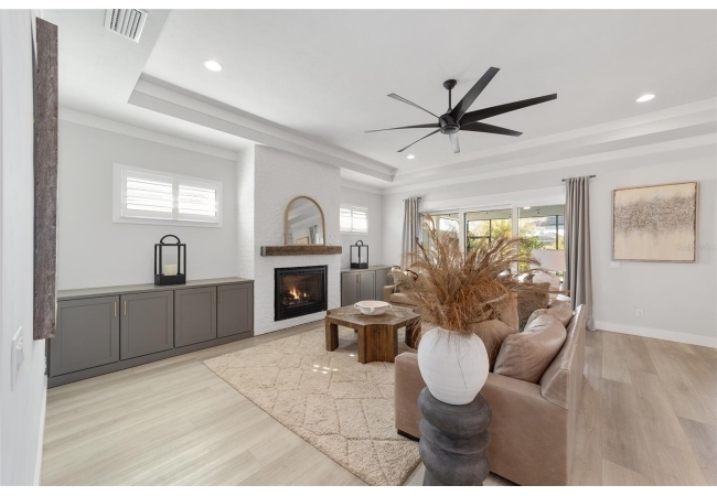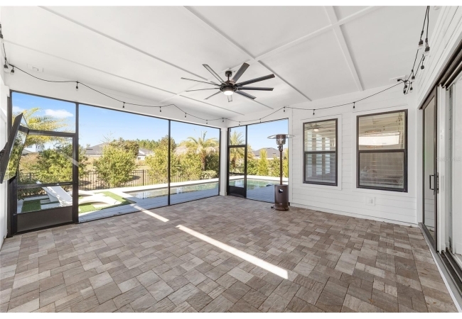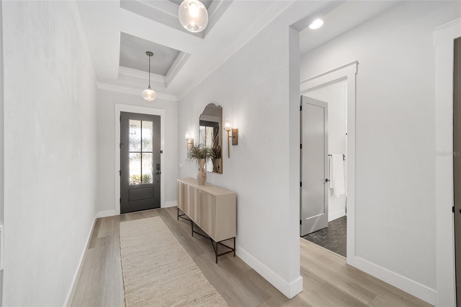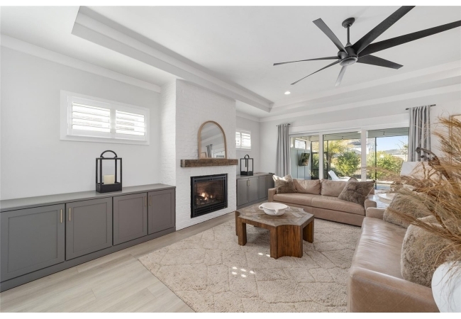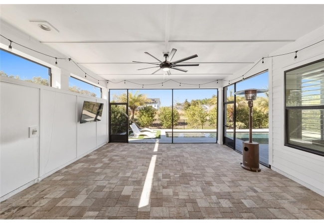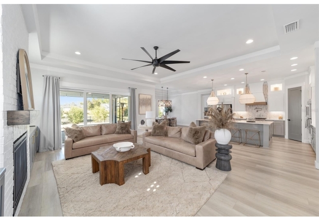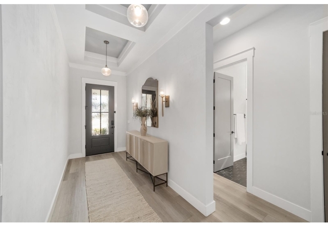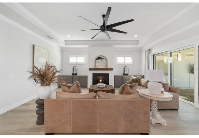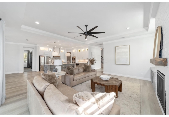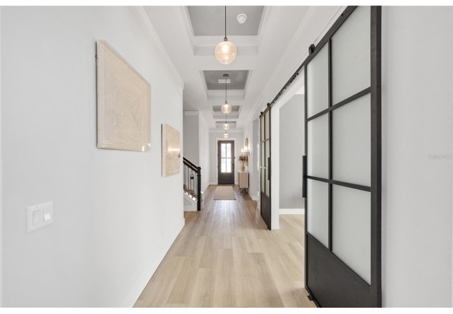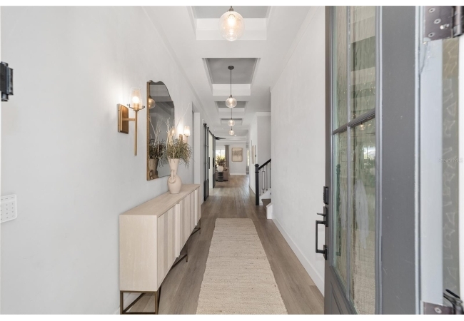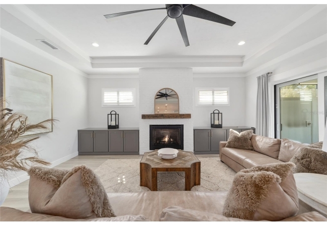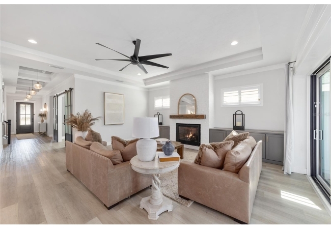 Step inside and be greeted by a dramatic gallery-style entry hall with coffered ceilings, designer lighting, and sliding glass privacy doors perfect for a home office or formal dining. The open-concept living space is anchored by a gas fireplace with custom built-ins and seamless indoor-outdoor flow to the gorgeous screened lanai and heated saltwater pool.