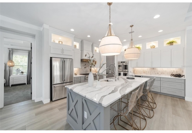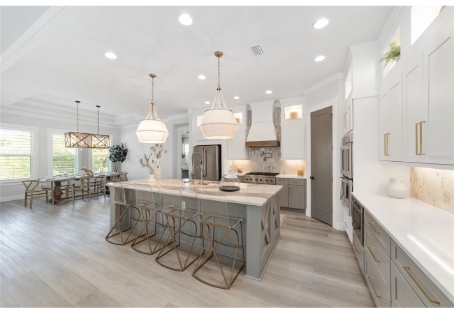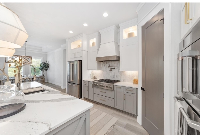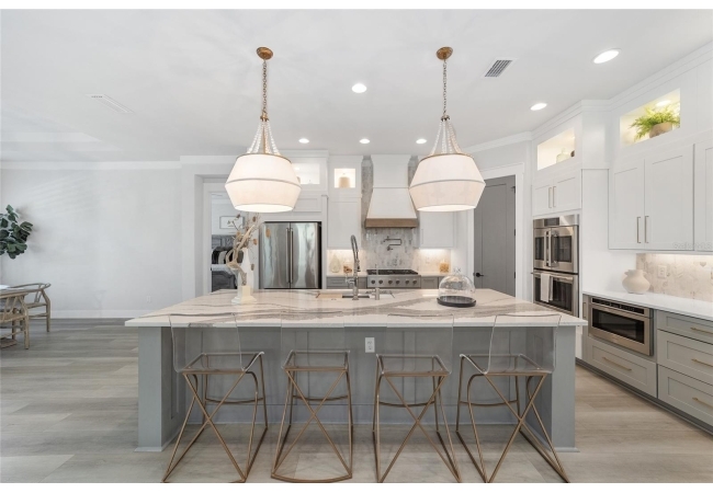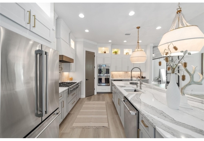 For the culinary enthusiast, the gourmet kitchen checks every box: 10 foot oversized quartz island, high-end stainless steel appliance suite, gas cooktop, custom hood, double wall ovens, walk-in pantry, and designer pendants, an entertainer’s dream.