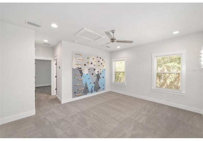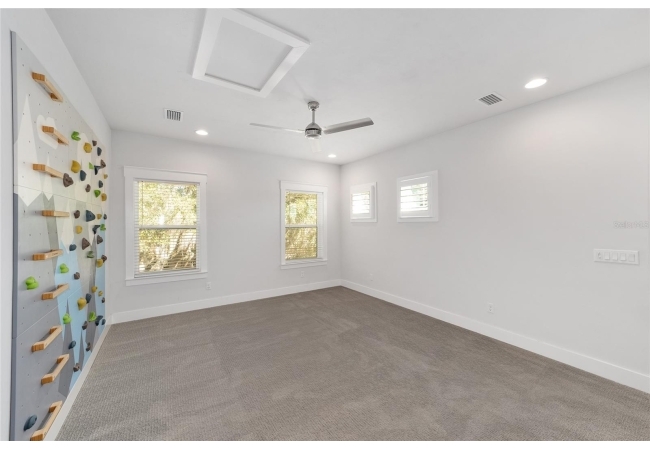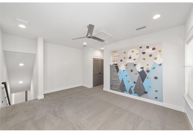 Upstairs, a full guest suite awaits along with the ideal play or media space, complete with a custom mountain-themed climbing wall and abundant natural light. Additional bedrooms are spacious, well-appointed, and thoughtfully separated for privacy.