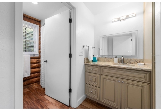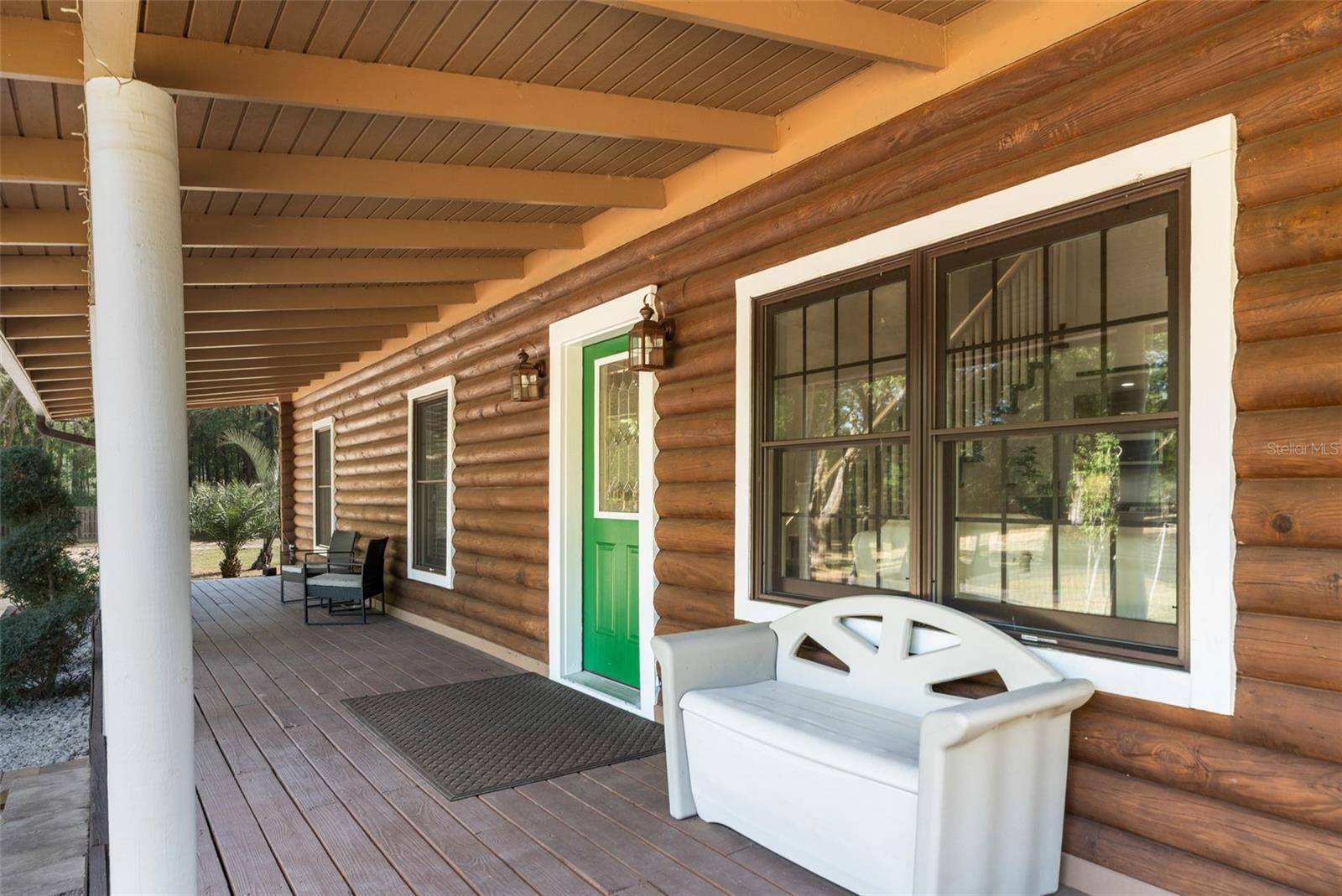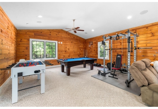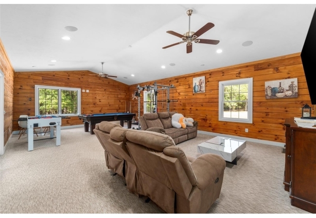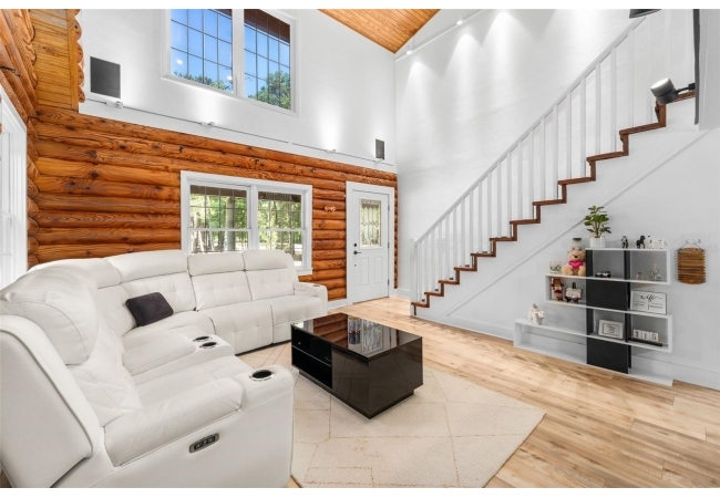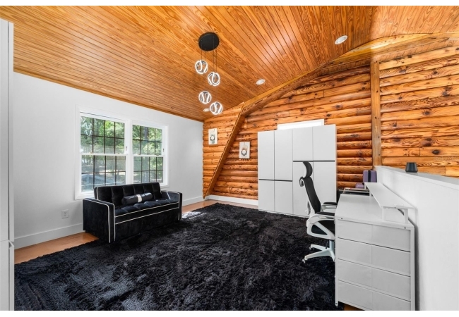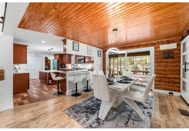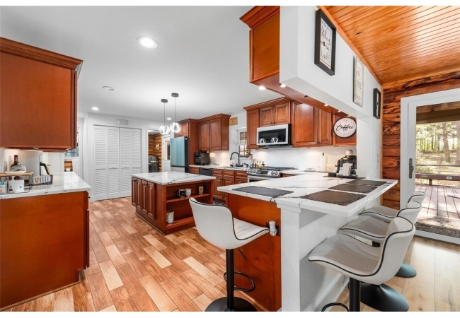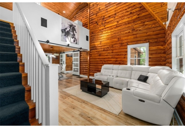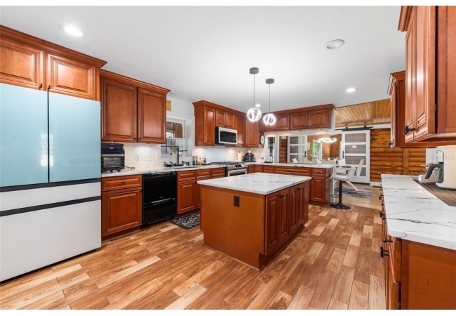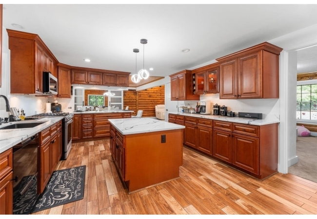 As you walk up the covered front porch through the front door you’ll immediately notice the quintessential pine log walls and cathedral ceilings. The spacious living room leads to the dining room which is perfectly situated between the remodeled kitchen and massive, 600 square foot bonus room. The kitchen is complete with real wood cabinets and updated quartz counter tops.