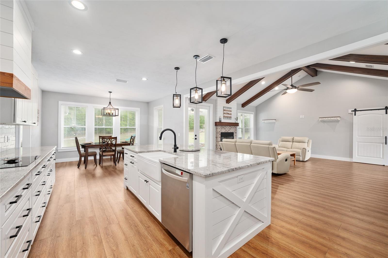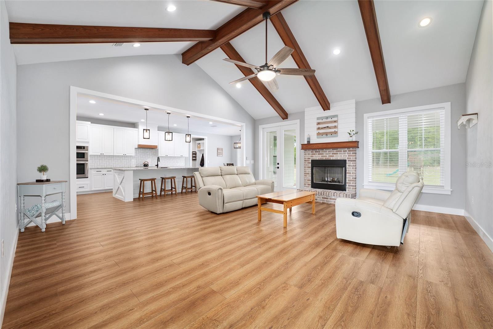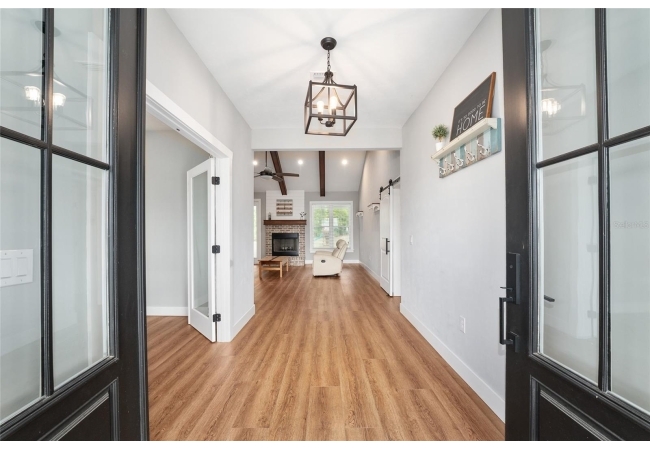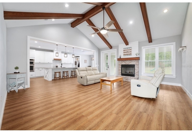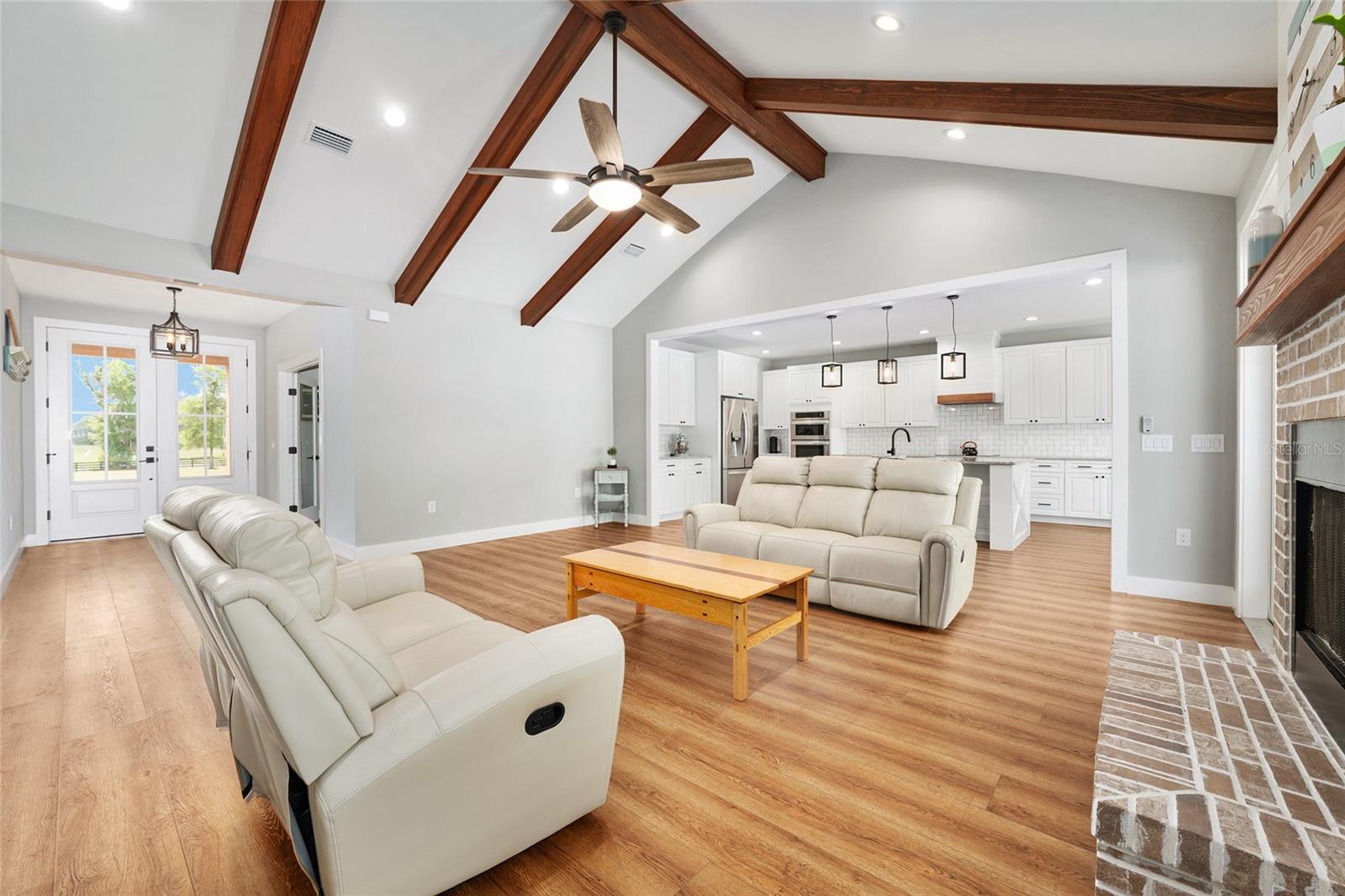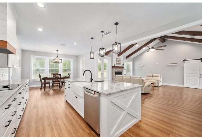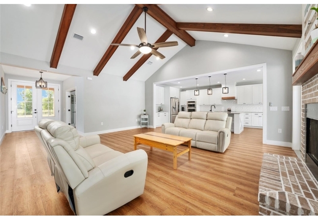 Built just four years ago, the home feels fresh, intentional, and move-in ready. The open floor plan centers around a light-filled living area with tall ceilings, exposed beams, and a fireplace that anchors the space. The kitchen delivers both style and utility, highlighted by a massive walk-in pantry that keeps everything organized and out of sight.