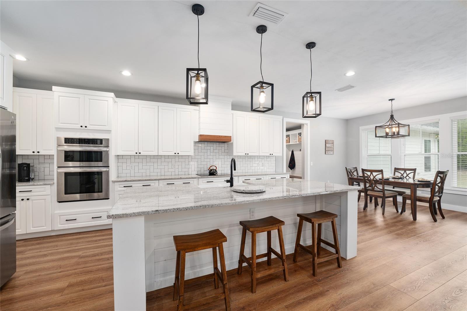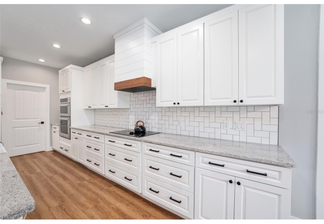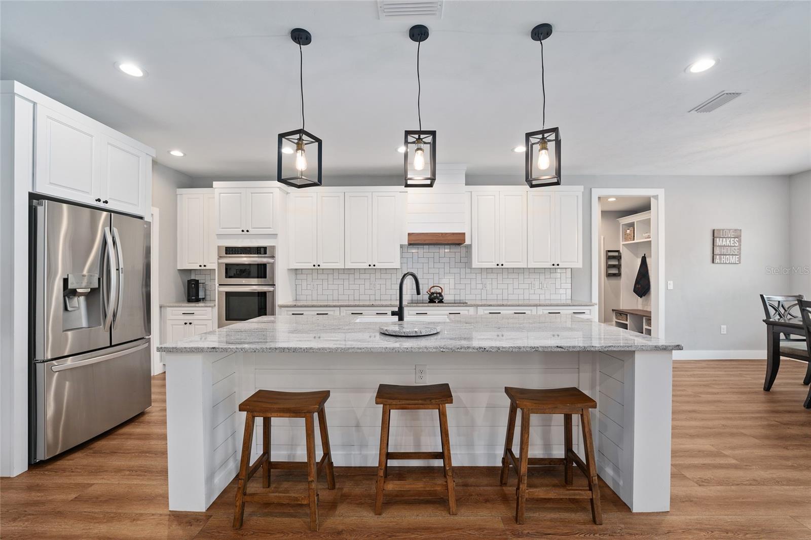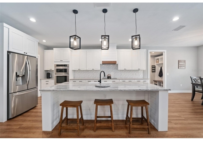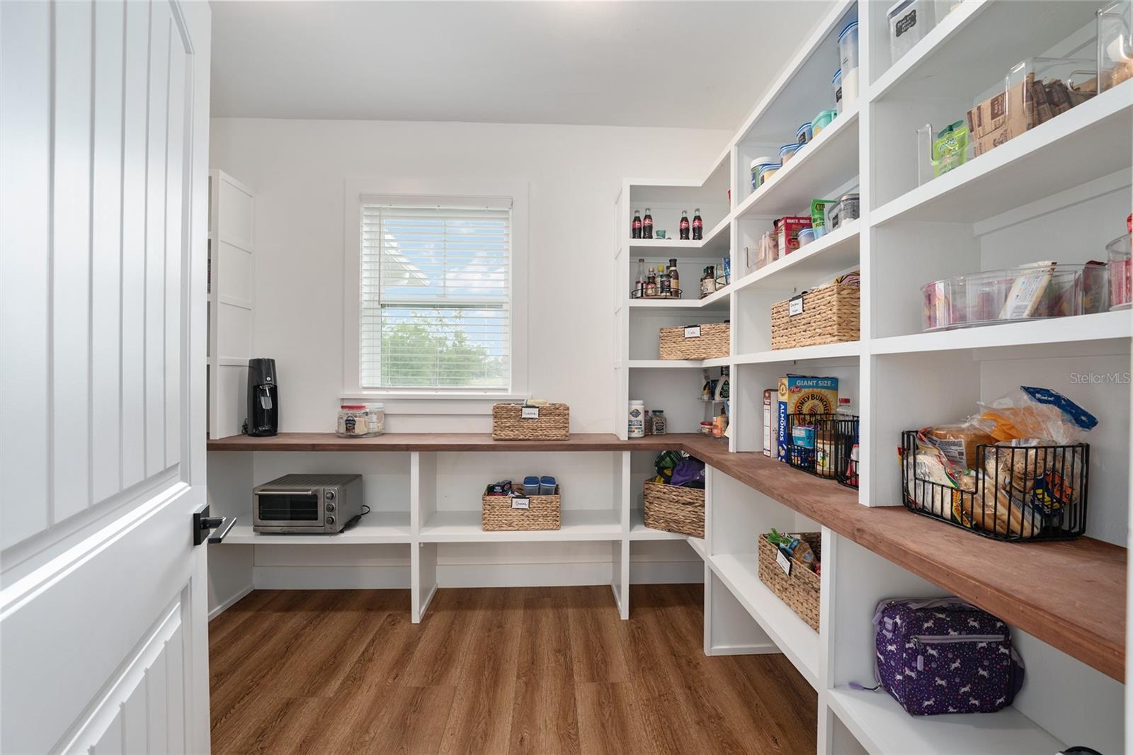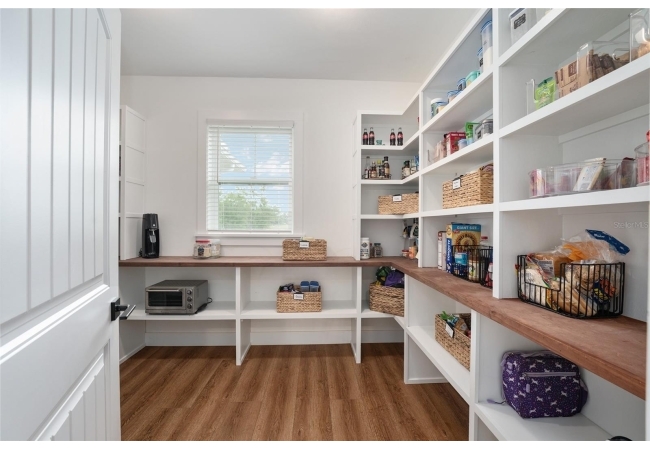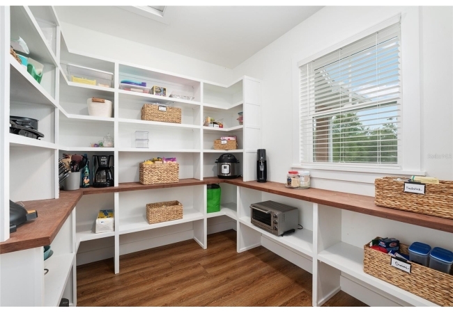 Built just four years ago, the home feels fresh, intentional, and move-in ready. The open floor plan centers around a light-filled living area with tall ceilings, exposed beams, and a fireplace that anchors the space. The kitchen delivers both style and utility, highlighted by a massive walk-in pantry that keeps everything organized and out of sight.