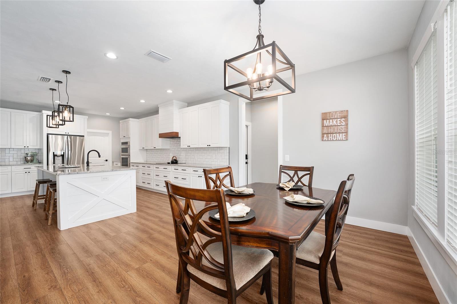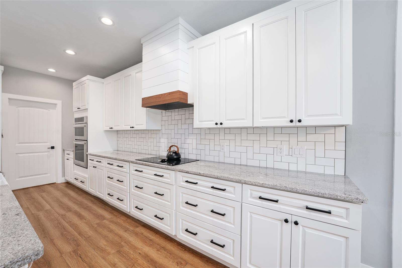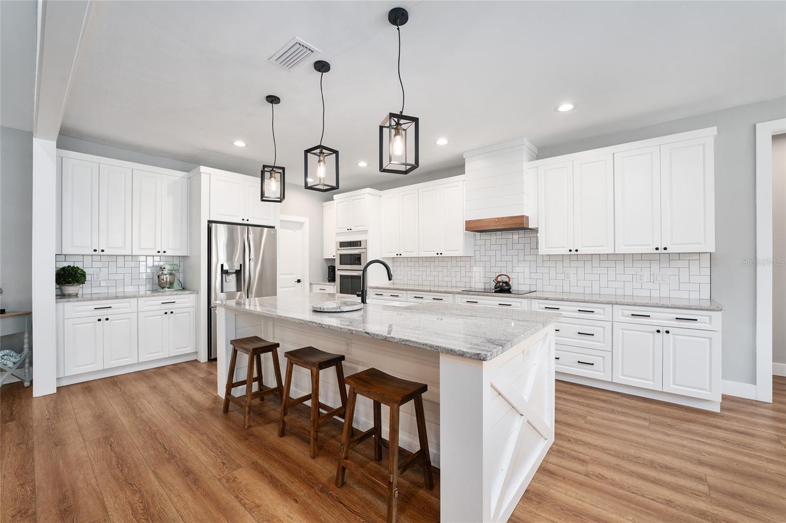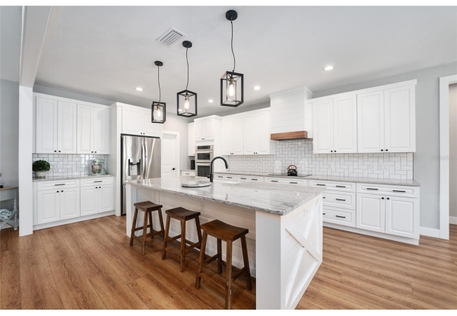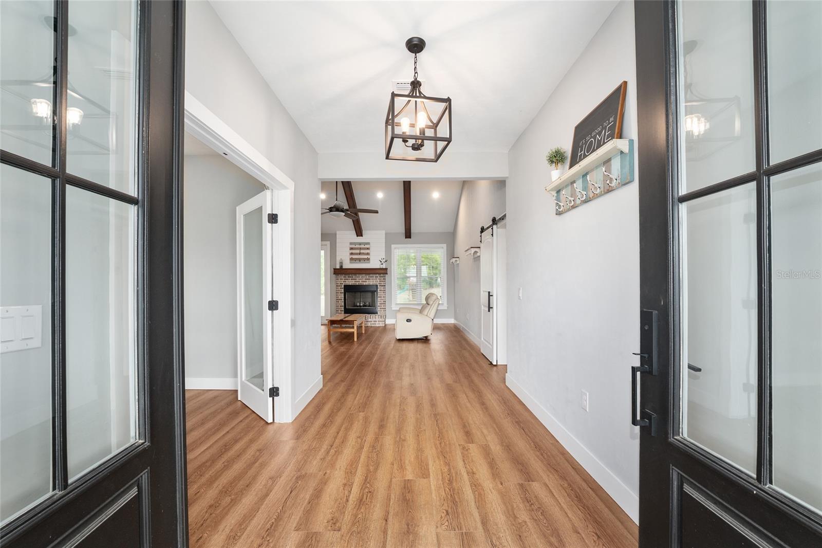 Built just four years ago, the home feels fresh, intentional, and move-in ready. The open floor plan centers around a light-filled living area with tall ceilings, exposed beams, and a fireplace that anchors the space. The kitchen delivers both style and utility, highlighted by a massive walk-in pantry that keeps everything organized and out of sight.