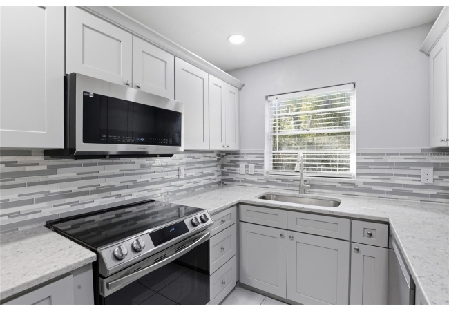 Inside, you’ll find a refreshed interior featuring new ceramic tile flooring, fresh paint, updated trim, new light fixtures, and recessed lighting in the kitchen. The kitchen has been fully upgraded with brand-new cabinets, quartz countertops, and smart appliances, including a smart refrigerator, air-fryer stove, microwave, dishwasher, and smart washer and dryer—making everyday living simple and convenient.