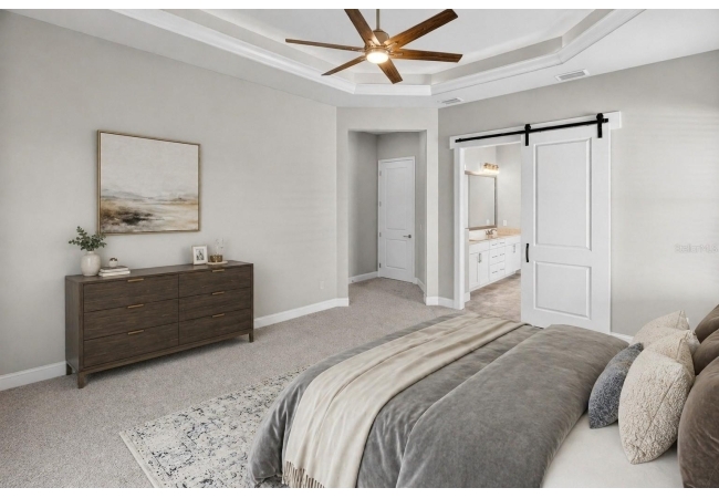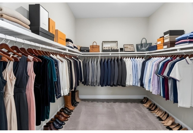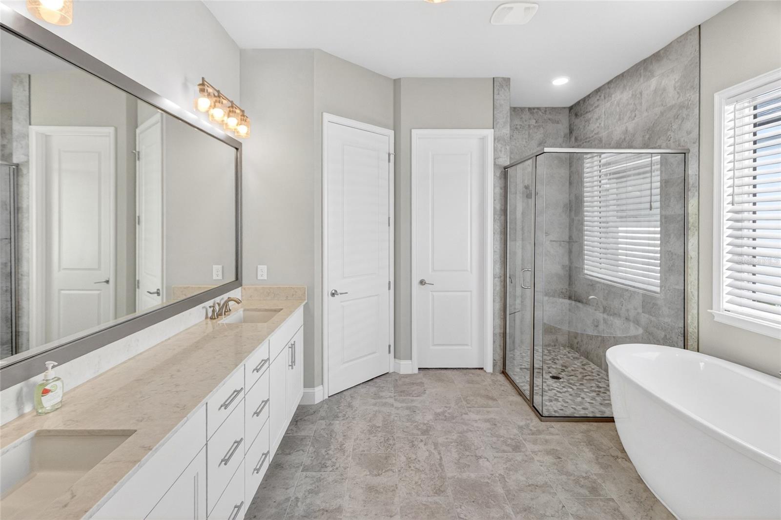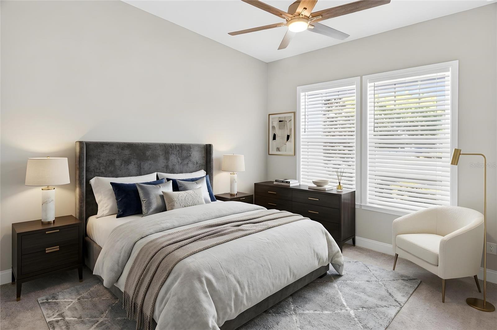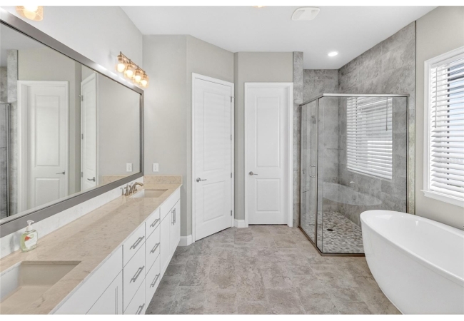 Privately situated at the rear of the home, the owner’s suite offers a peaceful escape with crown molding, new carpeting, a spacious walk-in closet, and a well-appointed en-suite bath featuring dual vanities, a soaking tub, and a walk-in shower.
