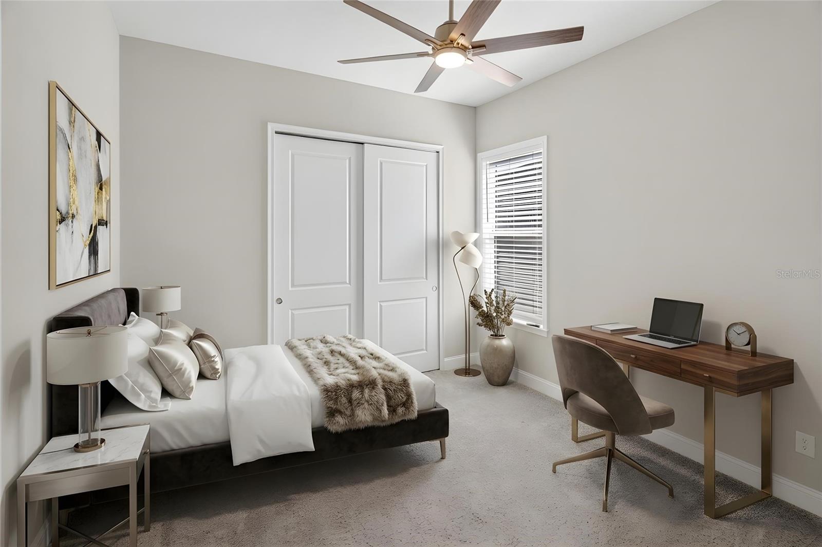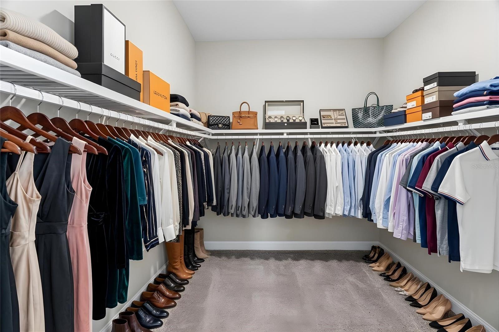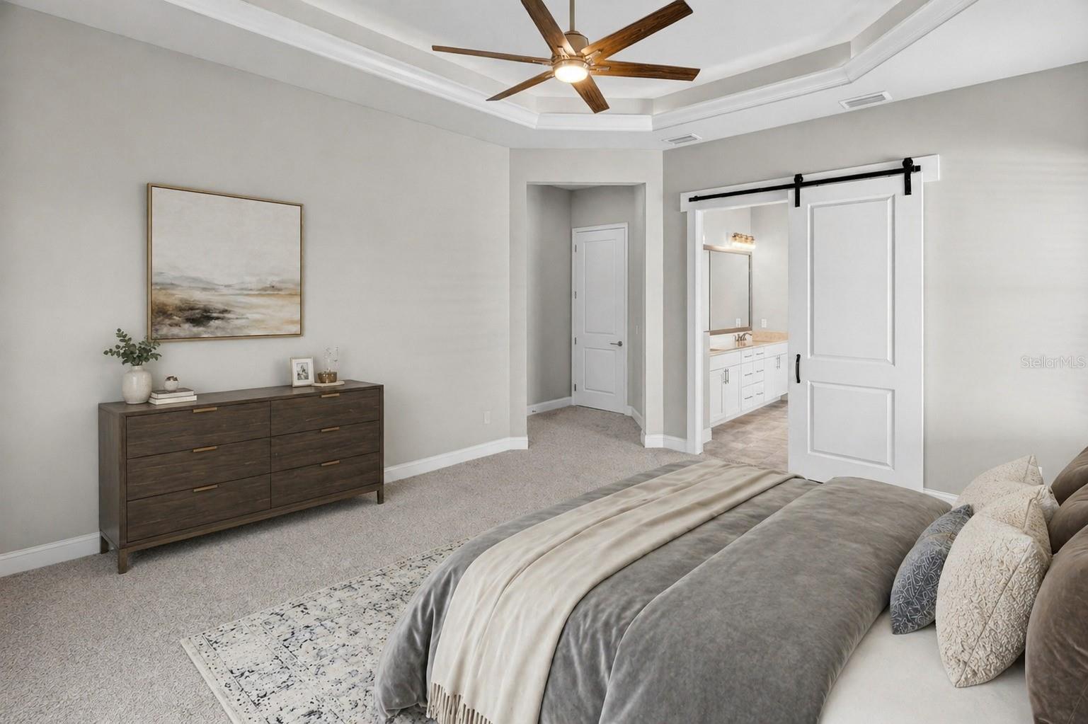 Privately situated at the rear of the home, the owner’s suite offers a peaceful escape with crown molding, new carpeting, a spacious walk-in closet, and a well-appointed en-suite bath featuring dual vanities, a soaking tub, and a walk-in shower.