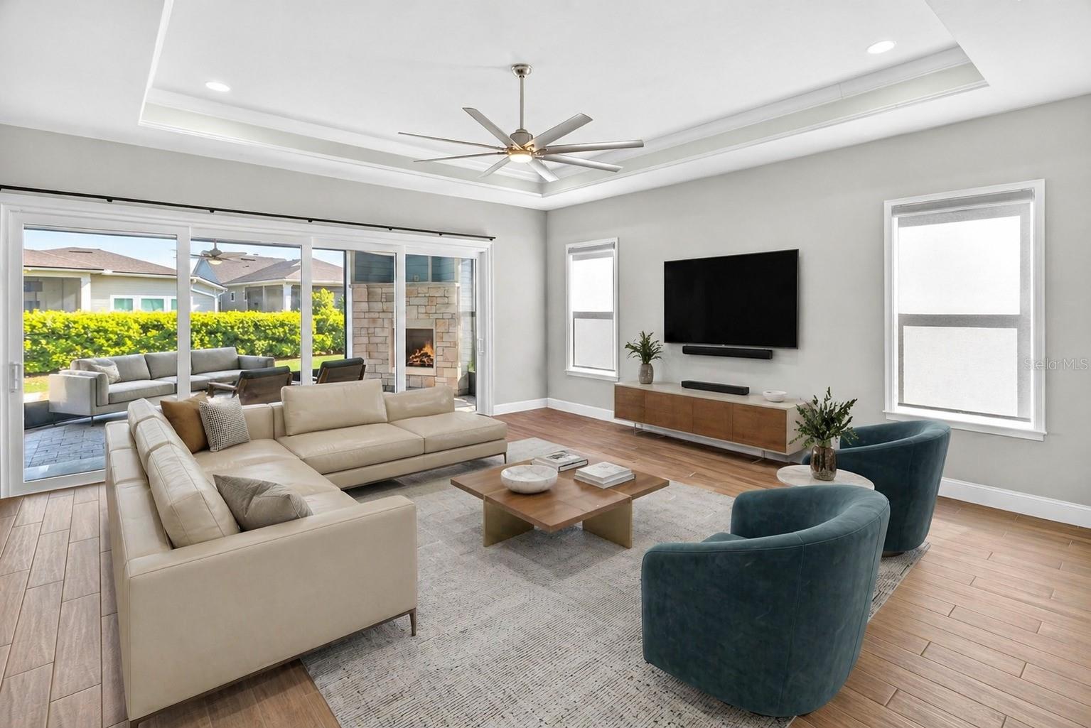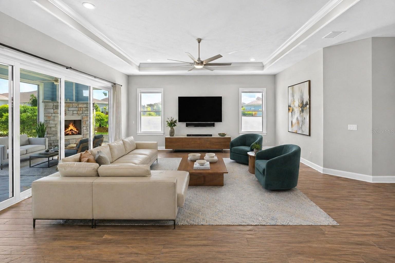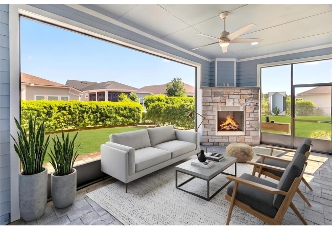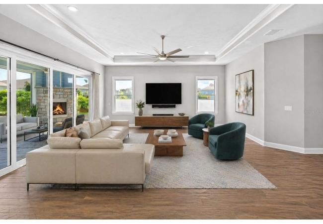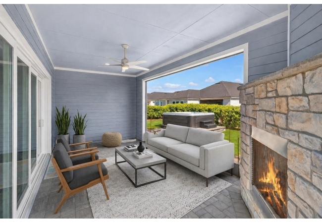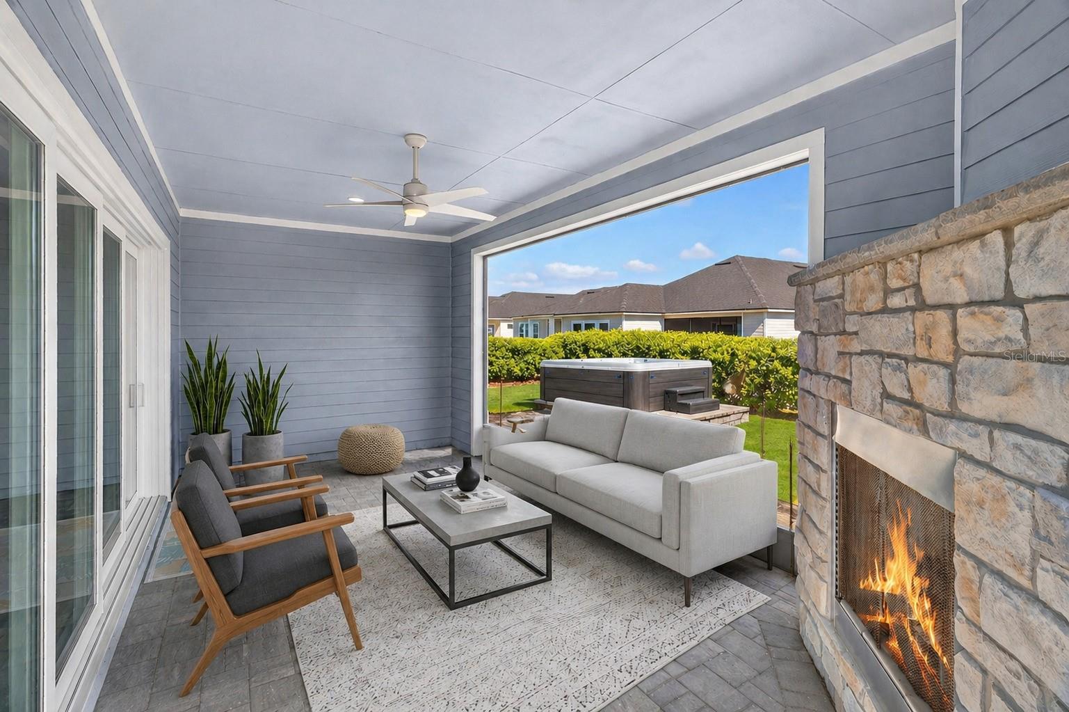 The spacious great room offers plenty of room to gather, highlighted by recessed lighting and stunning triple sliding glass doors that open to a screened lanai complete with a cozy fireplace—an ideal space for relaxing or entertaining. Just beyond, the beautifully landscaped backyard creates a private retreat featuring a luxurious Jacuzzi J-360 hot tub.