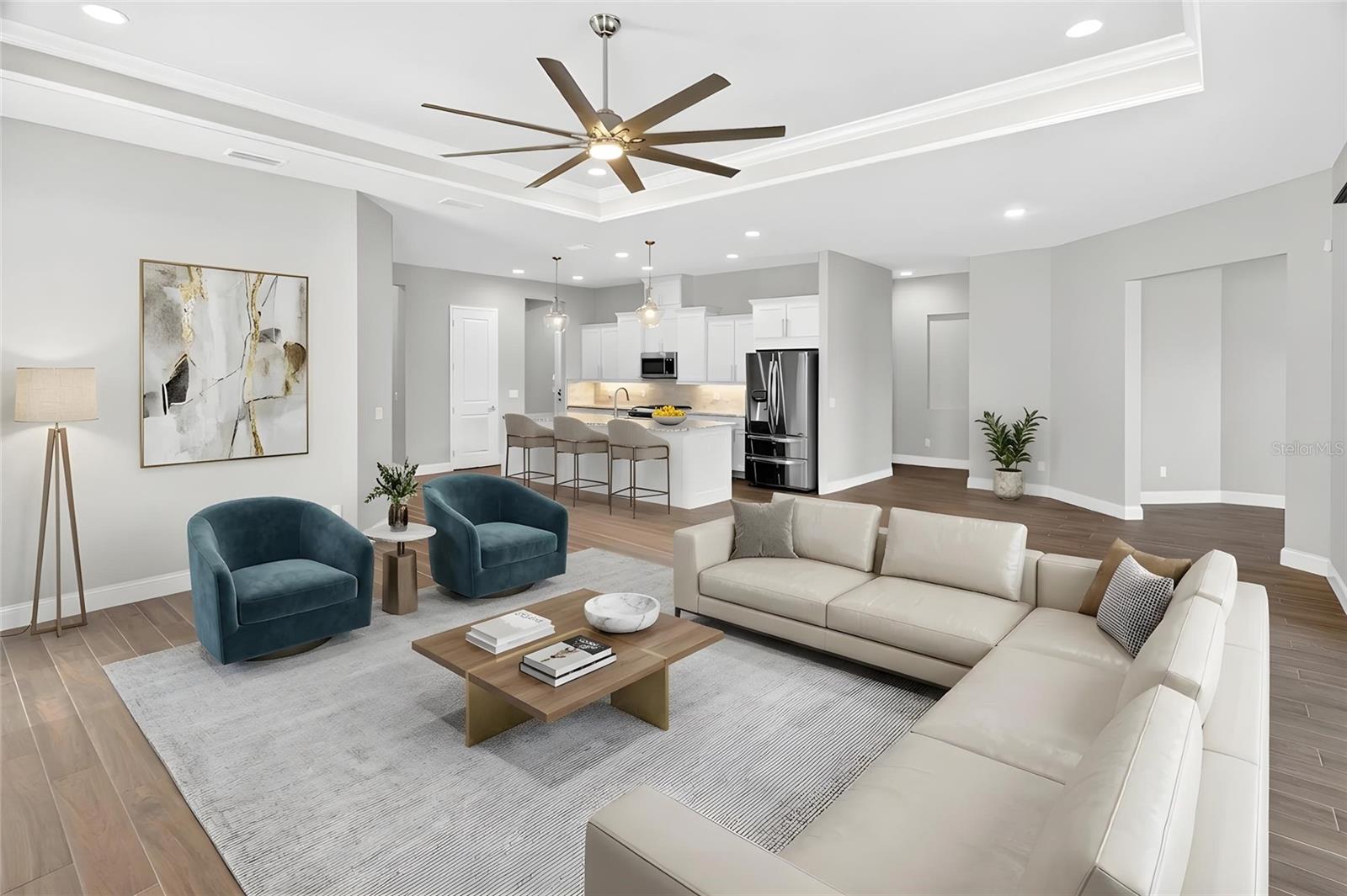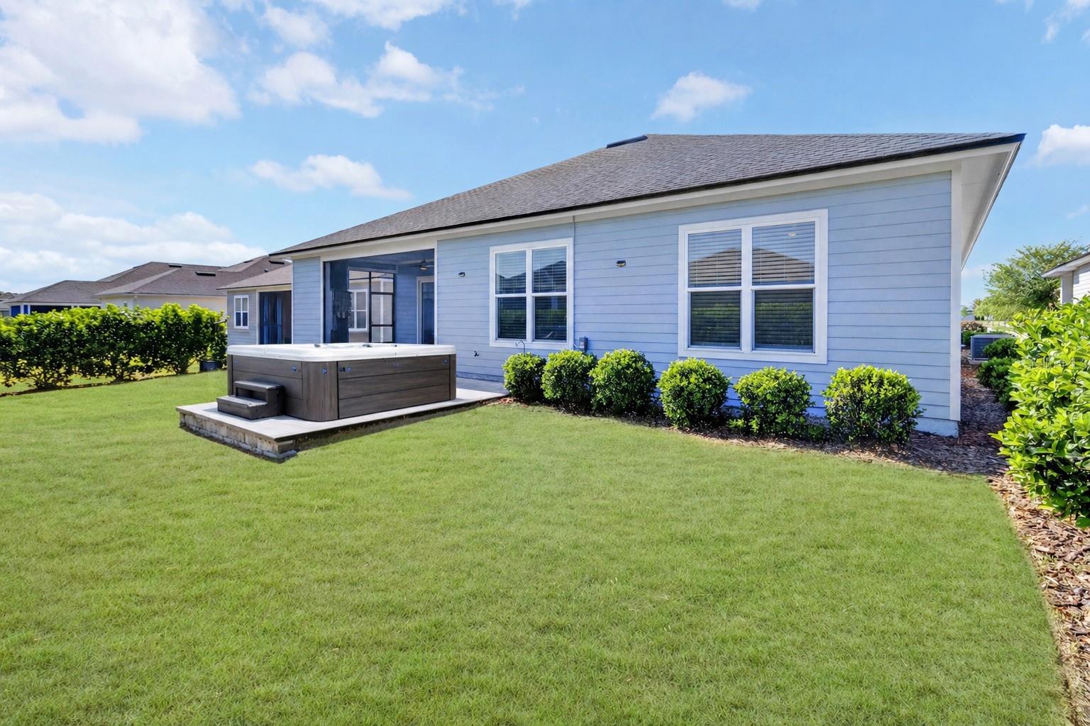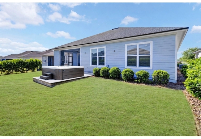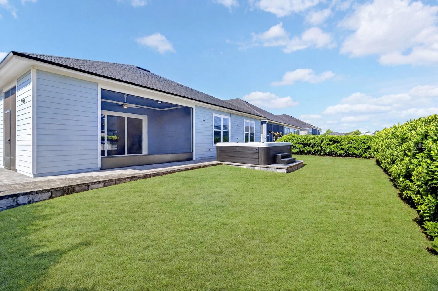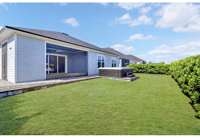The spacious great room offers plenty of room to gather, highlighted by recessed lighting and stunning triple sliding glass doors that open to a screened lanai complete with a cozy fireplace—an ideal space for relaxing or entertaining. Just beyond, the beautifully landscaped backyard creates a private retreat featuring a luxurious Jacuzzi J-360 hot tub.