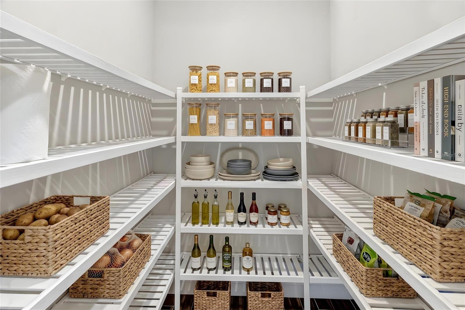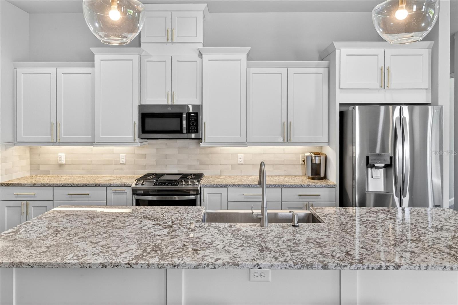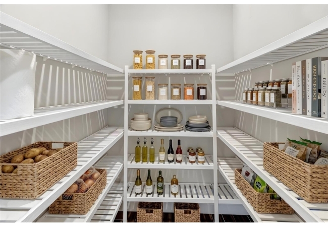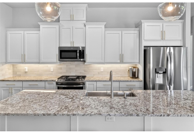 At the heart of the home, the gourmet kitchen is designed for both entertaining and daily living, featuring a large center island, stainless steel appliances, granite countertops, solid wood cabinetry, and an expansive walk-in pantry.