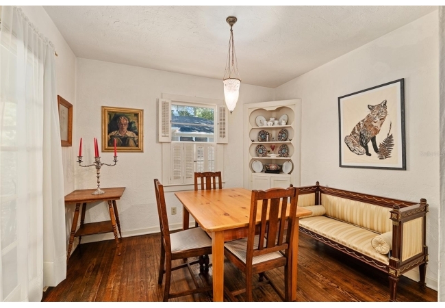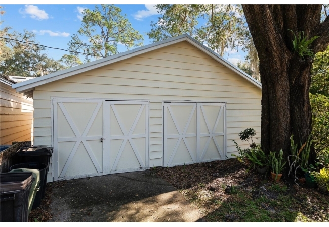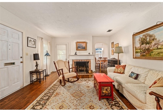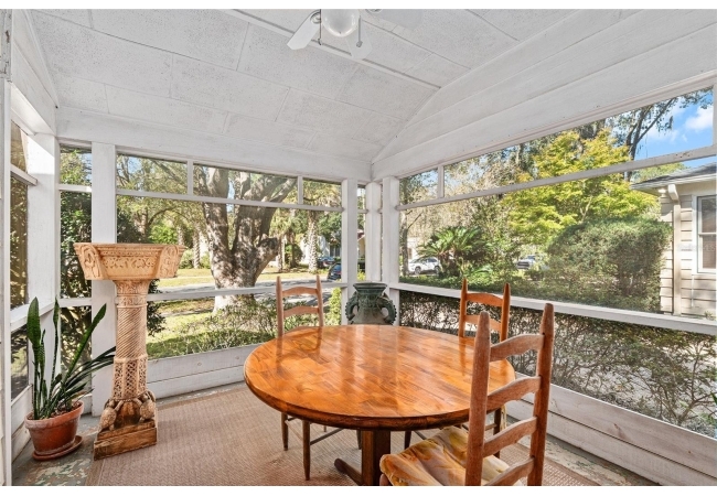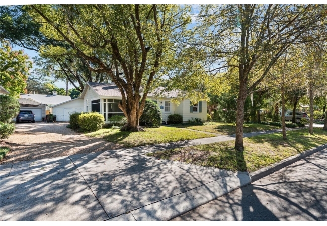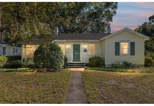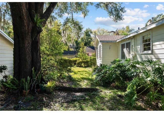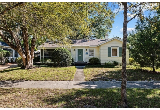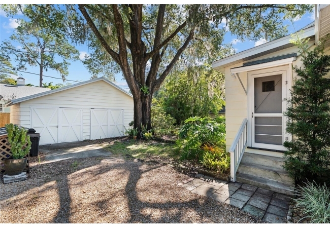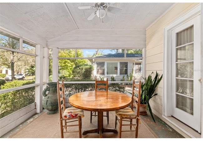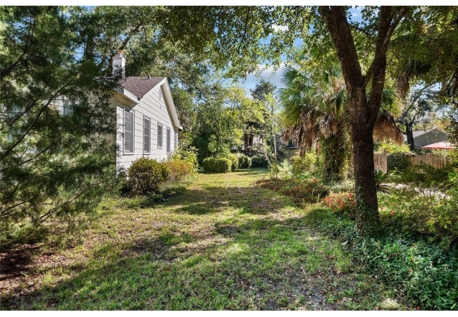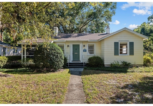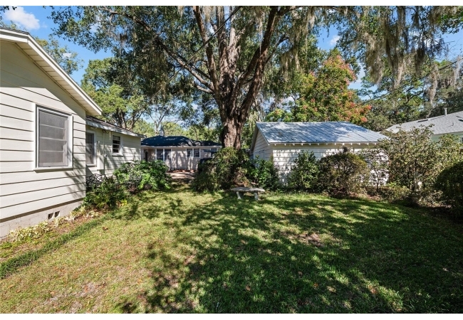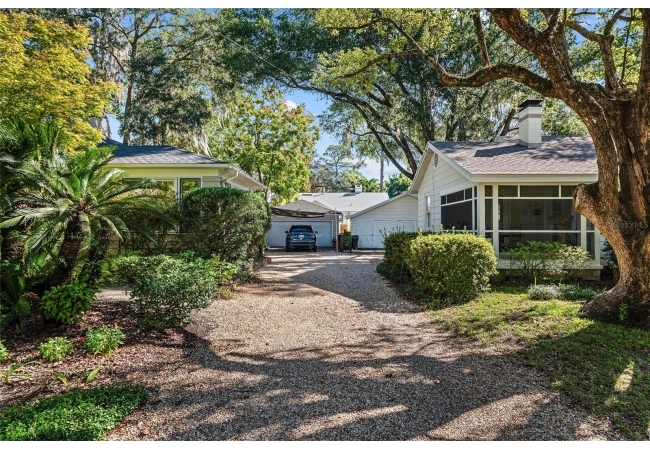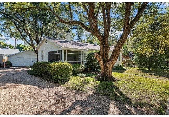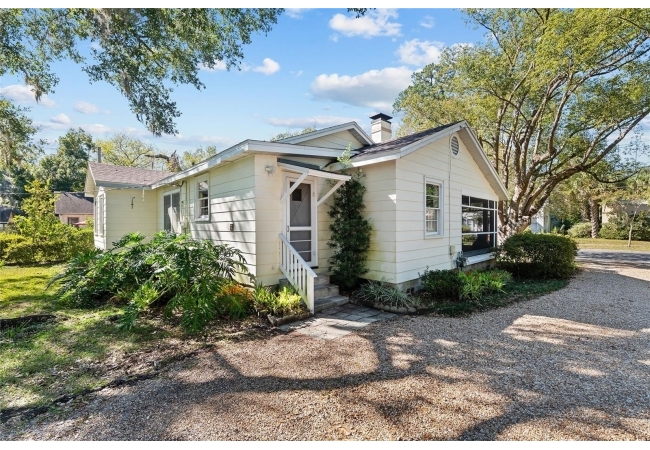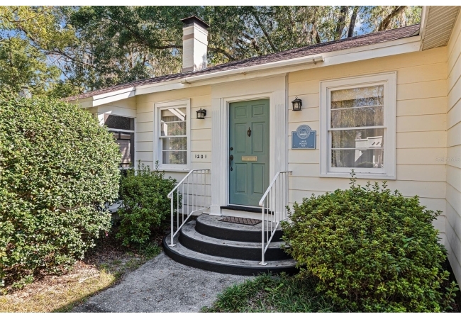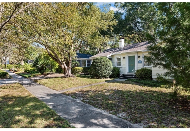 This Gainesville historical home, The Laird House, constructed by M Parrish, Jr., was originally built and sold to two sisters who wished to live next door to each other. As a result, in 1939, this charming cottage was constructed for approximately $5,000. Fast forward to 2017, this historic home was a subject of the notable City tour of homes featuring those built between 1881 to 1949, suggesting its significance to the City of Gainesville. Now is your opportunity to live in this historic home in the south-after Duckpond neighborhood. Through the years, the home was updated with the creation of an alcove and the then-new kitchen, insulation, wiring, and a detached 2-car garage, which is currently configured for a one car and a large workshop. The kitchen was remodeled in 2006, with various appliances replaced since then. More recent improvements include a 2025 garage roof, a 2023 main home roof, a 2025 water heater, and the piping into the walls of the kitchen, water heater, laundry alcove and bathroom have been replaced. A clean 4-point inspection for home owner’s insurance is available. Since the original homes’ family members lived side-by side, the house shares a driveway with the neighbor on the left. The shared driveway provides access to the detached 2-car garage, and to the side entry kitchen door, affording quick access to the house. The front of the home has a charming curbed step front entrance with iron front porch railings. Next to the front door is the Historic Gainesville Inc.’s plaque commemorating the Laird House establishment in 1939. Once inside, you are greeted with the home’s family room and its charming original wood floors. With its west-facing windows, this room is light and bright. On the left side of the room is the wood burning fireplace, and next to it, is the French door that opens onto the two-sided front screened porch. Walk through the family room, past the fireplace in to the separate dining space, which connects directly into the kitchen. Between the kitchen and the side entry door is the stacked washer and dryer, a small closet, and the new water heater. The front right corner of the home is the guest room, with the primary bedroom located in the back-right corner of the home. Both bedrooms share a full hallway bath with original tile flooring, double door cabinets for linen and bath storage, and a tub/shower combination. Next to the bath is the primary bedroom complete with four windows which overlook the rear and side yards. Next to the primary bedroom toward the kitchen, is a smaller room, which could be a 3rd bedroom, nursery, playroom or home office. The hallway connecting the kitchen the bedrooms and bath has two closets for additional storage. This .20-acre lot offers plenty of space for fun and play, while offering backyard privacy with its mature landscaping. If you’re looking to reduce your driving time, this Duckpond home is less than 6 minutes by car from downtown Gainesville, where you will find restaurants, the Courthouse, the city library, the Hippodrome and night lift. If you are a frequent commuter or avid traveler, the Gainesville airport is just 9 minutes away. Travel to UF Health, or to UF’s campus or stadiums, in the same amount of time. Lined with mature trees scattered in between 19th and early 20th century homes, the Duckpond offers an established community with sidewalks and charm throughout the neighborhood, all within the true heart of Gainesville.