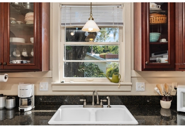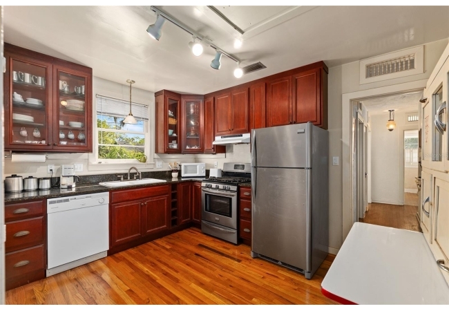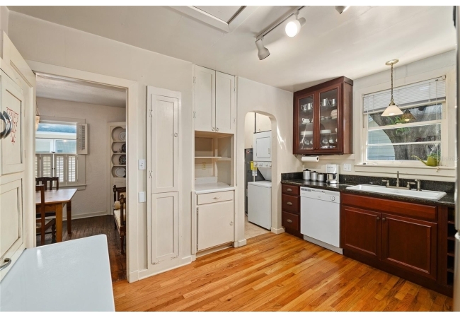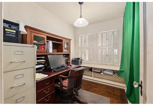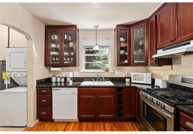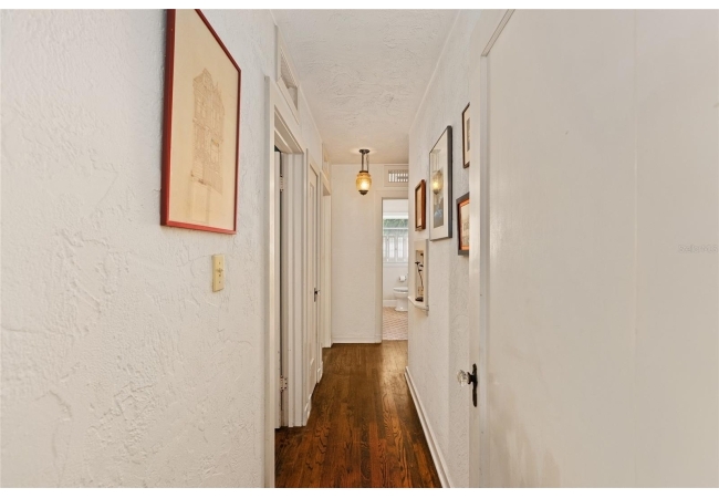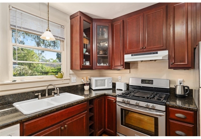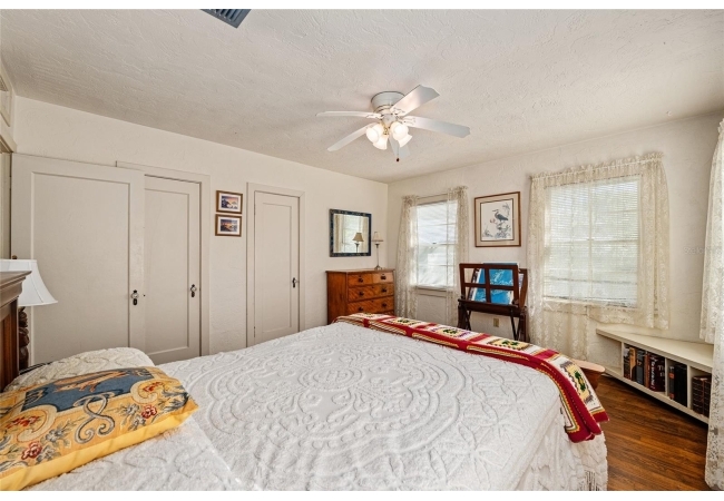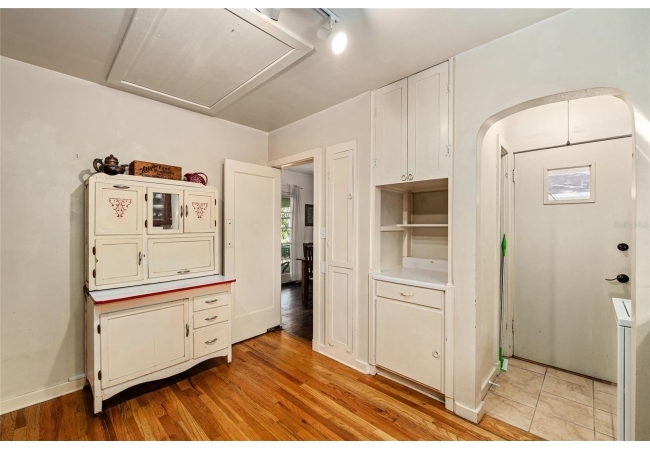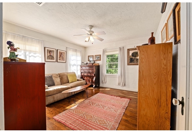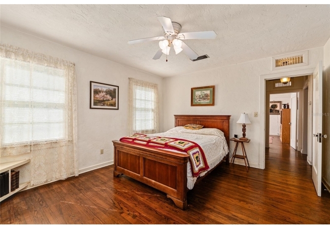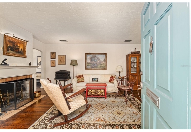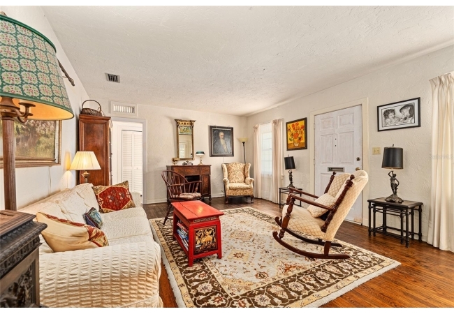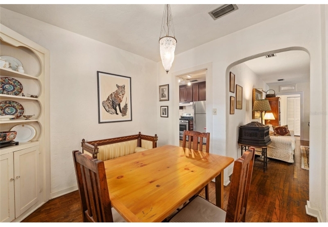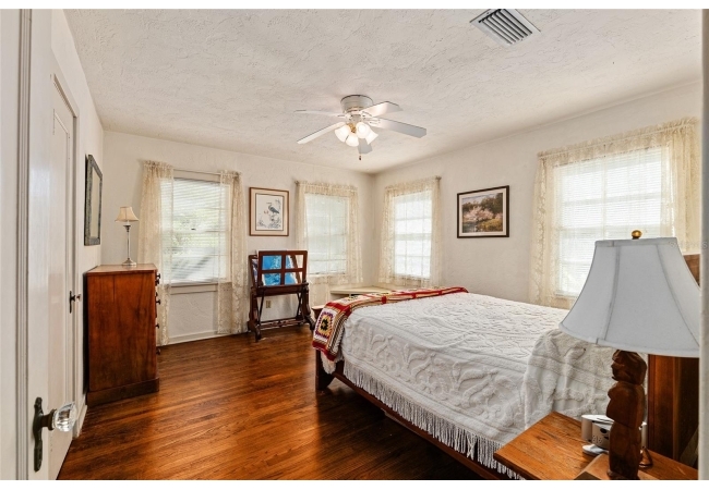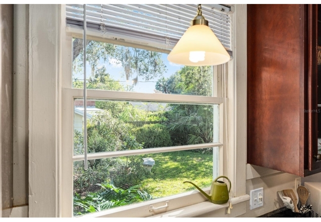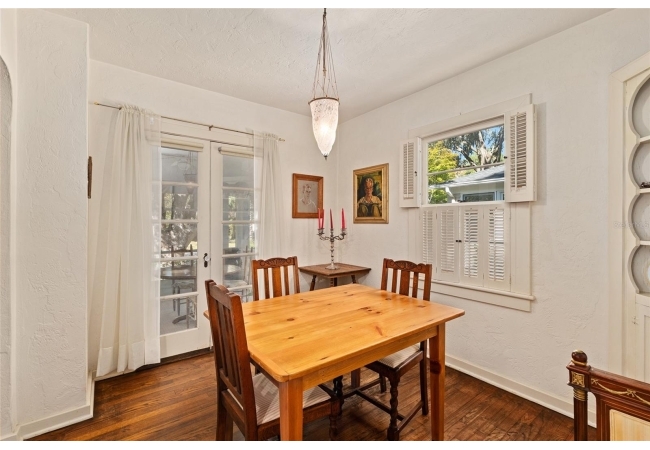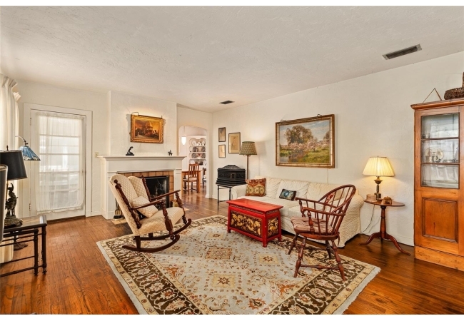 This Gainesville historical home, The Laird House, constructed by M Parrish, Jr., was originally built and sold to two sisters who wished to live next door to each other. As a result, in 1939, this charming cottage was constructed for approximately $5,000. Fast forward to 2017, this historic home was a subject of the notable City tour of homes featuring those built between 1881 to 1949, suggesting its significance to the City of Gainesville. Now is your opportunity to live in this historic home in the south-after Duckpond neighborhood. Through the years, the home was updated with the creation of an alcove and the then-new kitchen, insulation, wiring, and a detached 2-car garage, which is currently configured for a one car and a large workshop. The kitchen was remodeled in 2006, with various appliances replaced since then. More recent improvements include a 2025 garage roof, a 2023 main home roof, a 2025 water heater, and the piping into the walls of the kitchen, water heater, laundry alcove and bathroom have been replaced. A clean 4-point inspection for home owner’s insurance is available. Since the original homes’ family members lived side-by side, the house shares a driveway with the neighbor on the left. The shared driveway provides access to the detached 2-car garage, and to the side entry kitchen door, affording quick access to the house. The front of the home has a charming curbed step front entrance with iron front porch railings. Next to the front door is the Historic Gainesville Inc.’s plaque commemorating the Laird House establishment in 1939. Once inside, you are greeted with the home’s family room and its charming original wood floors. With its west-facing windows, this room is light and bright. On the left side of the room is the wood burning fireplace, and next to it, is the French door that opens onto the two-sided front screened porch. Walk through the family room, past the fireplace in to the separate dining space, which connects directly into the kitchen. Between the kitchen and the side entry door is the stacked washer and dryer, a small closet, and the new water heater. The front right corner of the home is the guest room, with the primary bedroom located in the back-right corner of the home. Both bedrooms share a full hallway bath with original tile flooring, double door cabinets for linen and bath storage, and a tub/shower combination. Next to the bath is the primary bedroom complete with four windows which overlook the rear and side yards. Next to the primary bedroom toward the kitchen, is a smaller room, which could be a 3rd bedroom, nursery, playroom or home office. The hallway connecting the kitchen the bedrooms and bath has two closets for additional storage. This .20-acre lot offers plenty of space for fun and play, while offering backyard privacy with its mature landscaping. If you’re looking to reduce your driving time, this Duckpond home is less than 6 minutes by car from downtown Gainesville, where you will find restaurants, the Courthouse, the city library, the Hippodrome and night lift. If you are a frequent commuter or avid traveler, the Gainesville airport is just 9 minutes away. Travel to UF Health, or to UF’s campus or stadiums, in the same amount of time. Lined with mature trees scattered in between 19th and early 20th century homes, the Duckpond offers an established community with sidewalks and charm throughout the neighborhood, all within the true heart of Gainesville.