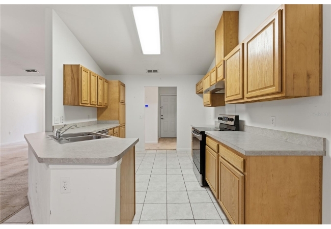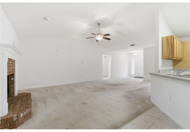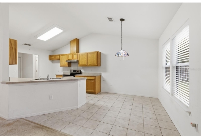 As you enter, you’re welcomed by cathedral ceilings and a bright, open living area with space for formal dining. To the right, a hallway leads to two comfortable guest bedrooms and a full bath with a tub/shower combo. The kitchen overlooks the living room and includes a cozy breakfast nook, perfect for casual meals or morning coffee.