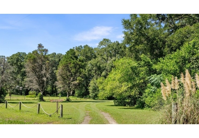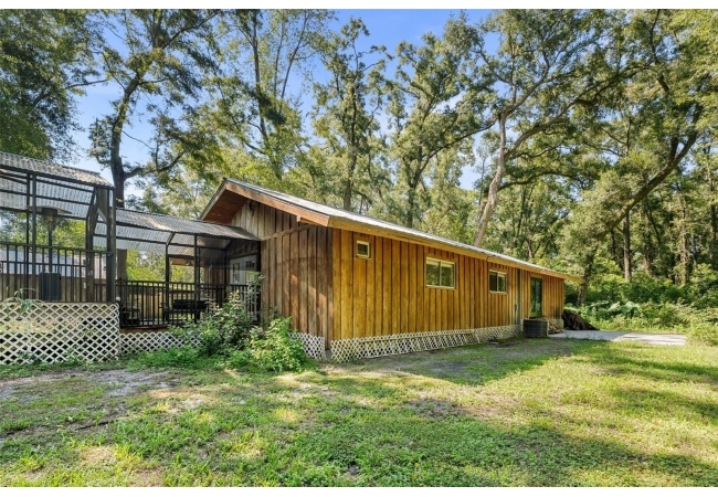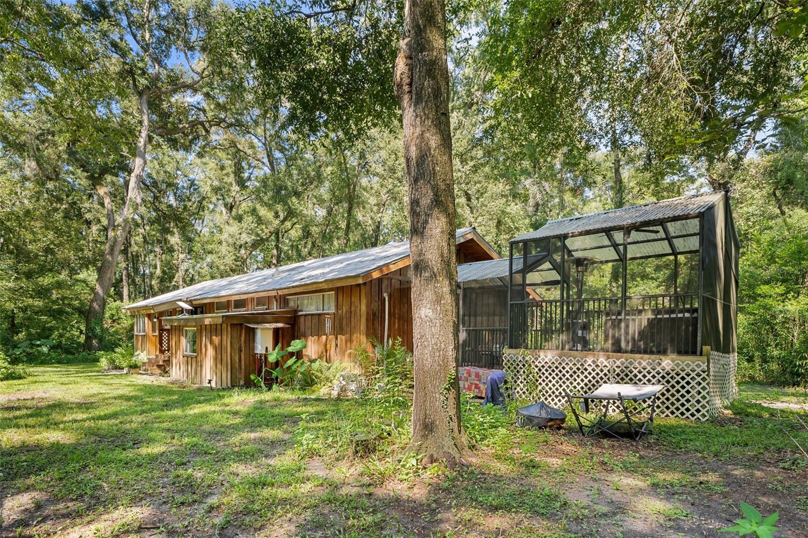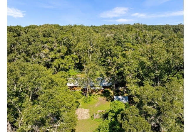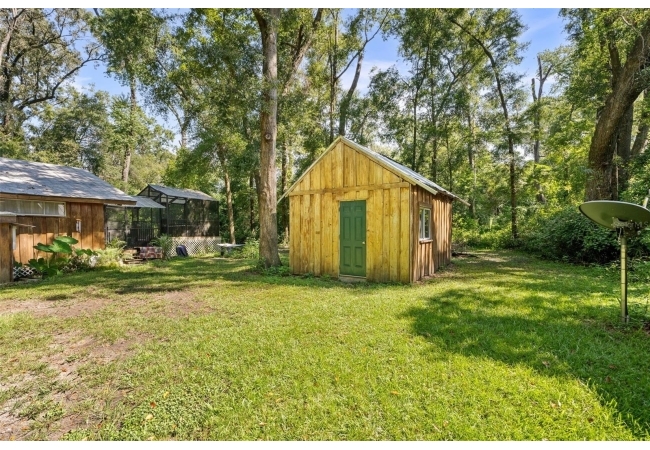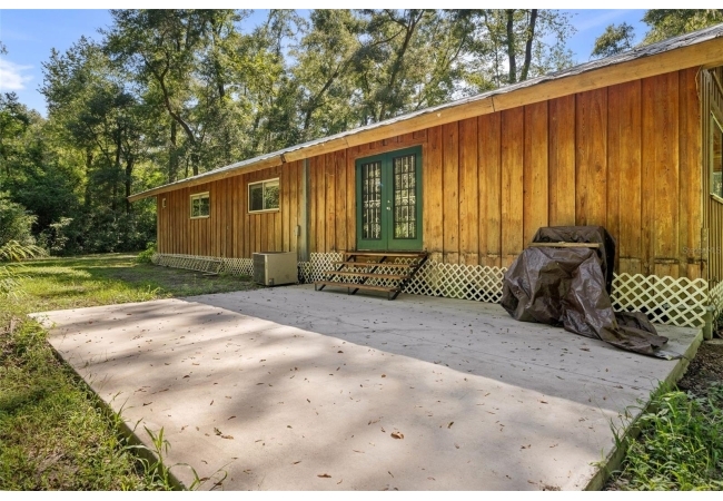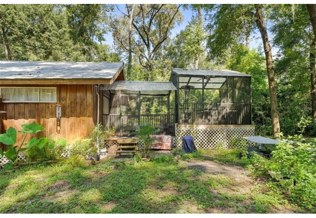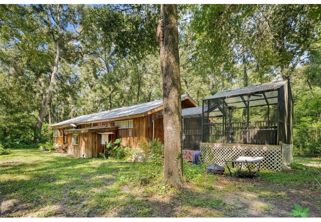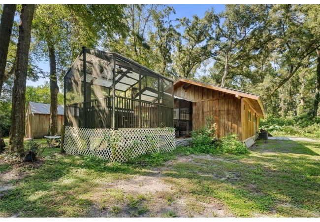 Assumable mortgage at a low 2.7 rate, pay only $800/month covering 1/2 the purchase price, if you can bring $170K cash. Craftsman’s Cypress Retreat on 5 Acres. This one of a kind 3 Bed, 2Bath, home was constructed almost entirely of old-growth milled cypress wood, offering timeless quality and rare craftsmanship. Step inside and you’ll be greeted by vaulted tongue-and-groove ceilings, refinished heart pine wood floors, and expansive windows showcasing the surrounding nature. The elevated layout and wooded views give the home a treehouse-like feel, offering both privacy and peace. The spacious primary suite, currently used as a successful Airbnb, opens to a screened wood deck with a hot tub—the perfect setting to unwind in your private oasis. The kitchen features solid wood cabinetry, granite countertops, and a gas stove. The living room has built-in bookshelves, all lovingly maintained. The three bedroom closets are lined with cedar, a thoughtful detail that speaks to the home’s enduring quality. A detached cypress-built shed adds valuable space for a workshop or extra storage. The laundry room is off the main home in a large utility room with  3 commercial grade stainless steel sinks. Tucked away, but minutes from downtown Alachua, shopping, dining, and parks.  It has only had two owners since it was custom-built in 1991. Enjoy this hideaway where natural beauty, privacy, and convenience come together.