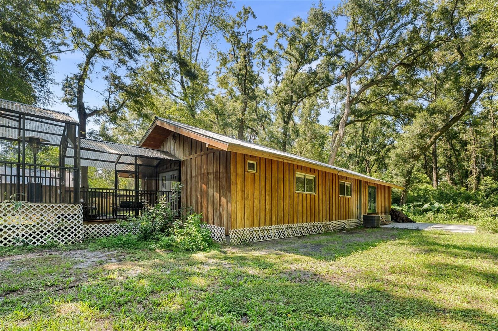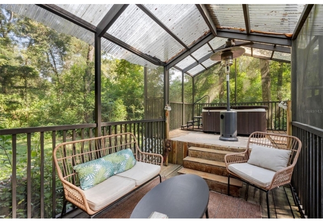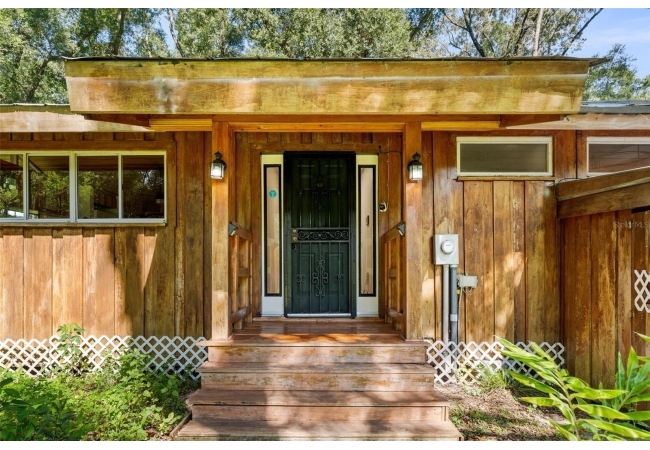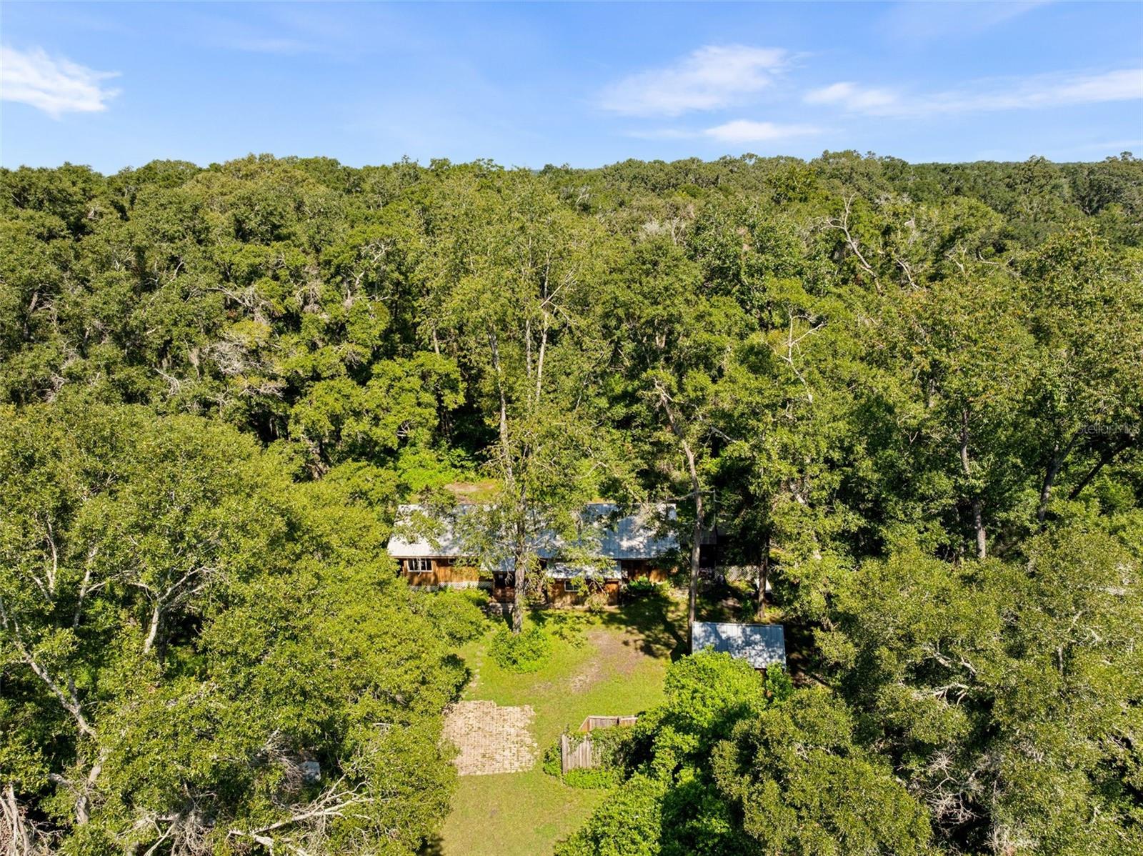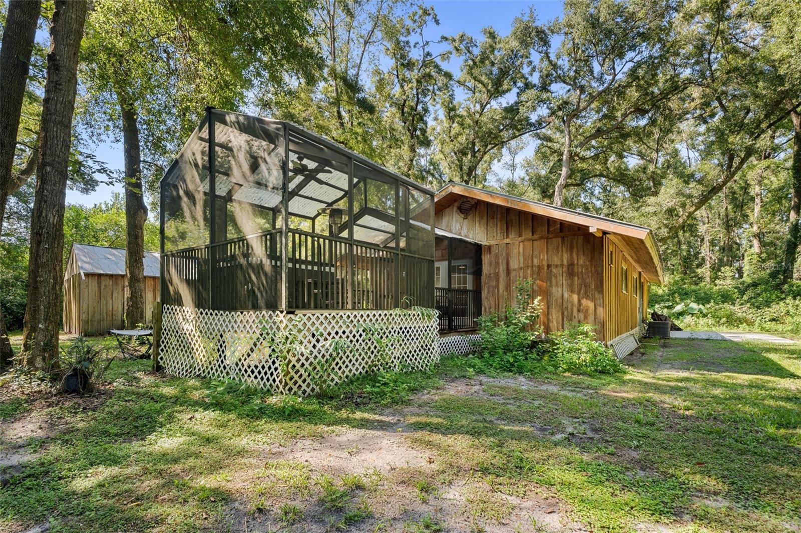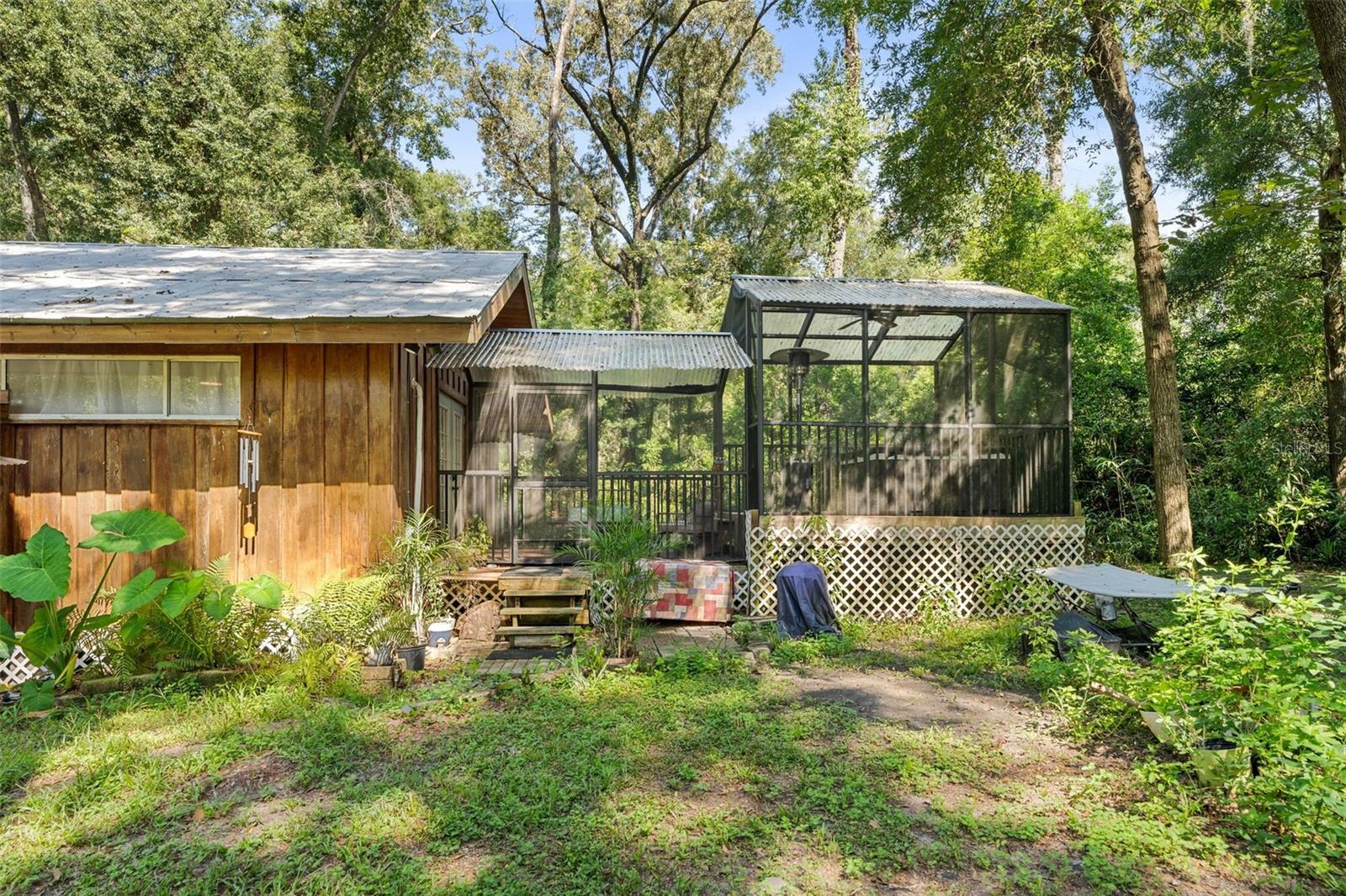 Assumable mortgage at a low 2.7 rate, pay only $800/month covering 1/2 the purchase price, if you can bring $170K cash. Craftsman’s Cypress Retreat on 5 Acres. This one of a kind 3 Bed, 2Bath, home was constructed almost entirely of old-growth milled cypress wood, offering timeless quality and rare craftsmanship. Step inside and you’ll be greeted by vaulted tongue-and-groove ceilings, refinished heart pine wood floors, and expansive windows showcasing the surrounding nature. The elevated layout and wooded views give the home a treehouse-like feel, offering both privacy and peace. The spacious primary suite, currently used as a successful Airbnb, opens to a screened wood deck with a hot tub—the perfect setting to unwind in your private oasis. The kitchen features solid wood cabinetry, granite countertops, and a gas stove. The living room has built-in bookshelves, all lovingly maintained. The three bedroom closets are lined with cedar, a thoughtful detail that speaks to the home’s enduring quality. A detached cypress-built shed adds valuable space for a workshop or extra storage. The laundry room is off the main home in a large utility room with  3 commercial grade stainless steel sinks. Tucked away, but minutes from downtown Alachua, shopping, dining, and parks.  It has only had two owners since it was custom-built in 1991. Enjoy this hideaway where natural beauty, privacy, and convenience come together.