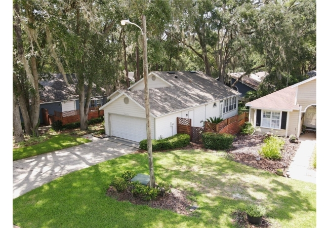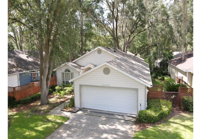 Turnkey Home in Highly Desirable Patio Homes of West End! This home comes with fantastic community amenities including a pool, club house, tennis court, walking trails, and front lawn maintenance. While boasting a very low $85 a month HOA fee. Another benefit is Clay Electric is the power provider, providing lower rates. New Roof 2025! Fenced back yard. Open floor plan with high ceilings in the living area. As you walk in the front door, opens to Great Room, Guest bedroom at front left of the house w/guest bath, master suite at back of house. Kitchen is open & spacious with eat in dining area. Plenty of storage & cabinets throughout the home. First class enclosed Florida Room just off of the living area to the right of the home w/separate AC. Large 2 Car finished garage with side exit door. This home provides that cozy cottage home feel! Home is move in ready! Great location with short commute to UF, Santa Fe College, Shands & North Florida Hospitals, shopping, & restaurants. A must see!