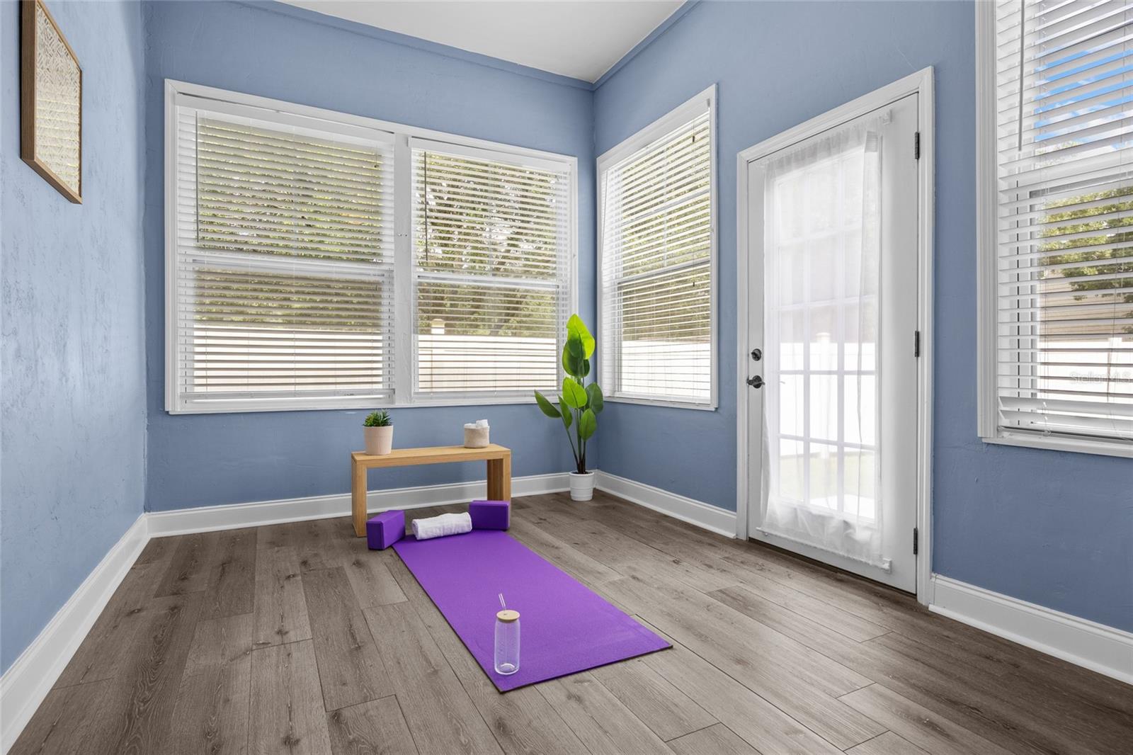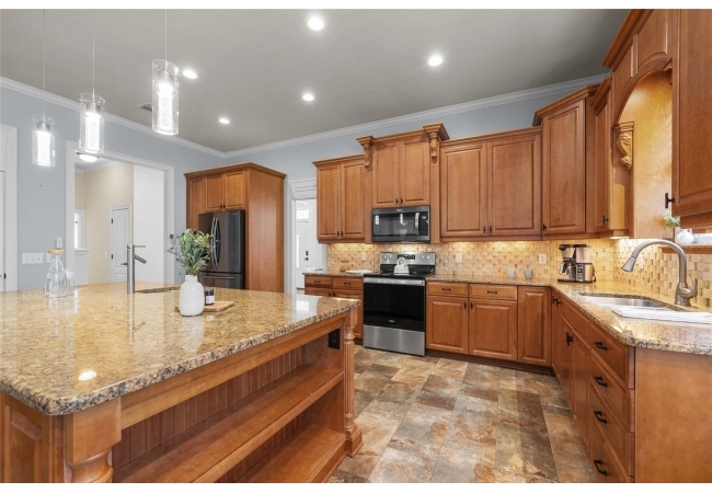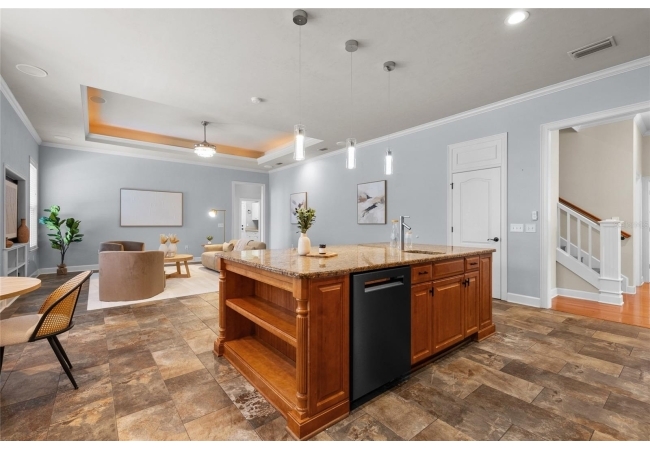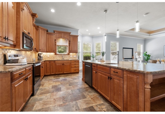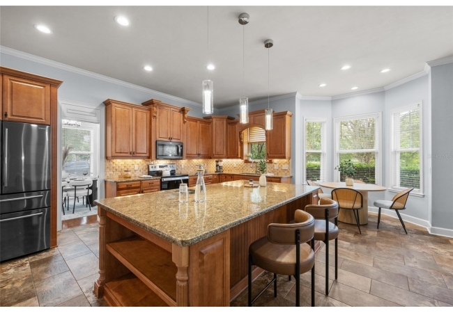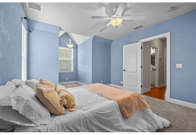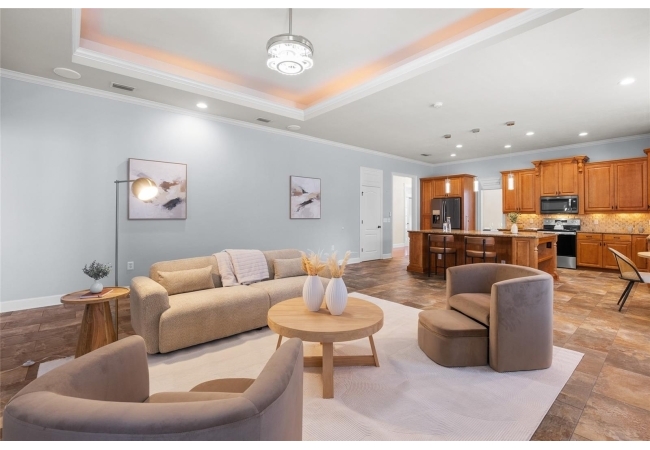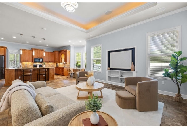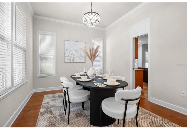 Charming Town of Tioga Home on a Premier Corner Lot! Step into this Pridgen-built residence, perfectly situated on a coveted corner lot next to a tranquil retention area—offering added privacy and open green views. Located in the vibrant and golf-cart-friendly Town of Tioga, this home blends timeless style with modern comfort. With a versatile layout offering 5 bedrooms and 3 full baths—or 4 bedrooms plus a dedicated home office—this property is designed to adapt to your lifestyle. From the inviting foyer, you'll find a formal dining room that sets the stage for memorable gatherings. The open-concept kitchen, featuring an oversized pantry and casual dining space, flows effortlessly into the spacious family room, creating a warm and welcoming hub for daily living and entertaining. The primary suite is quietly positioned at the rear of the home and serves as a true retreat, complete with a generous walk-in closet and spa-like ensuite bath. Two additional bedrooms and a full bath are located on the main level—one currently styled as a functional office. Upstairs, two oversized bedrooms share a third full bath, ideal for guests or family members. Thoughtful upgrades include granite counters, rich wood flooring in some living areas, durable tile in the kitchen and family room, and custom built-ins that add character and function. Enjoy year-round outdoor living with a charming front porch and porch swing, along with a spacious enclosed rear patio—perfect for an additional living area, fitness space, or reading nook. This convenient location is just moments from Tioga Town Center’s restaurants, boutiques, fitness studios, and community events, and less than five miles from I-75 for easy access to Gainesville and nearby cities. Offering the perfect blend of sophistication, flexibility, and location, this exceptional home is ready to welcome its next owners.
