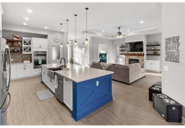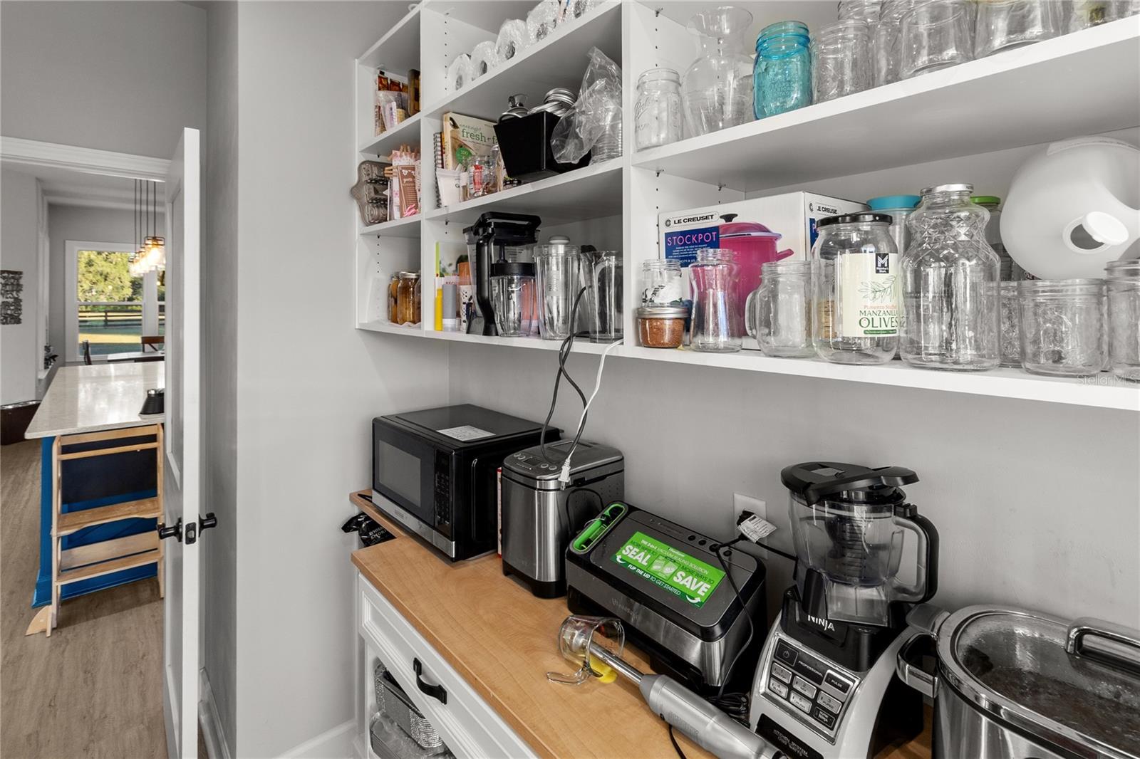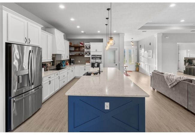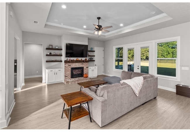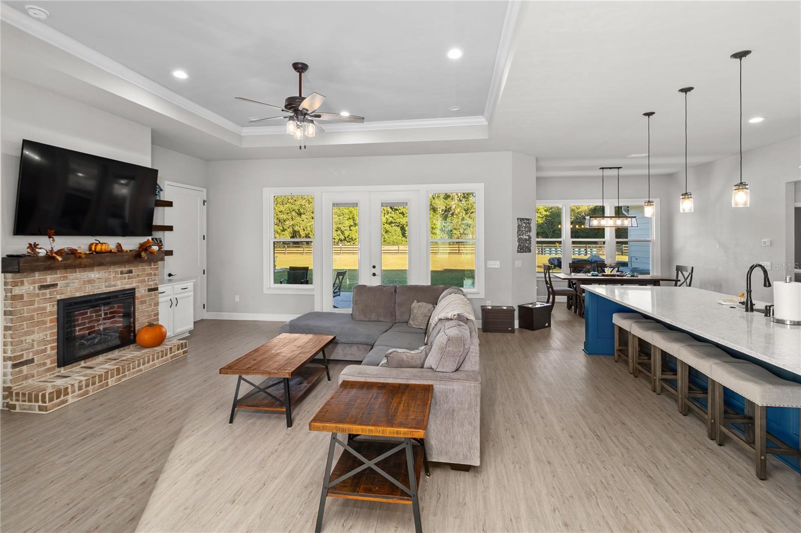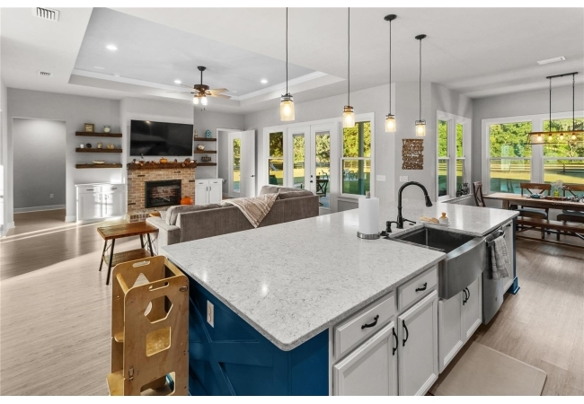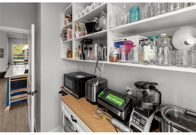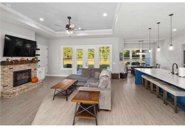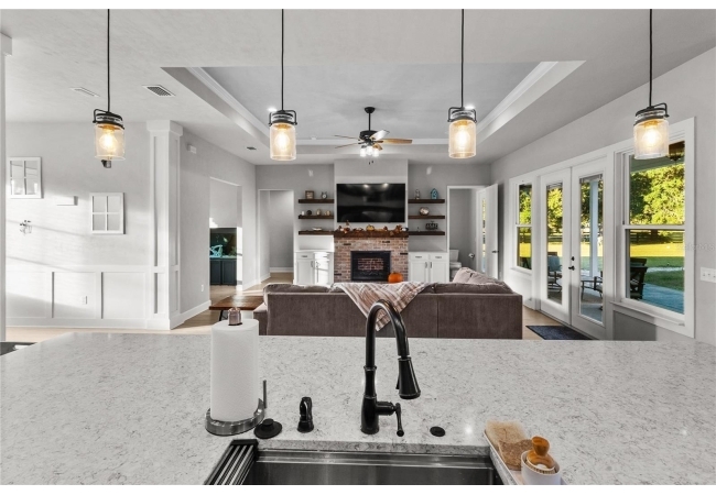 The gourmet kitchen serves as the centerpiece of the home, designed for both function and beauty. It features a fourteen-foot island with quartz countertops, a deep stainless-steel sink, custom hood, soft-close cabinetry, and under-cabinet lighting. A built-in coffee and wine bar adds convenience and style, while the separate butler-style pantry with butcher block counters and floor-to-ceiling shelving provides additional workspace and storage. Natural light pours into the living and dining areas, highlighting a brick fireplace, built-in shelves, and wide views of the surrounding property through oversized windows and French doors that open to the covered back porch.