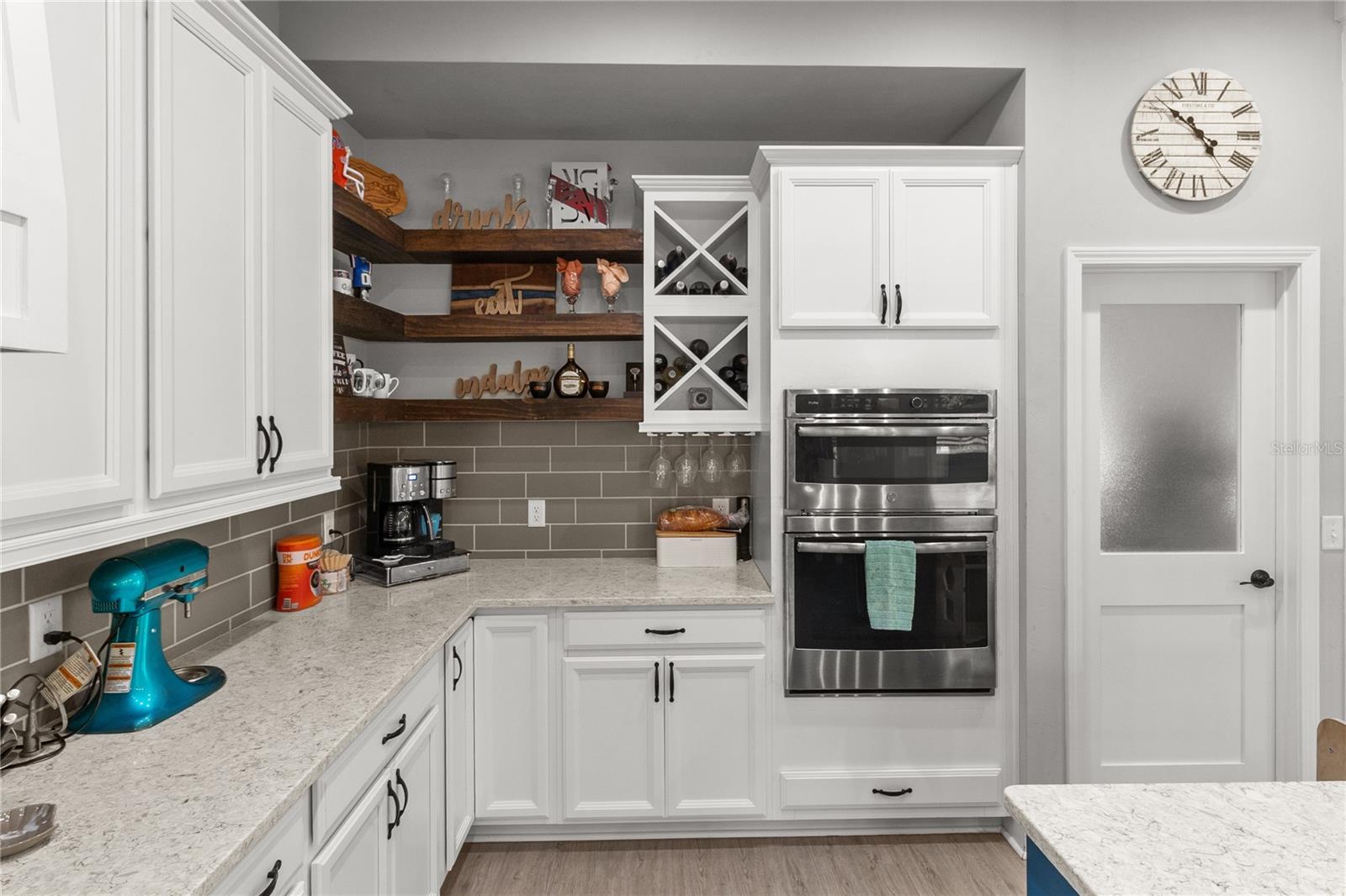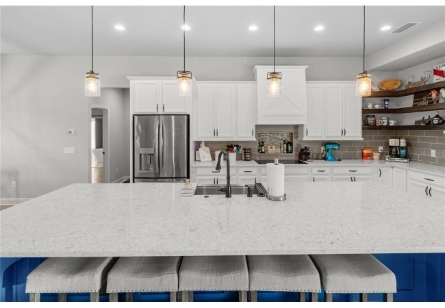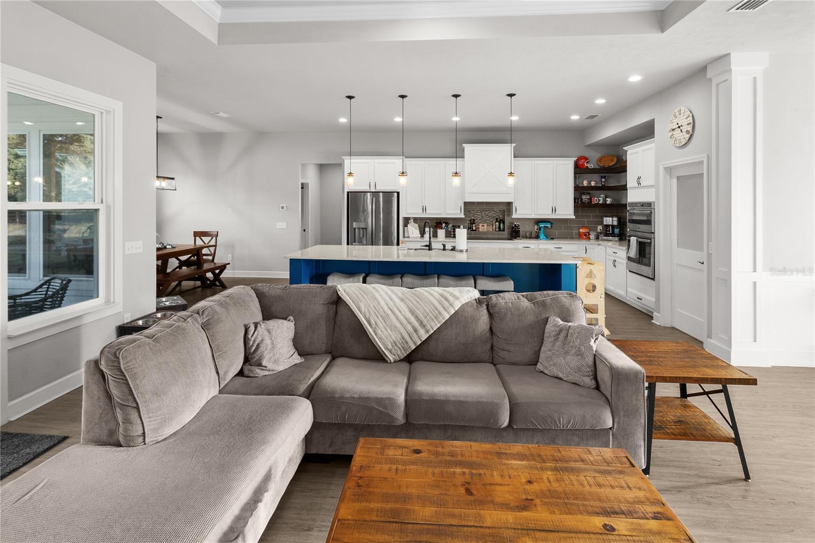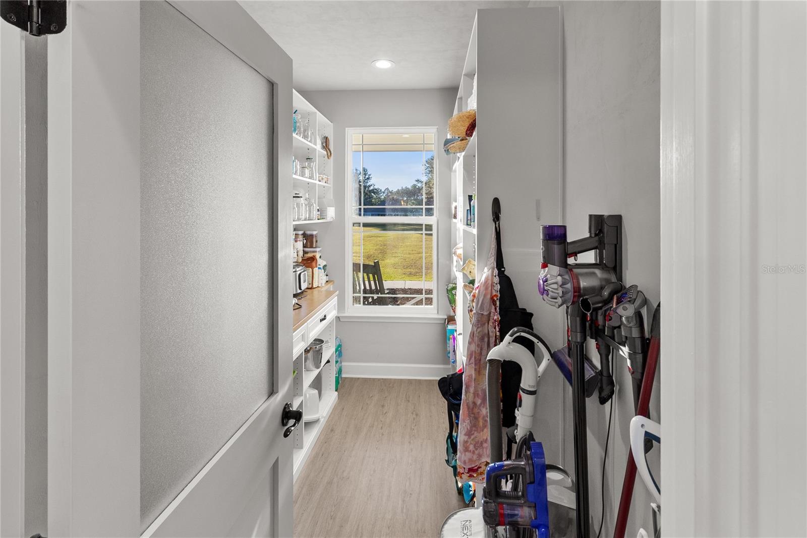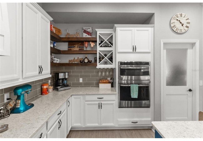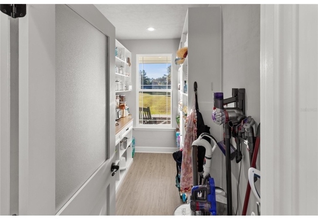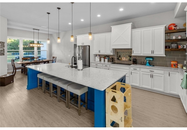 The gourmet kitchen serves as the centerpiece of the home, designed for both function and beauty. It features a fourteen-foot island with quartz countertops, a deep stainless-steel sink, custom hood, soft-close cabinetry, and under-cabinet lighting. A built-in coffee and wine bar adds convenience and style, while the separate butler-style pantry with butcher block counters and floor-to-ceiling shelving provides additional workspace and storage. Natural light pours into the living and dining areas, highlighting a brick fireplace, built-in shelves, and wide views of the surrounding property through oversized windows and French doors that open to the covered back porch.