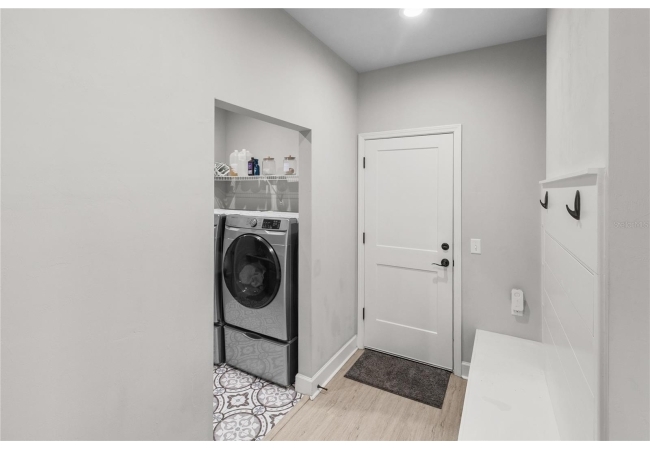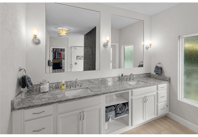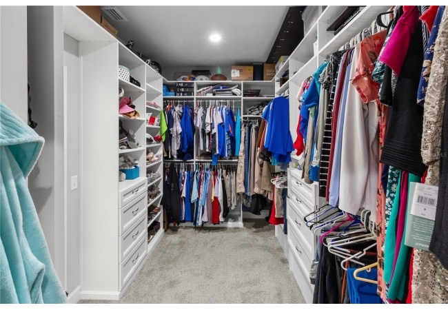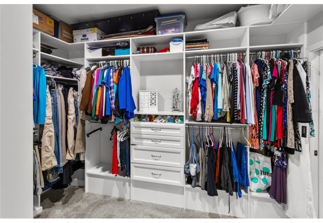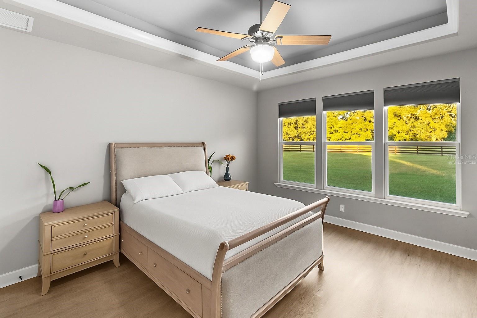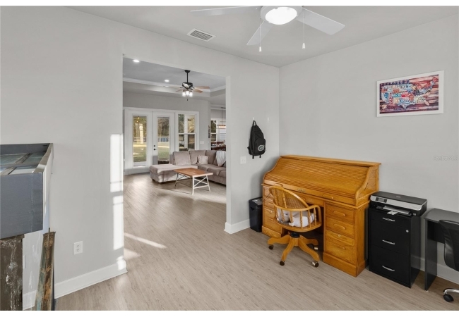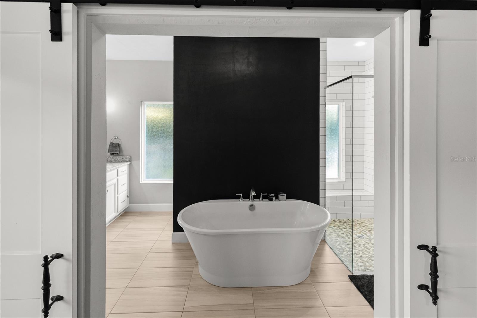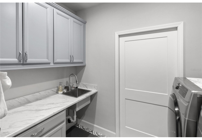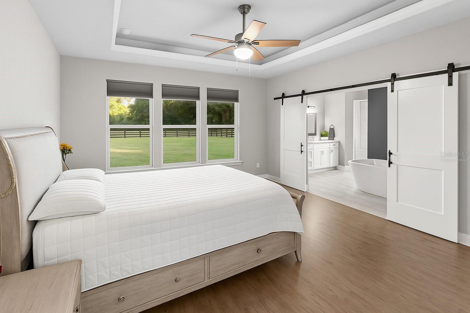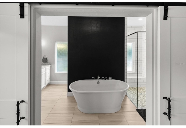 The primary suite feels like a private retreat, featuring a tray ceiling, a spa-style bath with a freestanding soaking tub, dual shower, and a fully custom walk-in closet with built-in drawers, shelving, and hidden storage. Two additional bedrooms share a full guest bathroom with a single vanity and elegant finishes. An office or flex space with a closet, a large laundry room with a utility sink, a half bath with both indoor and outdoor access, and a dedicated mudroom offer versatility and comfort for daily living. The three-car garage provides generous storage and space for vehicles, equipment, and hobbies.