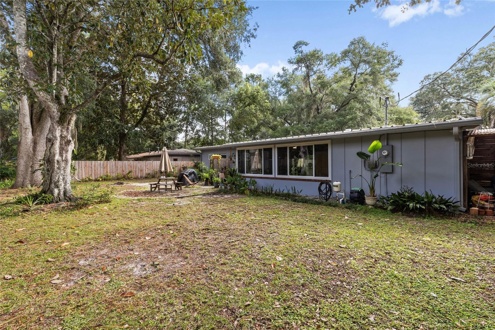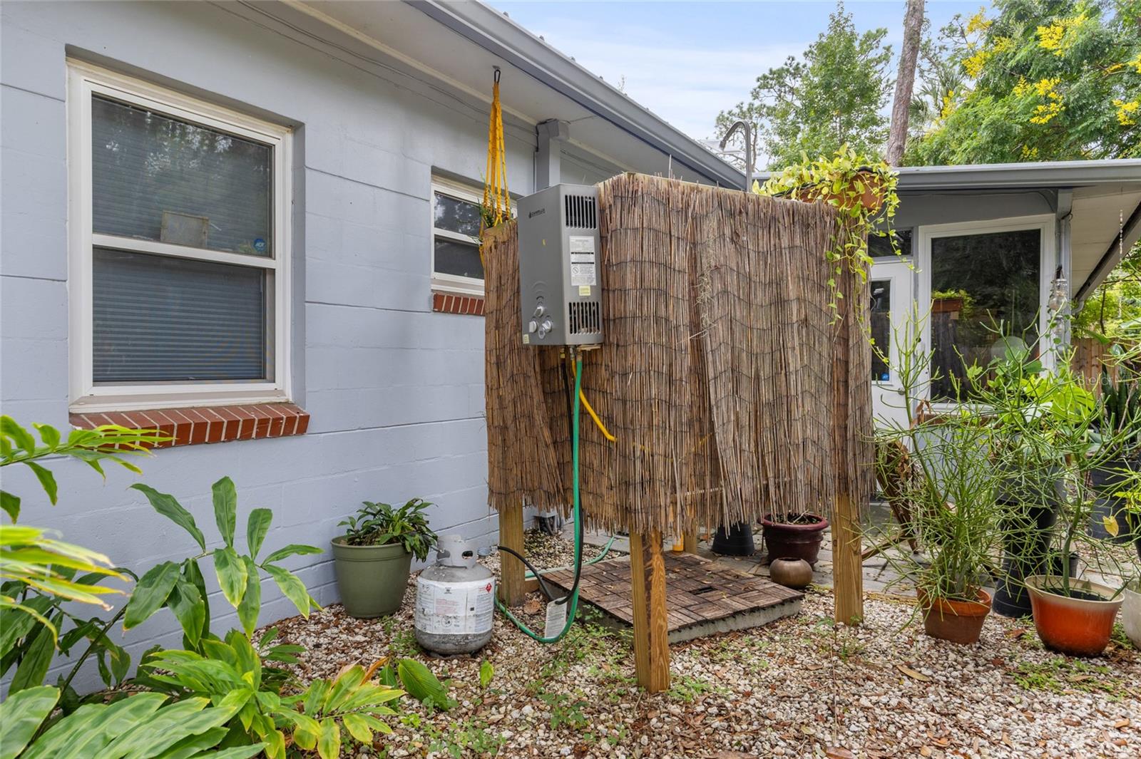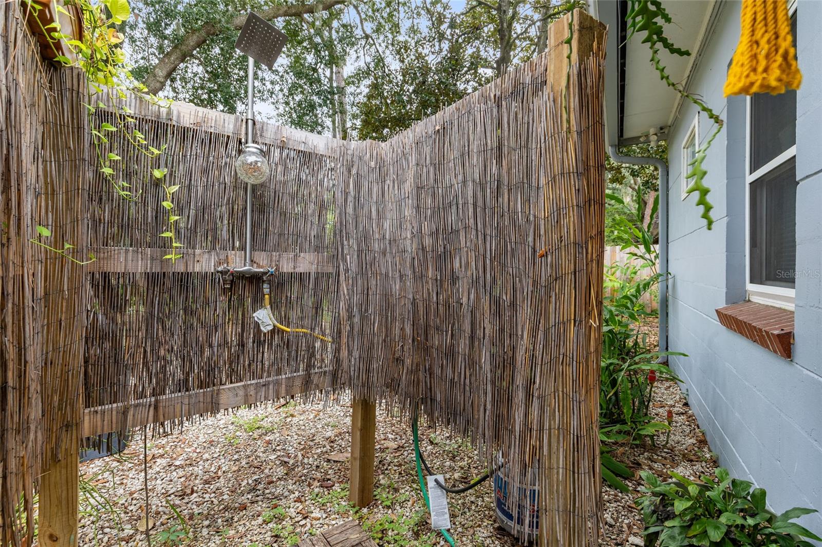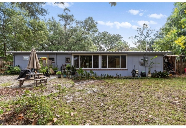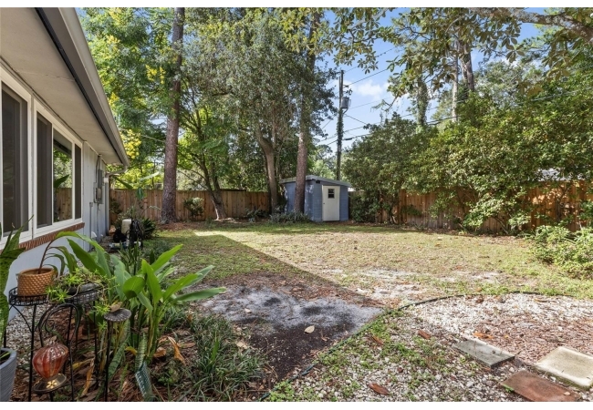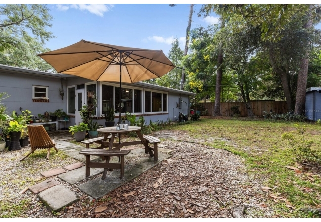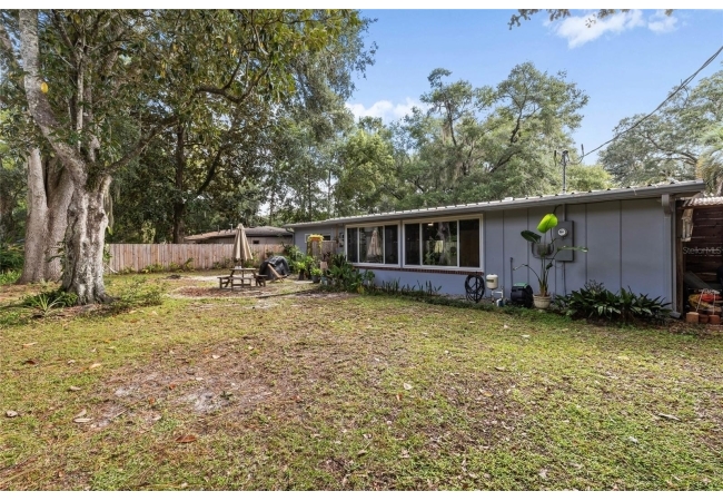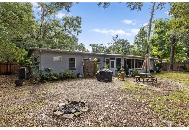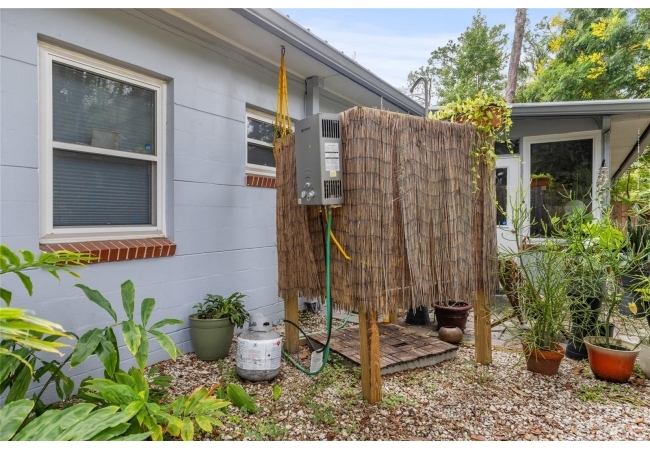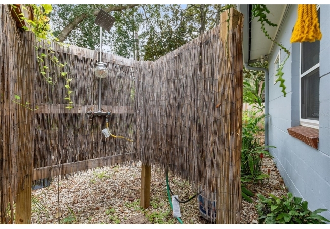 From the kitchen, a door opens to the Florida room, lined with windows so you can enjoy the outdoors year-round. Outside, the huge fully fenced backyard is perfect for pets, gardening, or entertaining around the fire pit, and yes, there’s even a gas-heated outdoor shower for a true Florida touch.