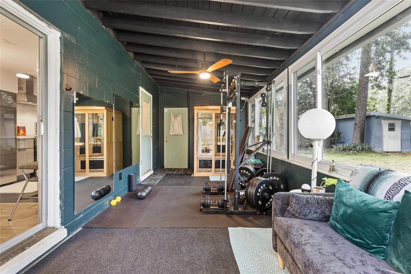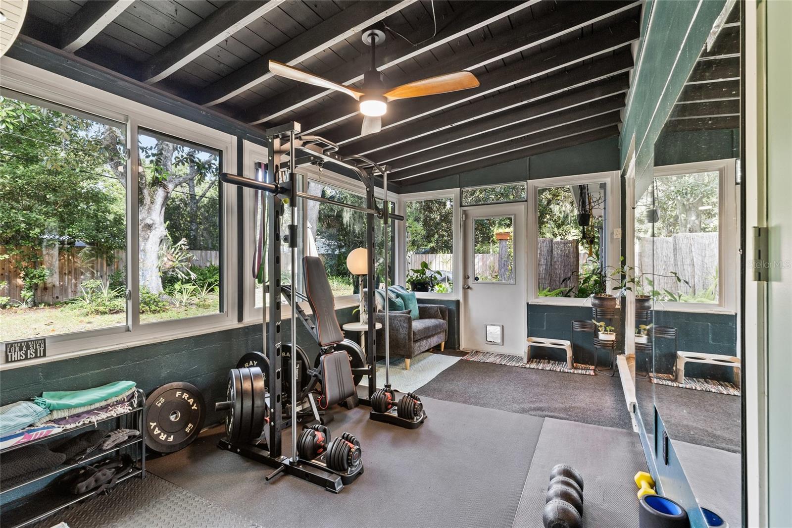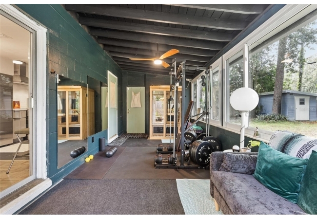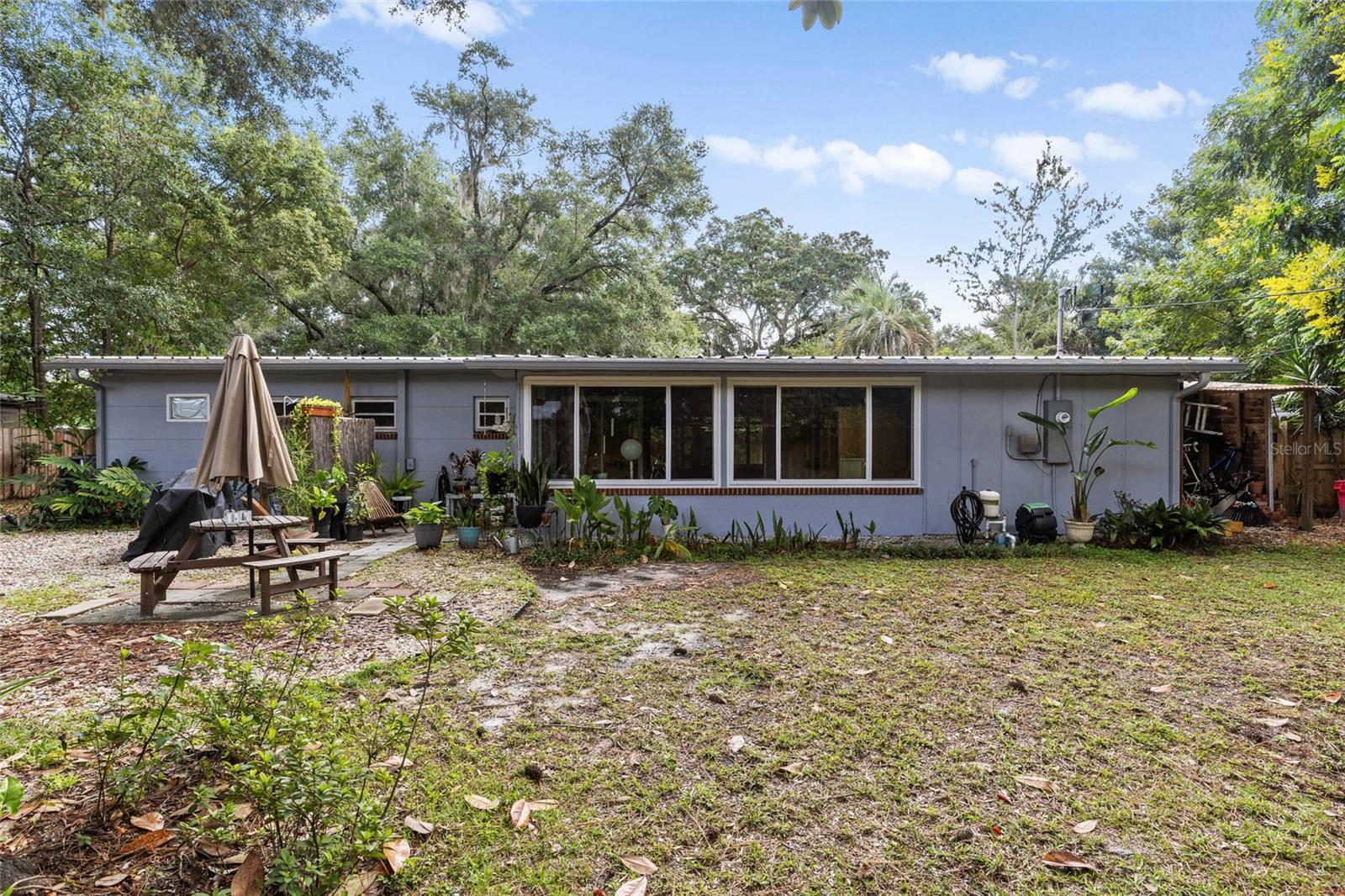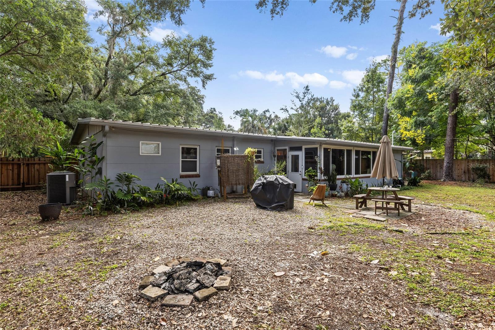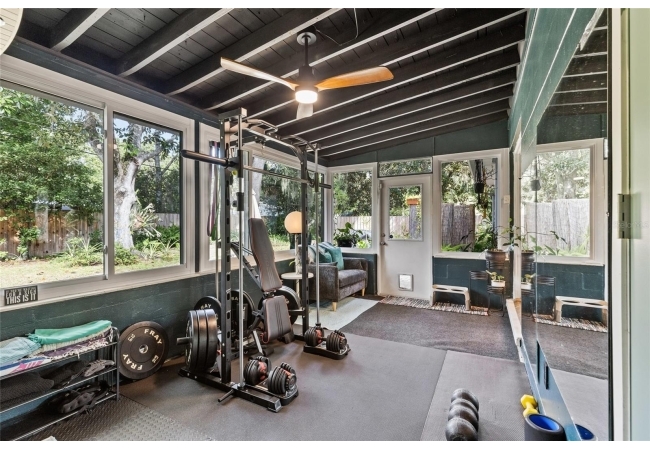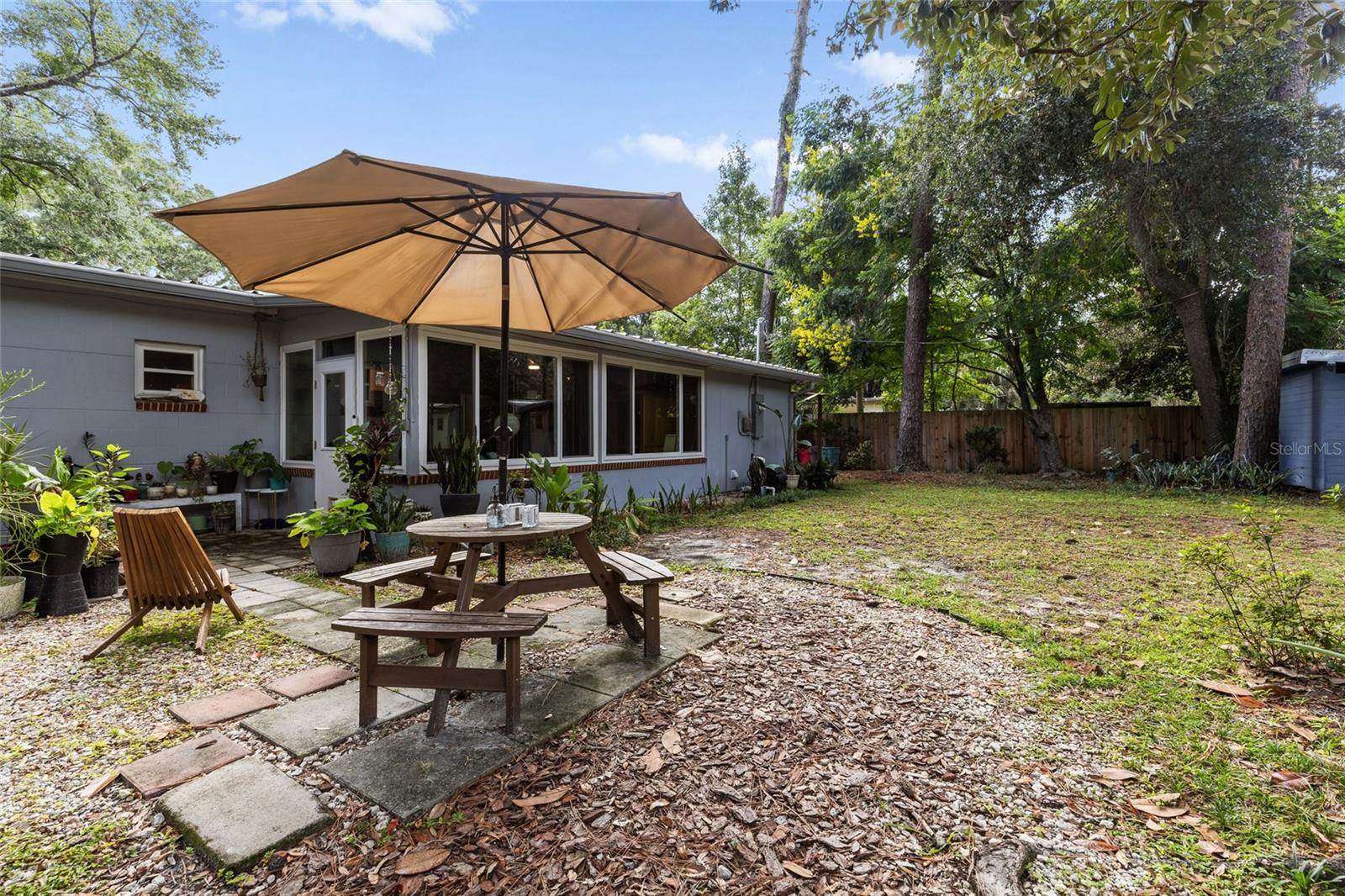From the kitchen, a door opens to the Florida room, lined with windows so you can enjoy the outdoors year-round. Outside, the huge fully fenced backyard is perfect for pets, gardening, or entertaining around the fire pit, and yes, there’s even a gas-heated outdoor shower for a true Florida touch.