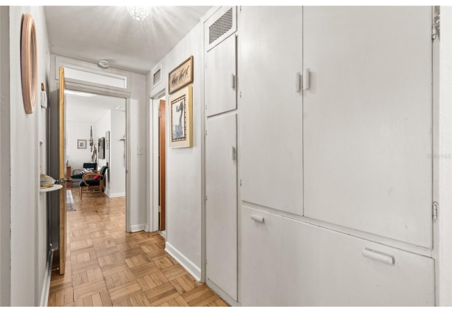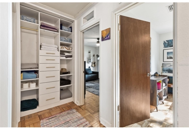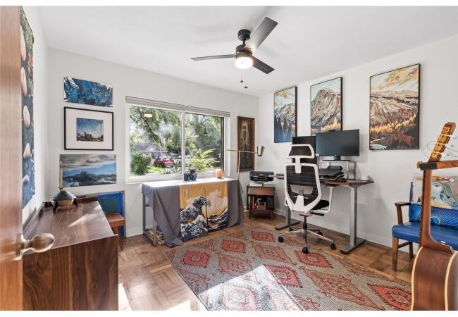 The private wing of the home offers ample storage with built-in shelving along the hallway. Two spacious guest bedrooms feature slider windows that let in plenty of light, while the guest bath has been thoughtfully reimagined in true mid-century style, complete with porcelain sinks, vintage tilework, and a retro tub.