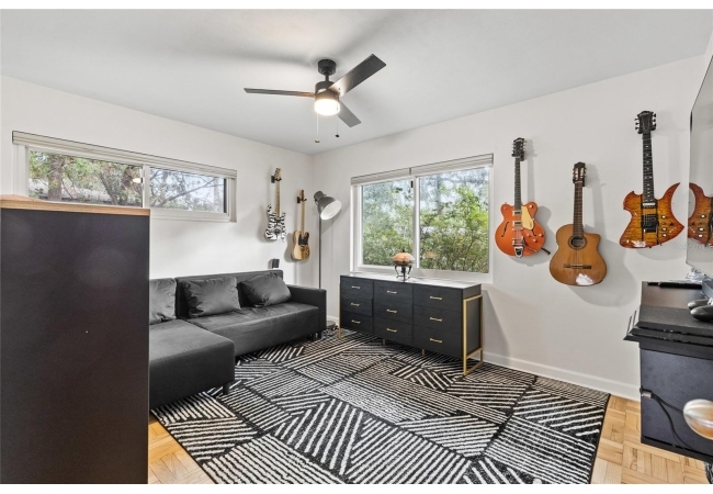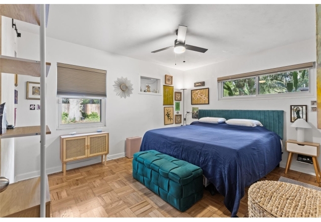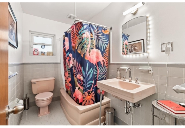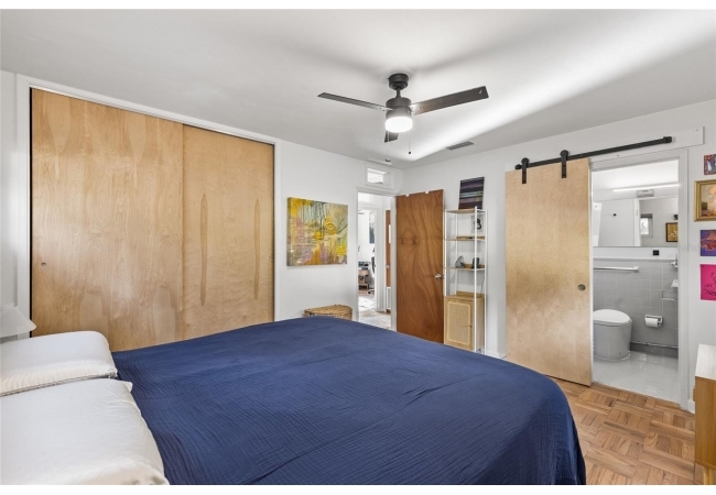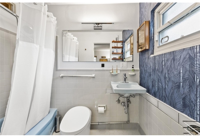 The primary suite is a true retreat, offering its own ensuite bathroom that mirrors the retro charm of the guest bath while adding a touch of luxury with a spa-style toilet. The bedroom features one window overlooking the backyard and a transom window for extra light and privacy.