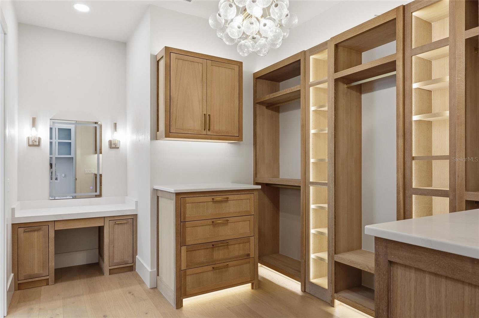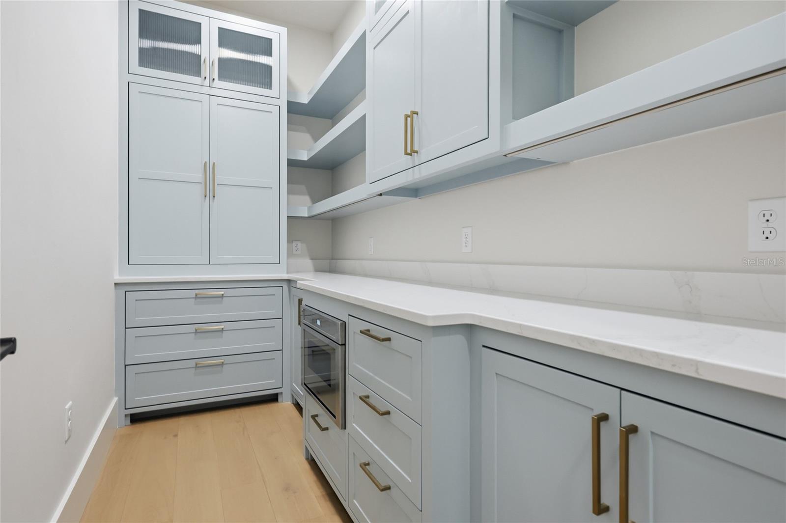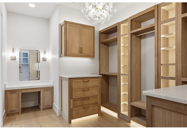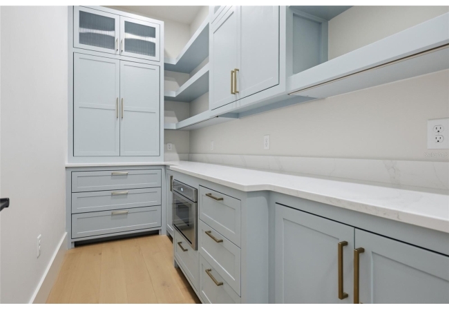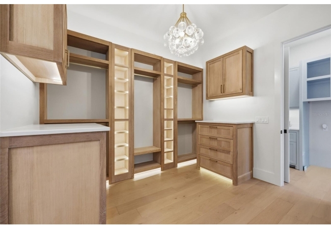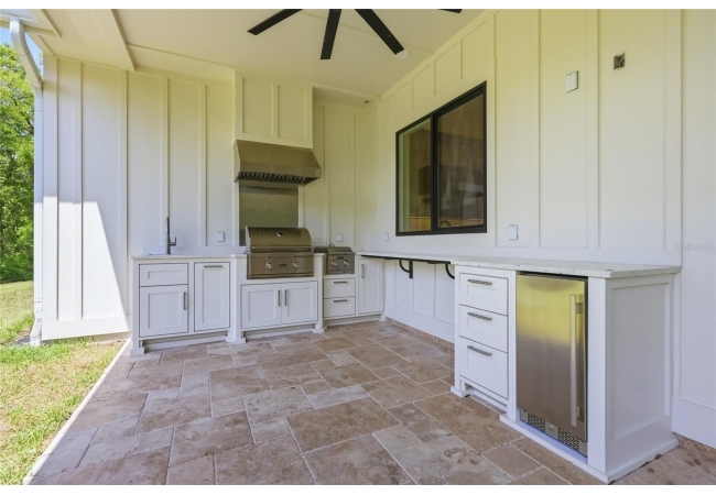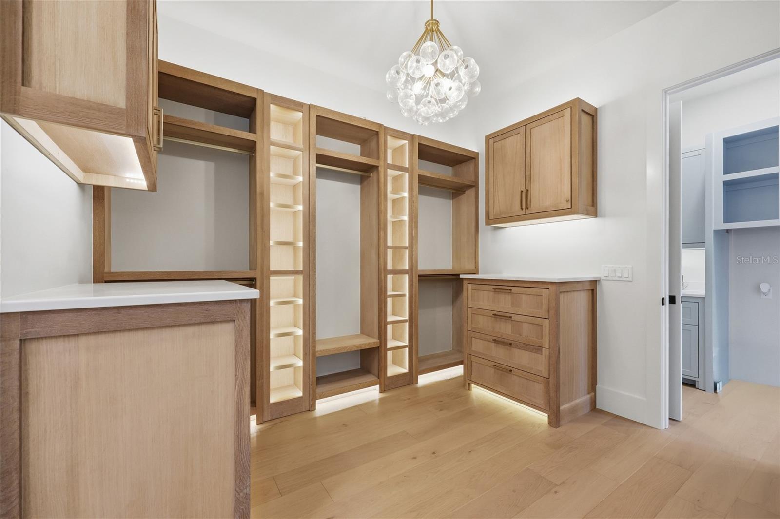 At the center of the home, the kitchen is designed to impress with upgraded Thermador appliances, custom solid wood cabinetry throughout, and thoughtful design details including reeded glass accents, illuminated cabinetry, and toe-kick lighting. A dedicated beverage nook or wine bar with sink and bar refrigerator adds another layer of functionality and style. The adjacent summer kitchen, complete with a pass-through window, creates a seamless indoor-outdoor living experience perfect for entertaining.