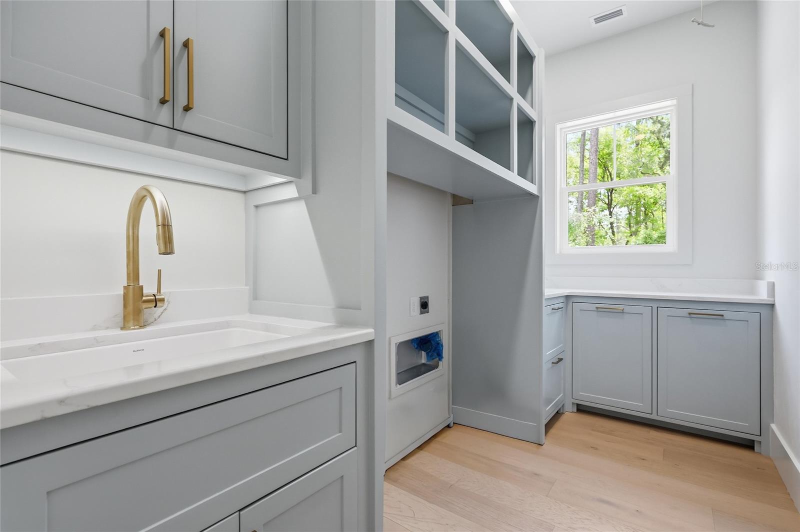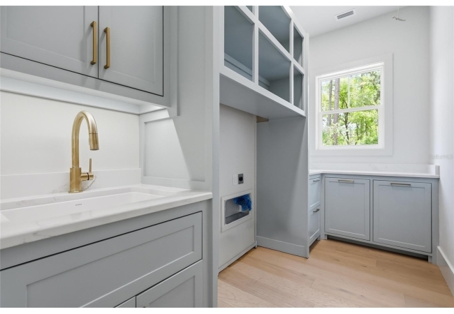 Architectural character continues with vaulted, beamed ceilings and elevated finishes throughout, including champagne gold plumbing fixtures and all Pella windows and doors. Built with performance and efficiency in mind, the home features 2x6 exterior walls, spray foam insulation, two HVAC systems, and two gas water heaters. Additional upgrades include a built-in internal vacuum system with hide-a-hose, prewiring for sound, security, and a centralized media closet, as well as a Generac generator switch already prepped and ready. The garage is equally well-appointed with a utility sink for added convenience.