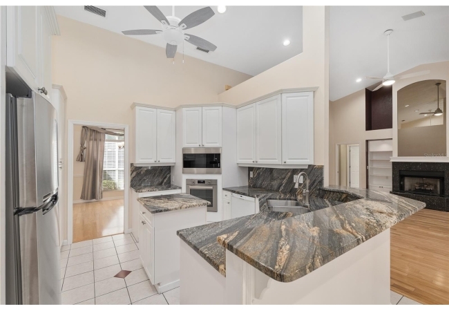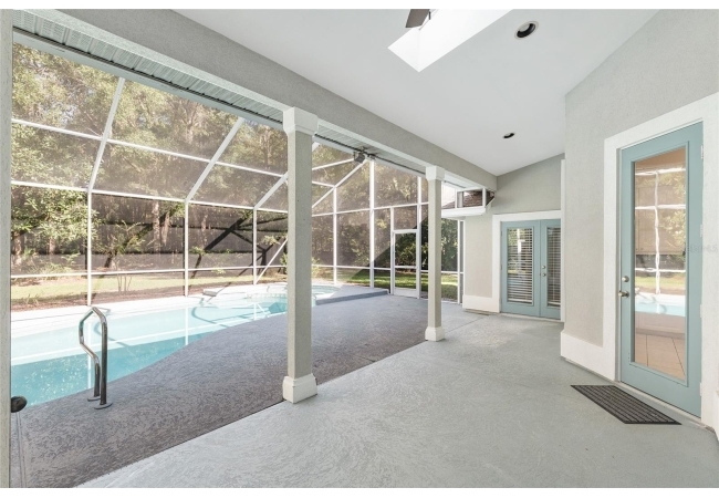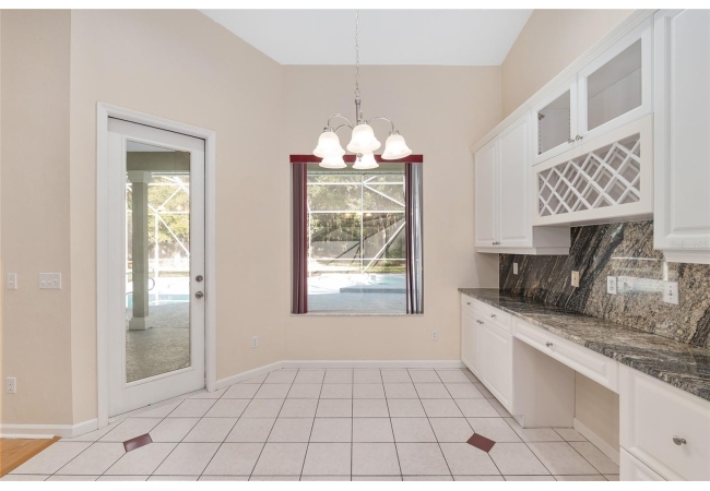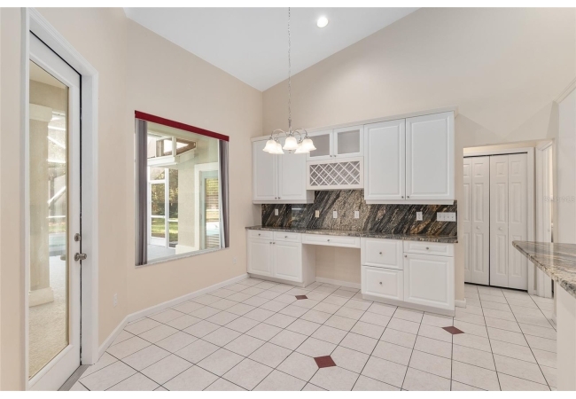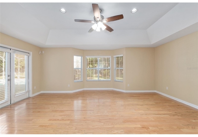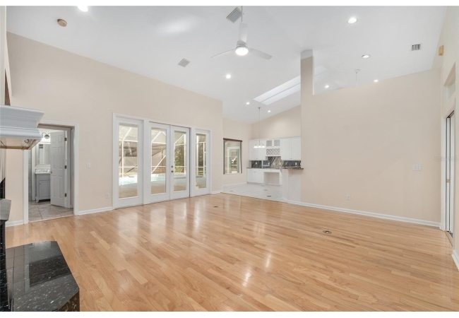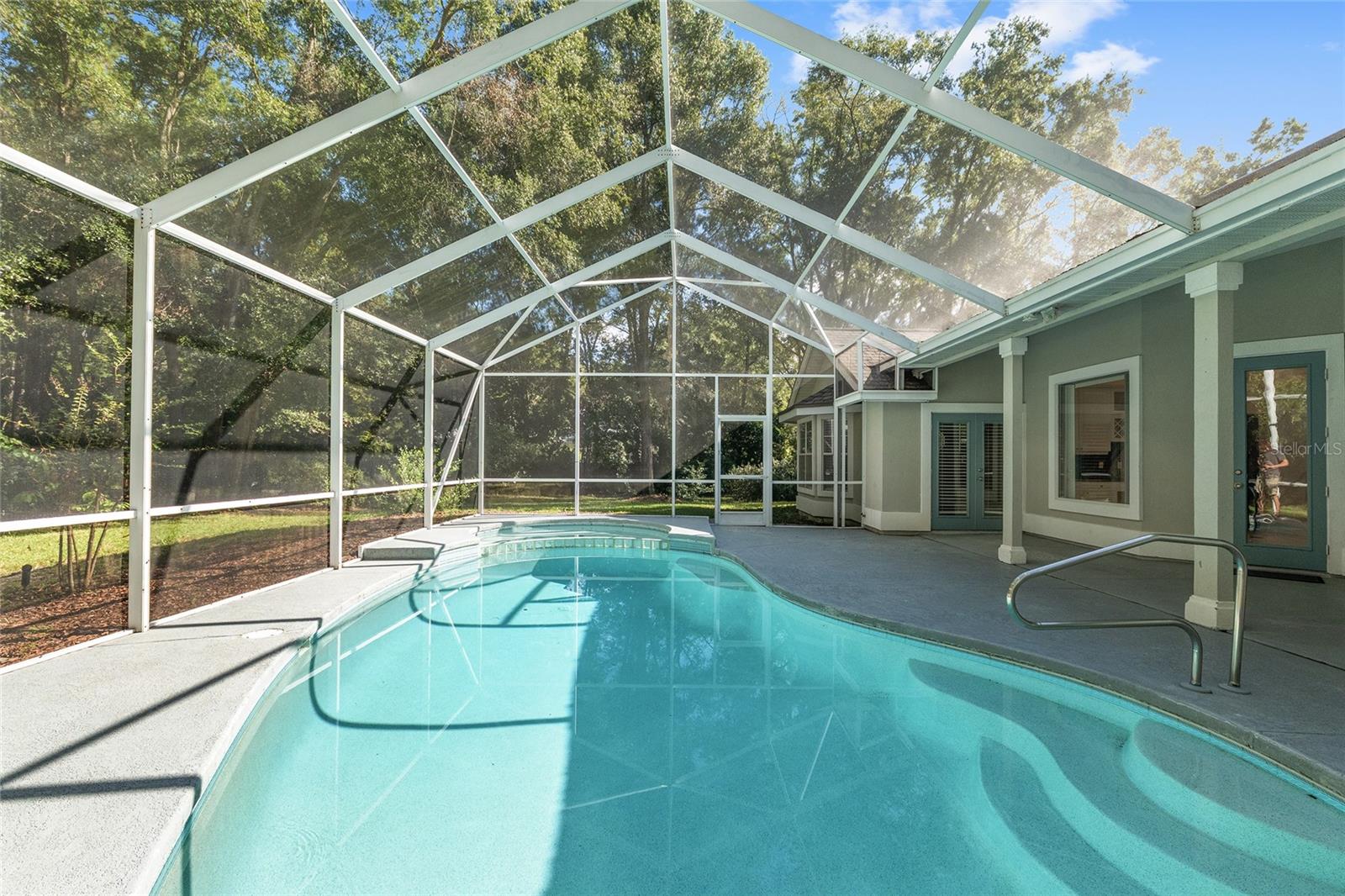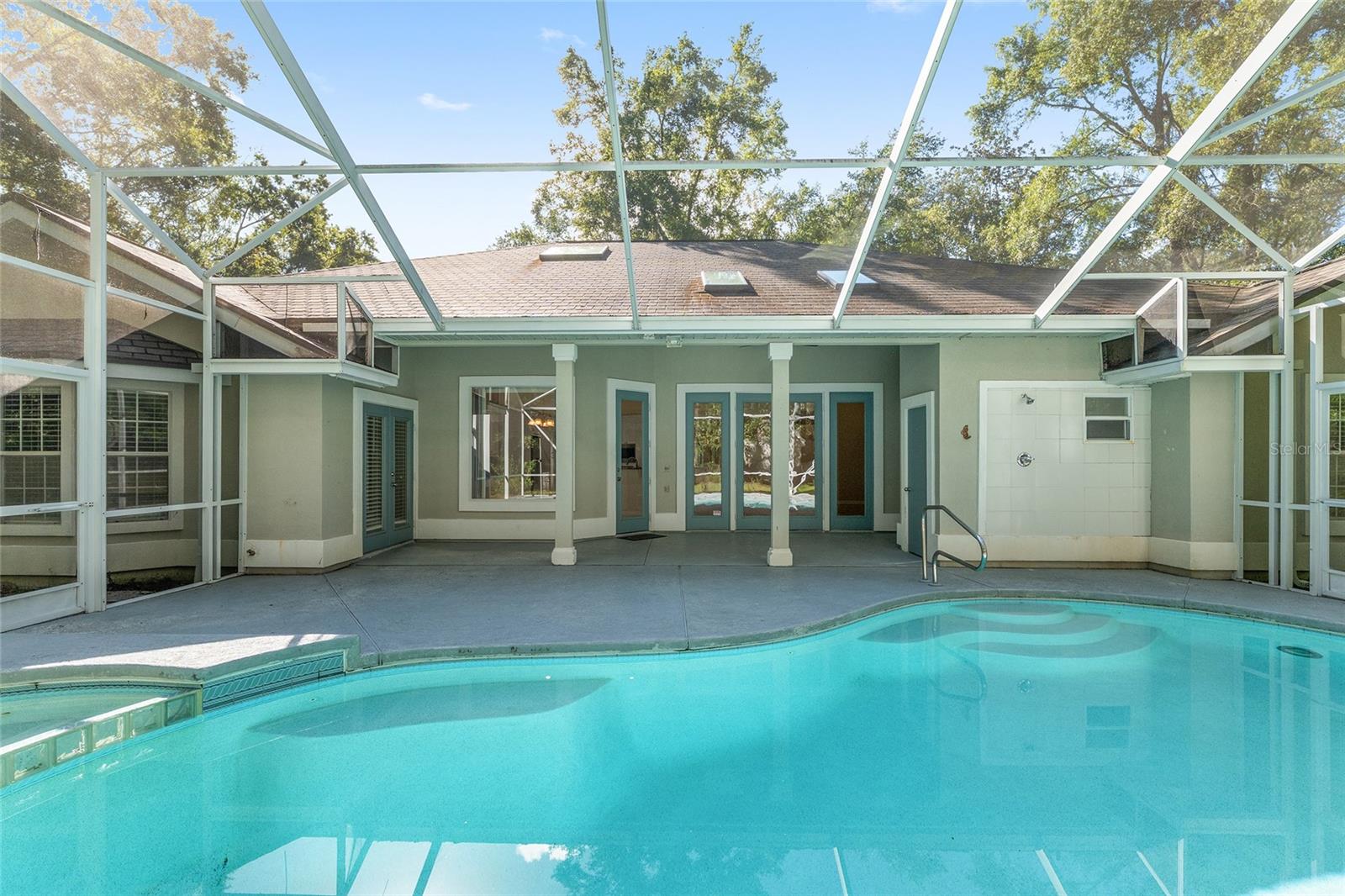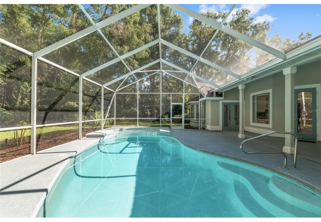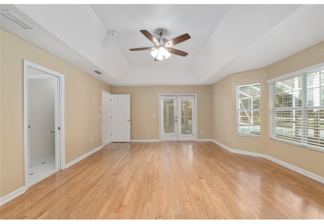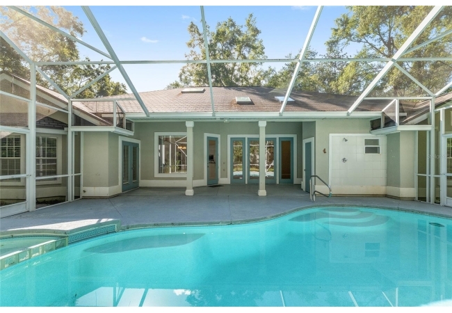The spacious master suite is a true retreat, complete with a bay window, tray ceiling, and French doors that open to the fully screened, heated pool and spa. The remodeled bathrooms and well-maintained interiors reflect pride of ownership throughout.